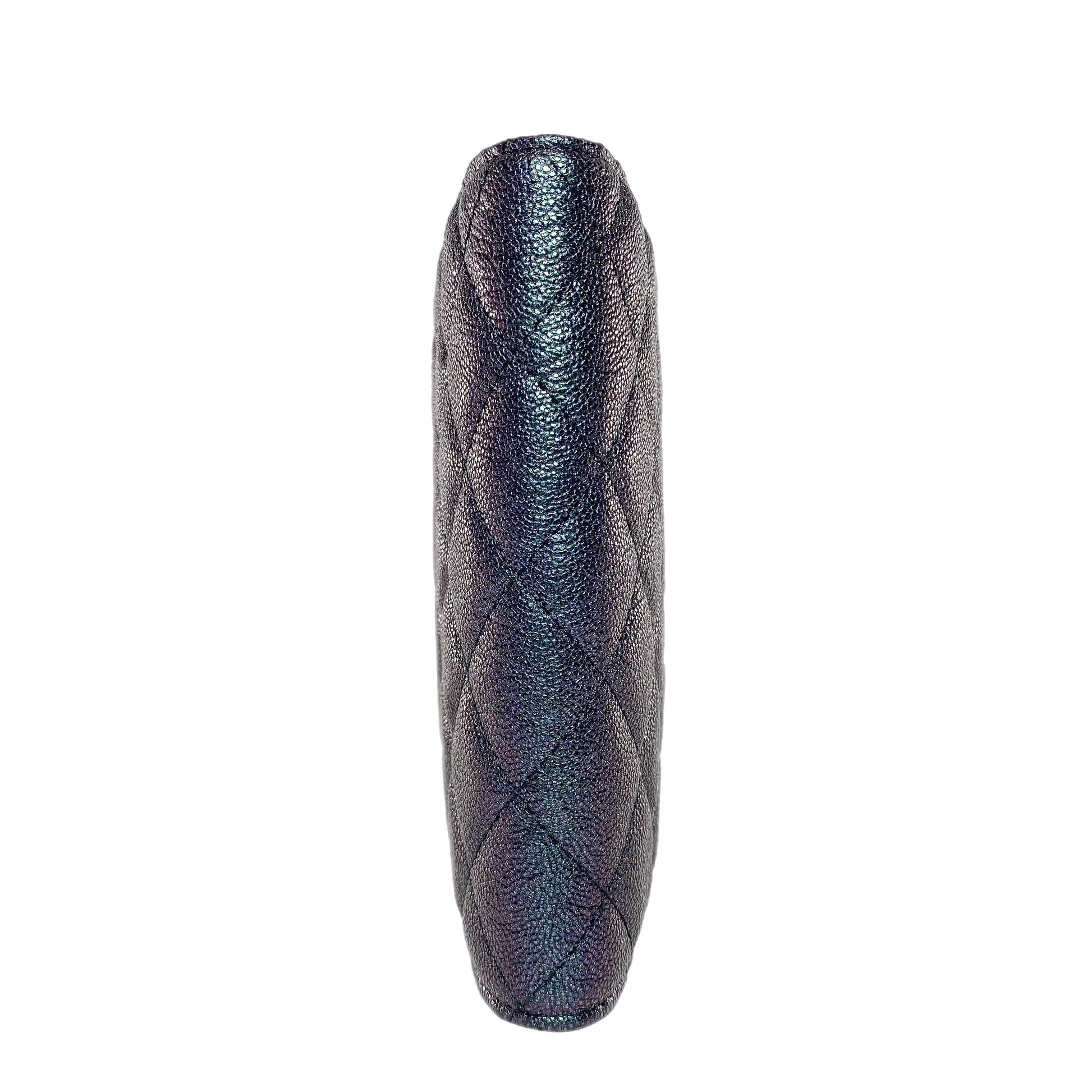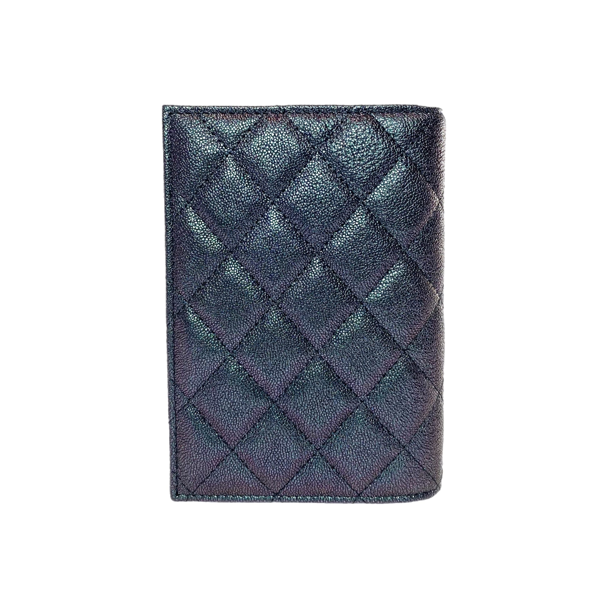 This is a Chanel Iridescent Purple Passport Cover in caviar leather with silver hardware. This stylish passport cover features a diamond quilted pattern and a CC on the front. The cover opens to an iridescent leather and black fabric lined interior that features patch pockets and card-slots. This is a stellar accessory for all travel occasions!