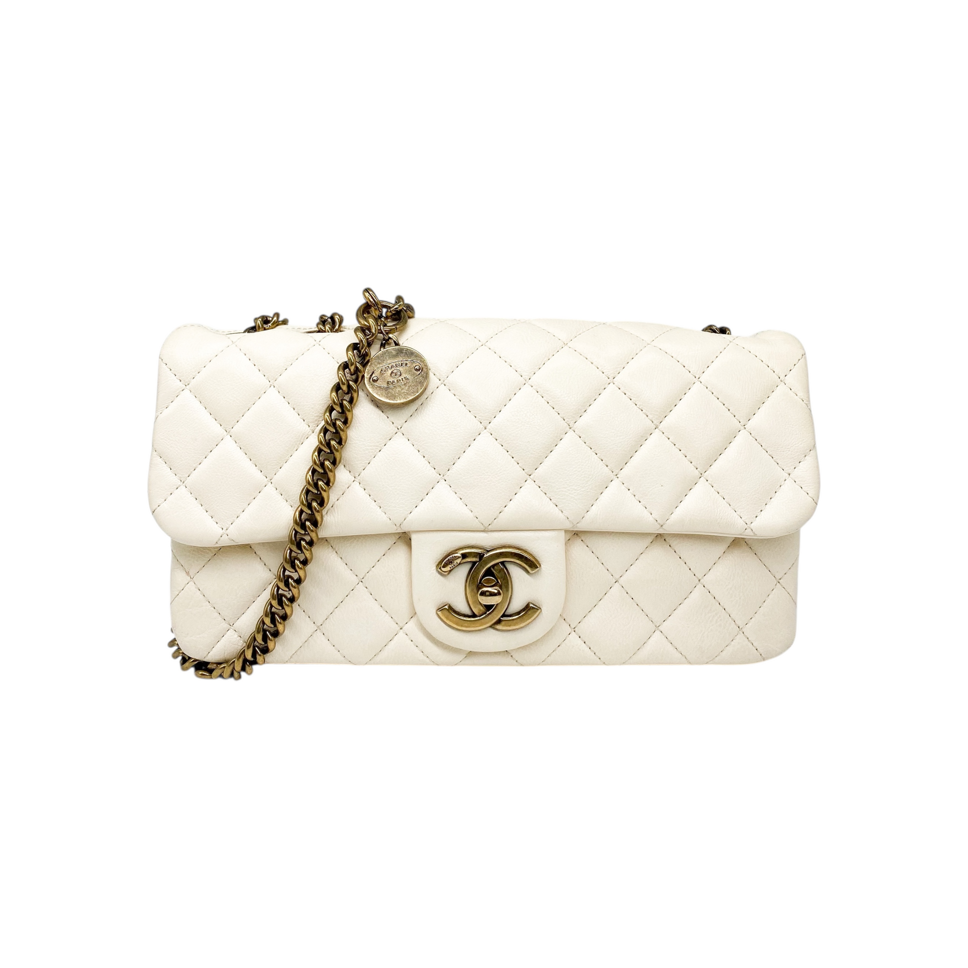 This is a Chanel Ivory Crown Flap Bag in calfskin leather with aged gold hardware. This chic flap bag features a strap, a rear zipper compartment, and a CC turn lock closure. The interior is lined in beige fabric. This is a wonderful handbag suitable for daytime and evening use!