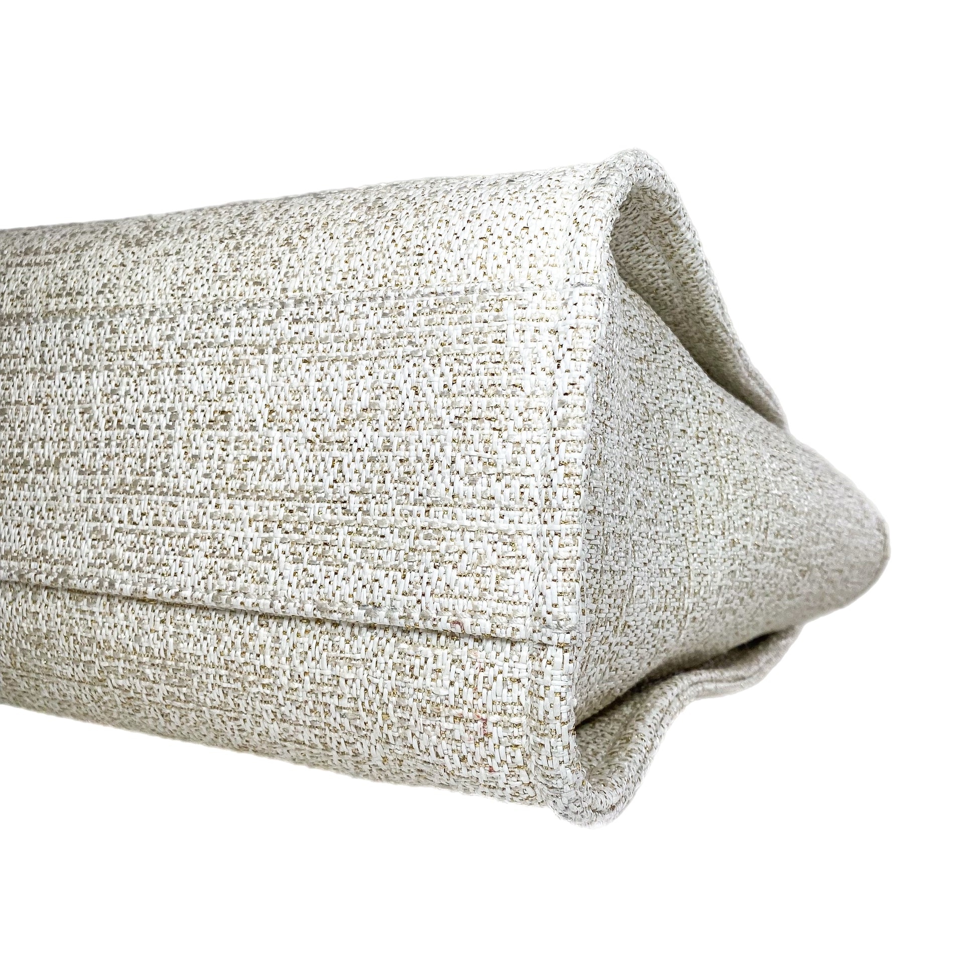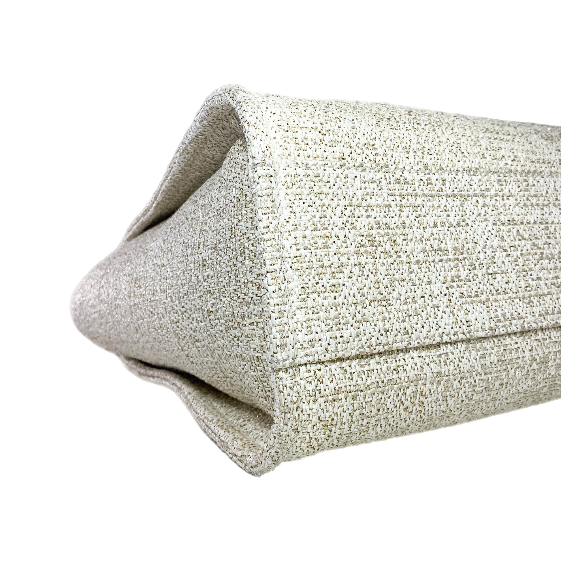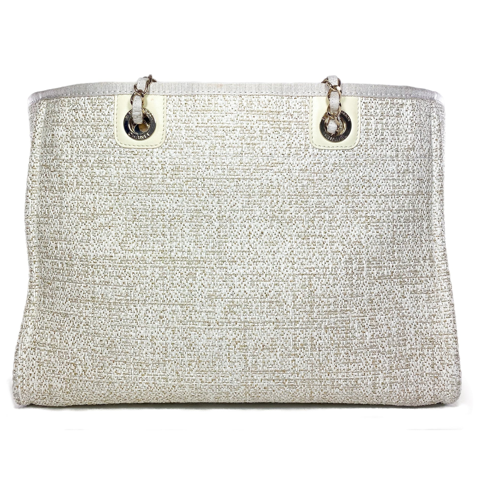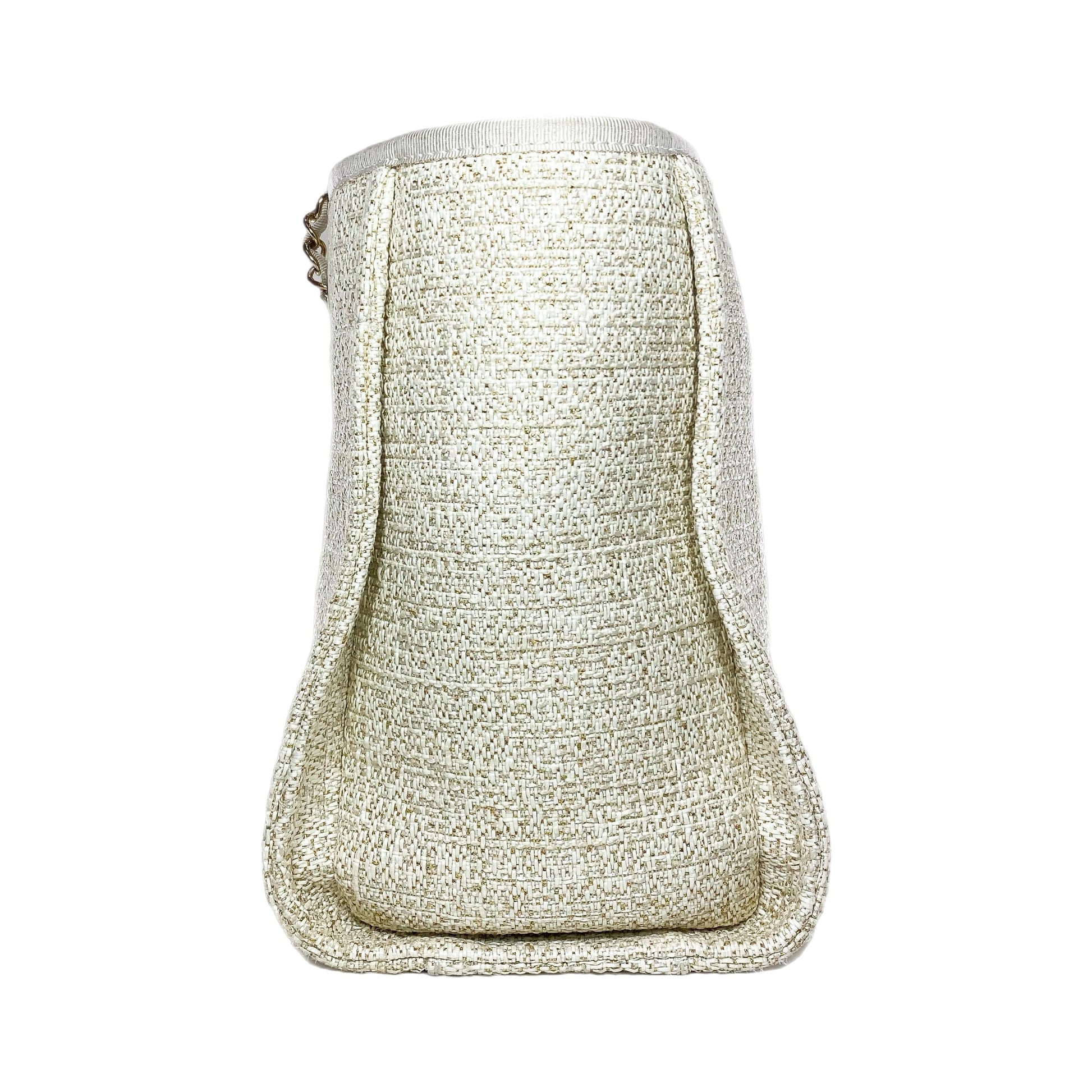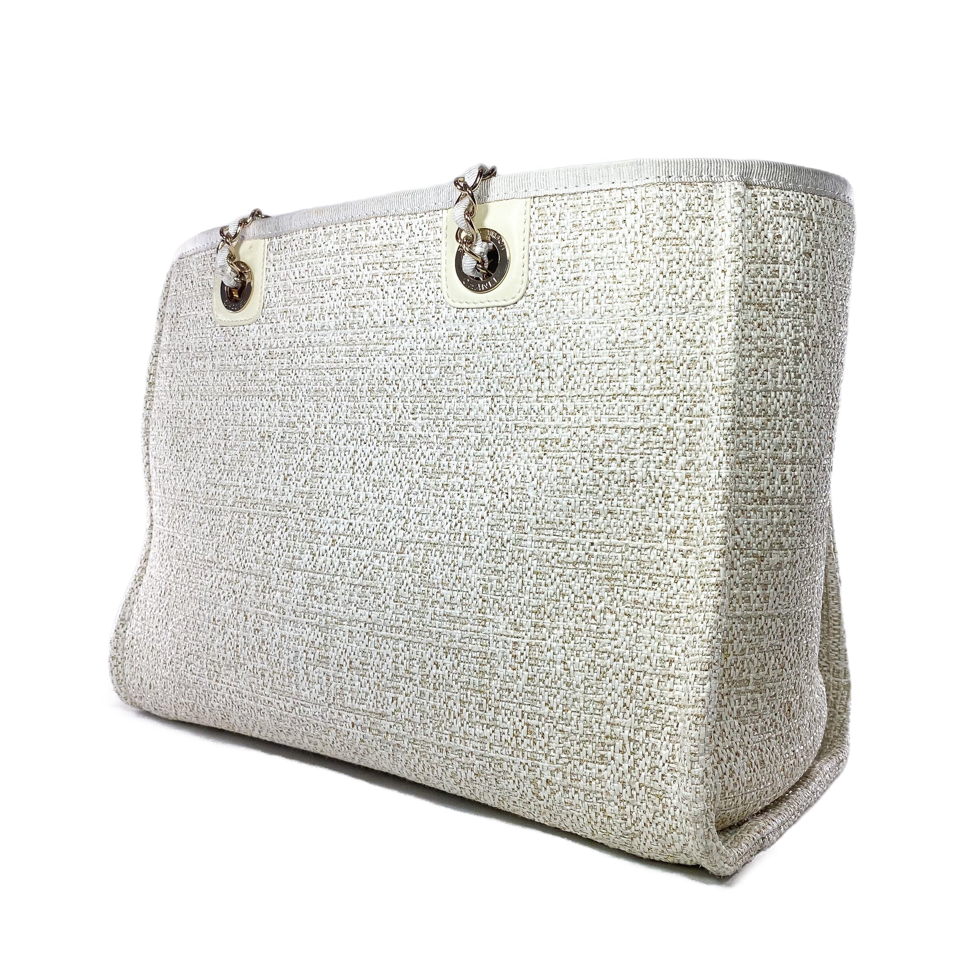 This is a Chanel Large Ivory Deauville in Lurex Boucle with gold hardware. This chic Deauville features two 10.5-inch top handles and a shimmery gold “Chanel 31 Rue Cambon Paris” logo. The top is open to a beige canvas lined interior that features two patch pockets and a zipper pocket. This is a stellar everyday handbag!
