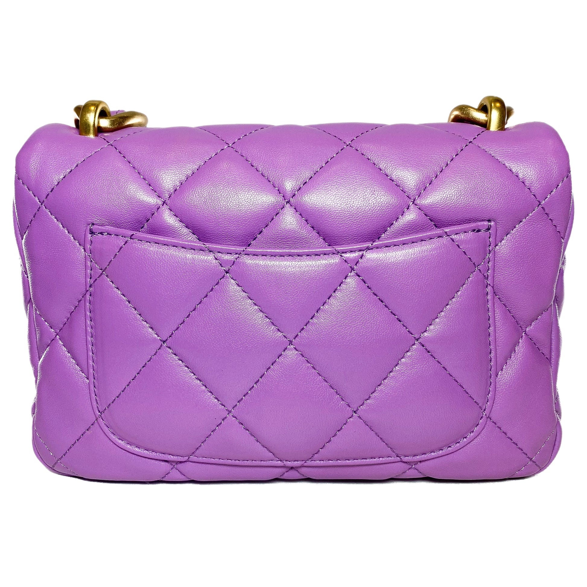 This is a Chanel Lavender Funky Town Flap Bag in lambskin leather with gold hardware. This stylish flap bag features a 12.5-inch strap, a rear exterior pocket, and a CC turn lock closure. The front flap opens to a lavender fabric lined interior that features a patch pocket and a zipper pocket. This is a stunning handbag for everyday use!