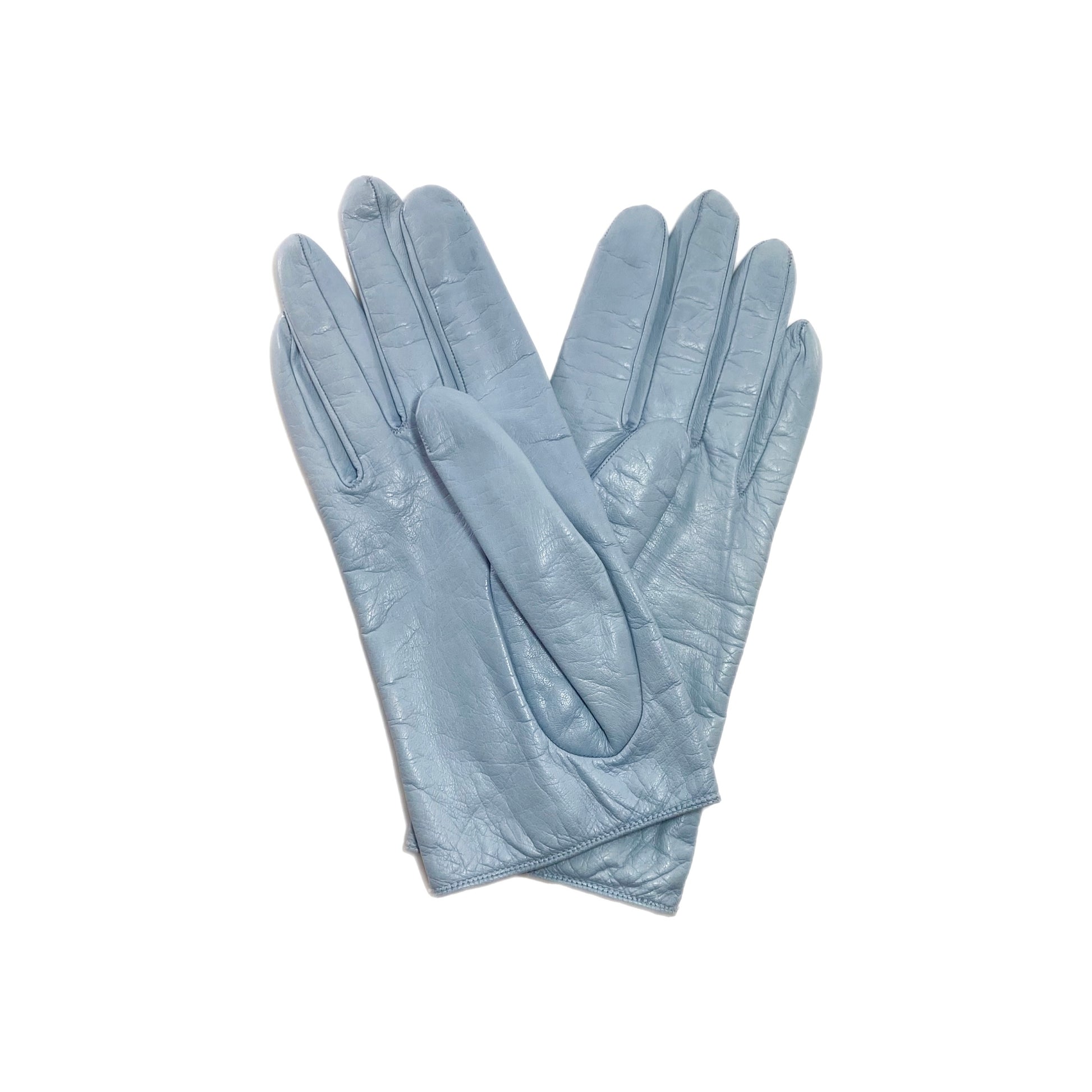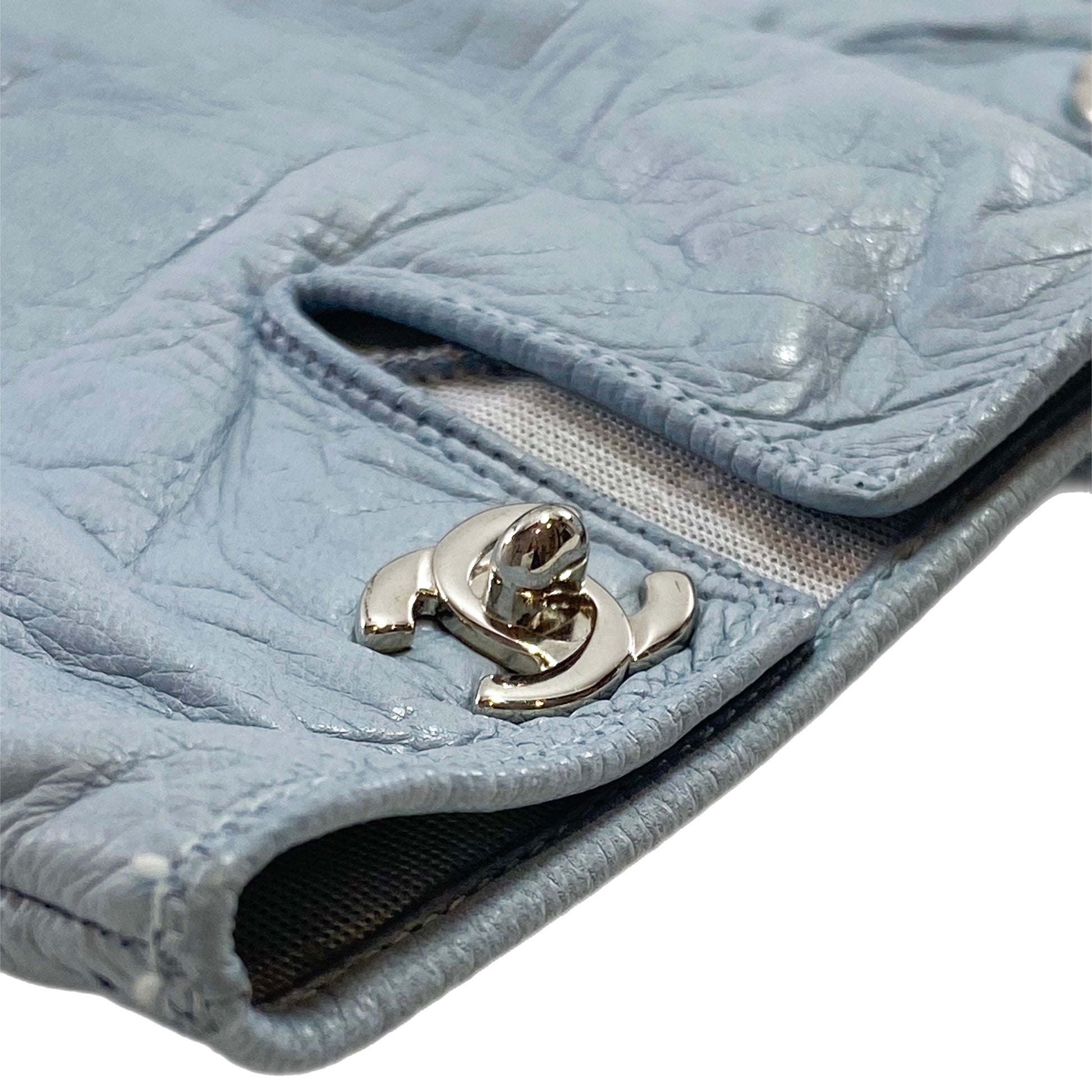 This is a pair of Chanel Light Blue Turn Lock Gloves in lambskin leather with silver hardware. These stylish Chanel gloves feature a smaller version of the iconic CC turn lock in silver hardware and are a size 7.5. These are the perfect pair of gloves for the cooler months and for a pop of color!
