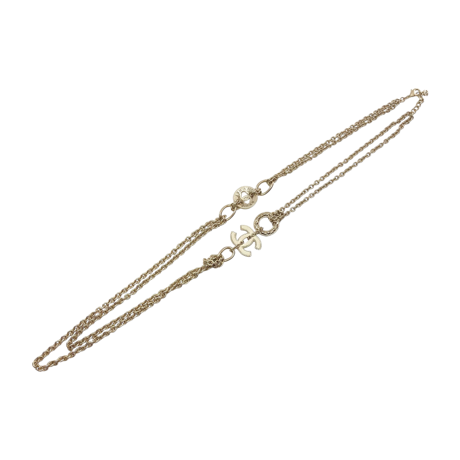 This is a Chanel Light Gold Double Chain Long Necklace. This is an amazing accessory for any outfit!