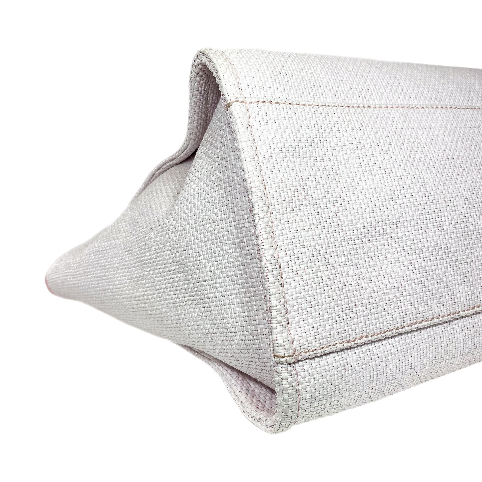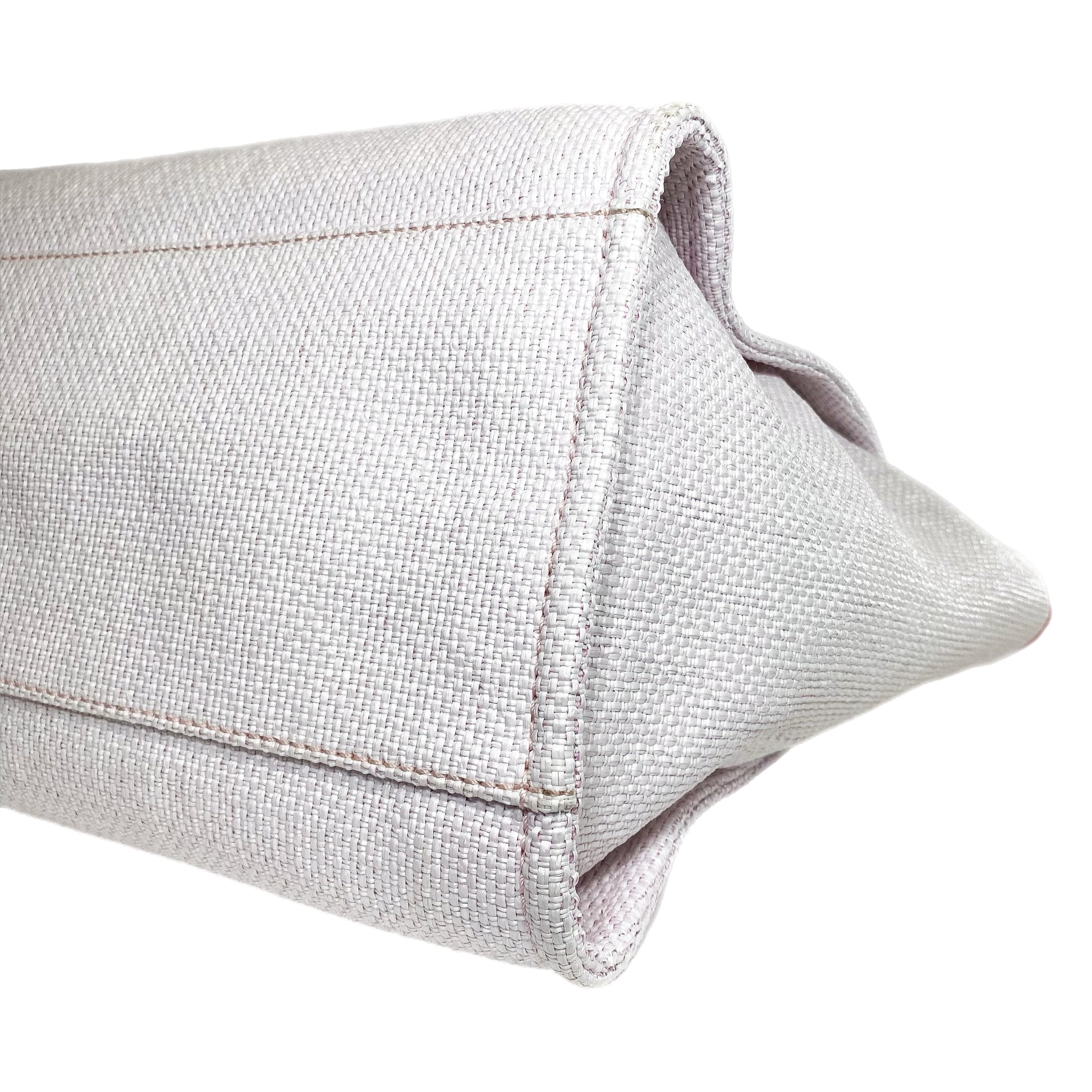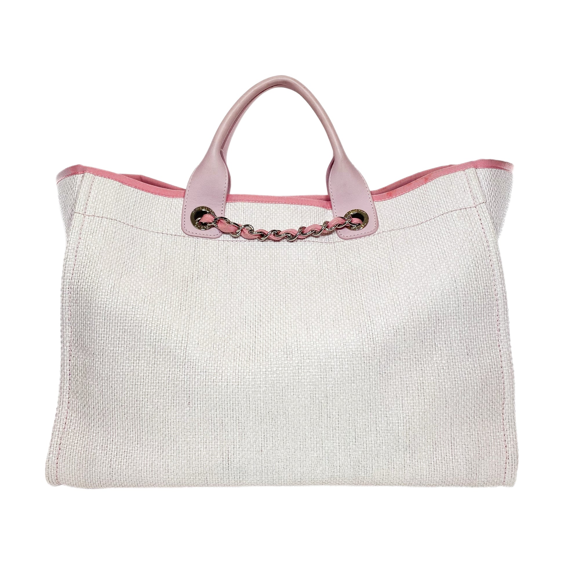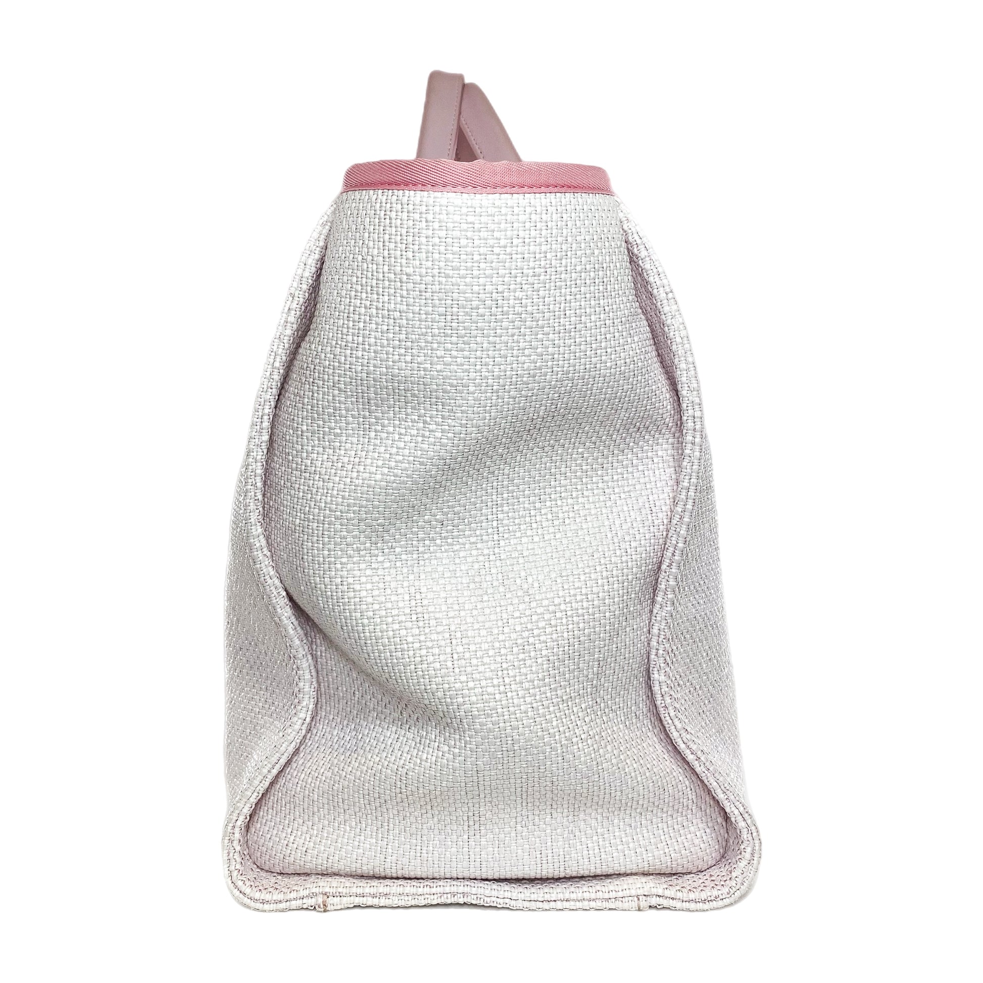This is a Chanel Light Pink Medium Deauville in canvas tweed with silver hardware. This chic Deauville features two 4.5-inch leather top handles, two 11-inch shoulder straps, and a pink “Chanel 31 Rue Cambon Paris” logo. The top is open to a pink canvas lined interior that features two patch pockets and a zipper pocket. This is a stellar tote bag for a subtle pop of color!