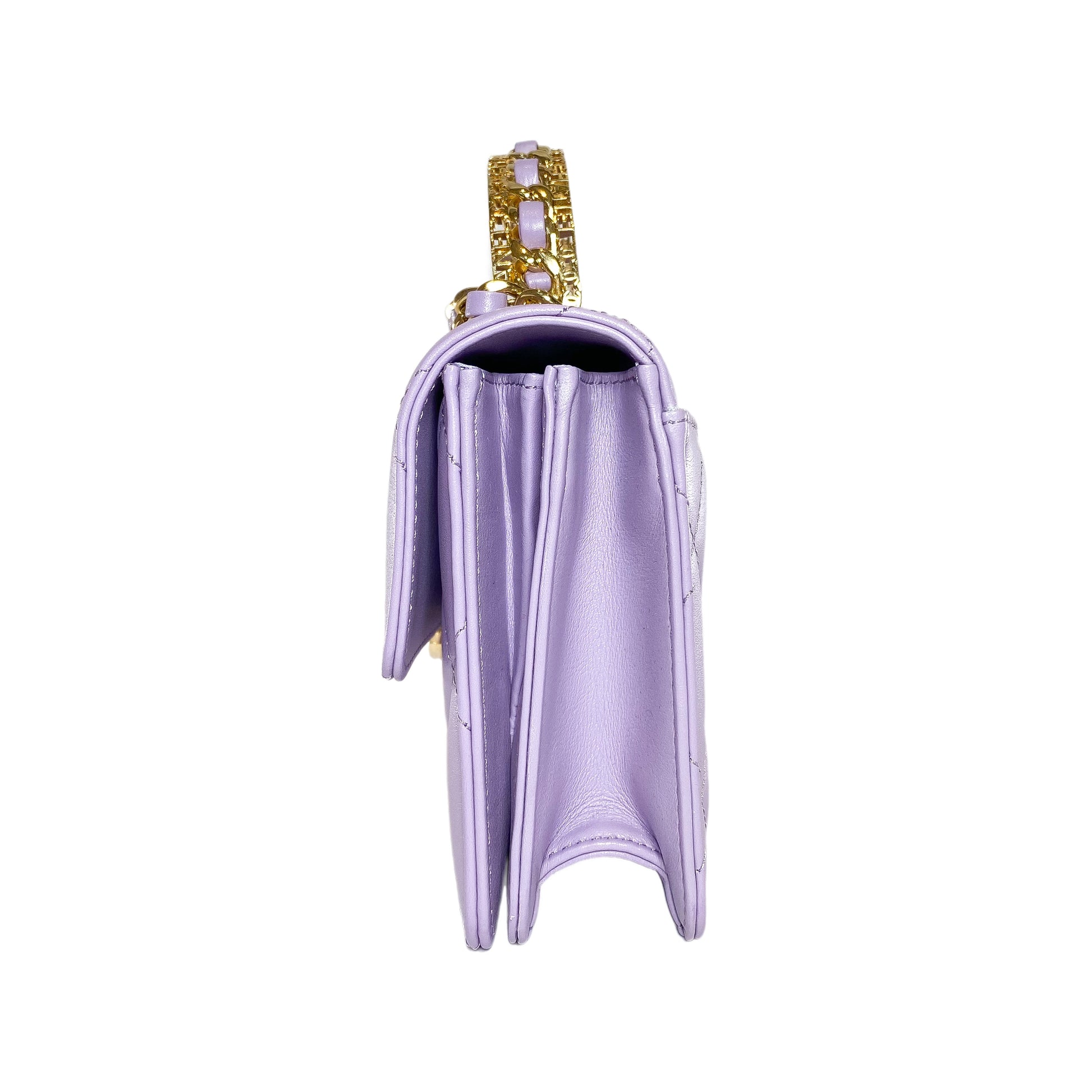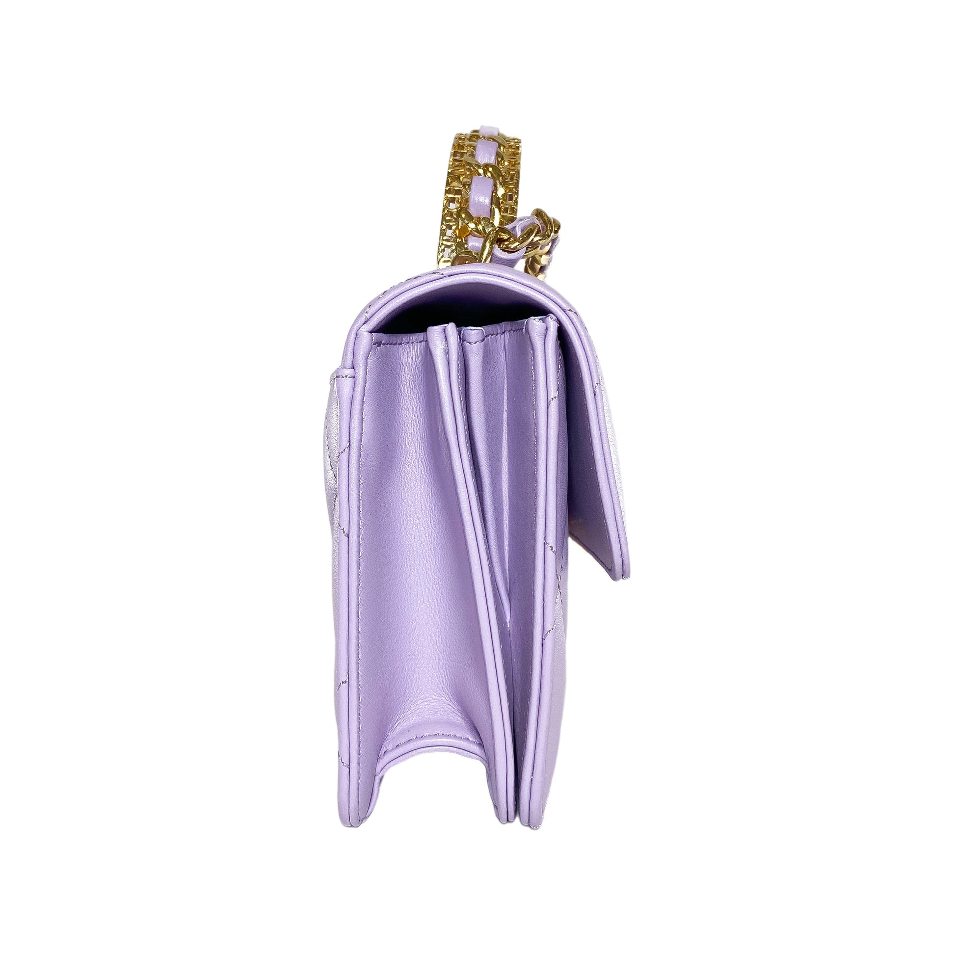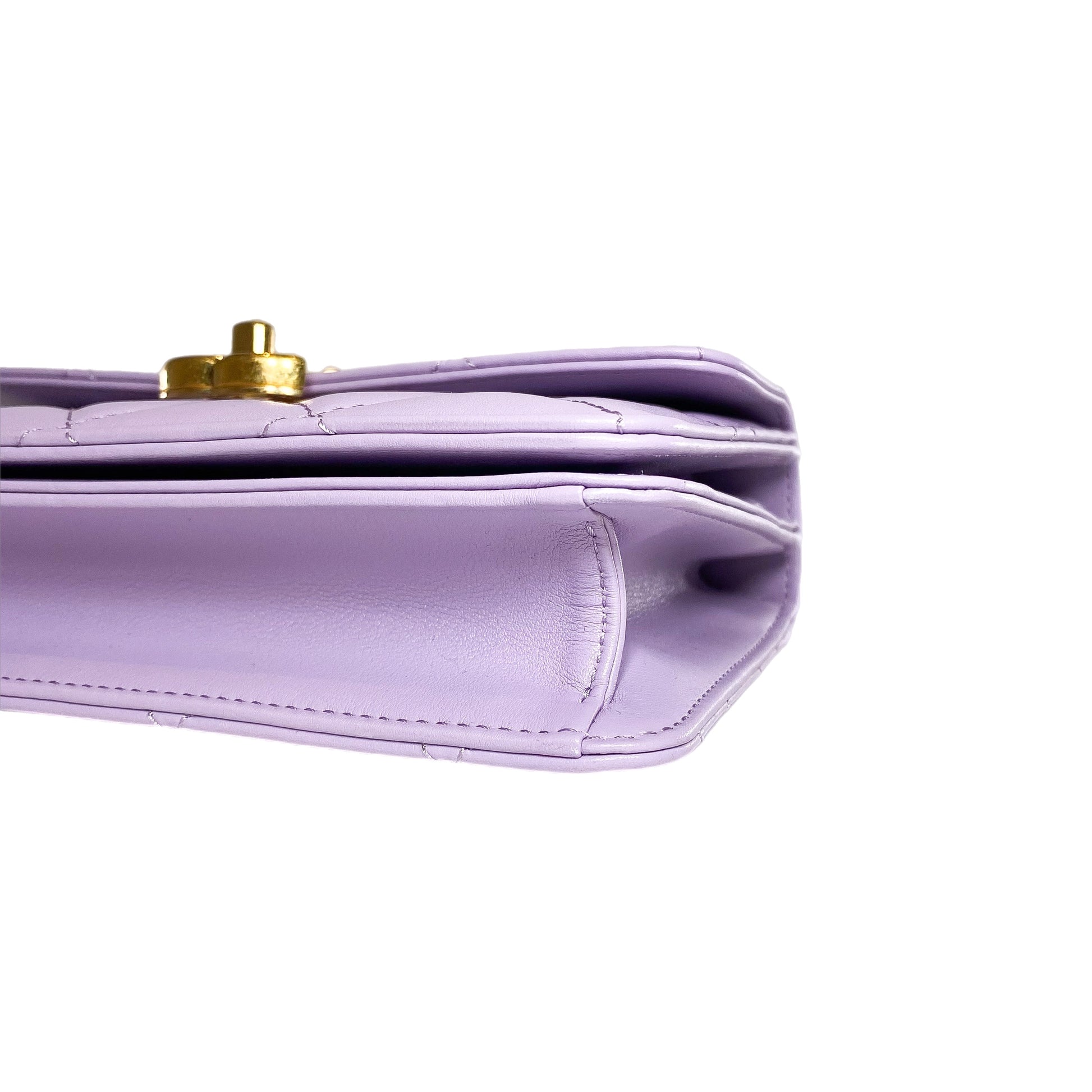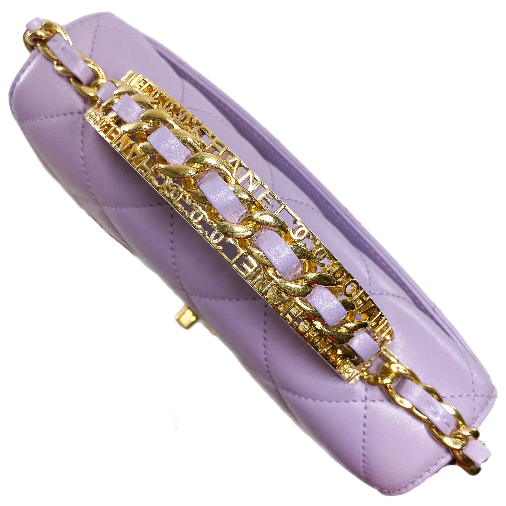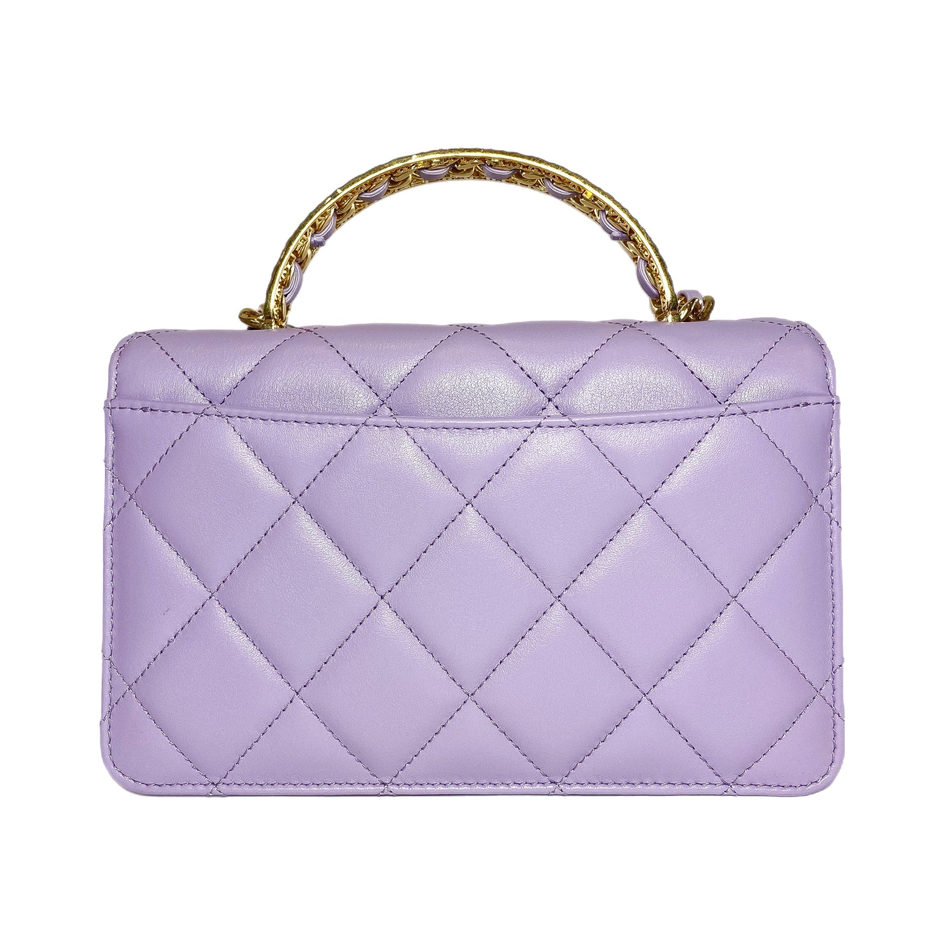 This is a Chanel Light Purple Mini Top Handle Flap Bag in lambskin leather with gold hardware. This chic handbag features a 2-inch top handle, a 21.5-inch strap, a rear pocket, and a CC turn lock closure. The front flap opens to a partitioned leather lined interior that features a patch pocket. This is a stellar handbag for any occasion!