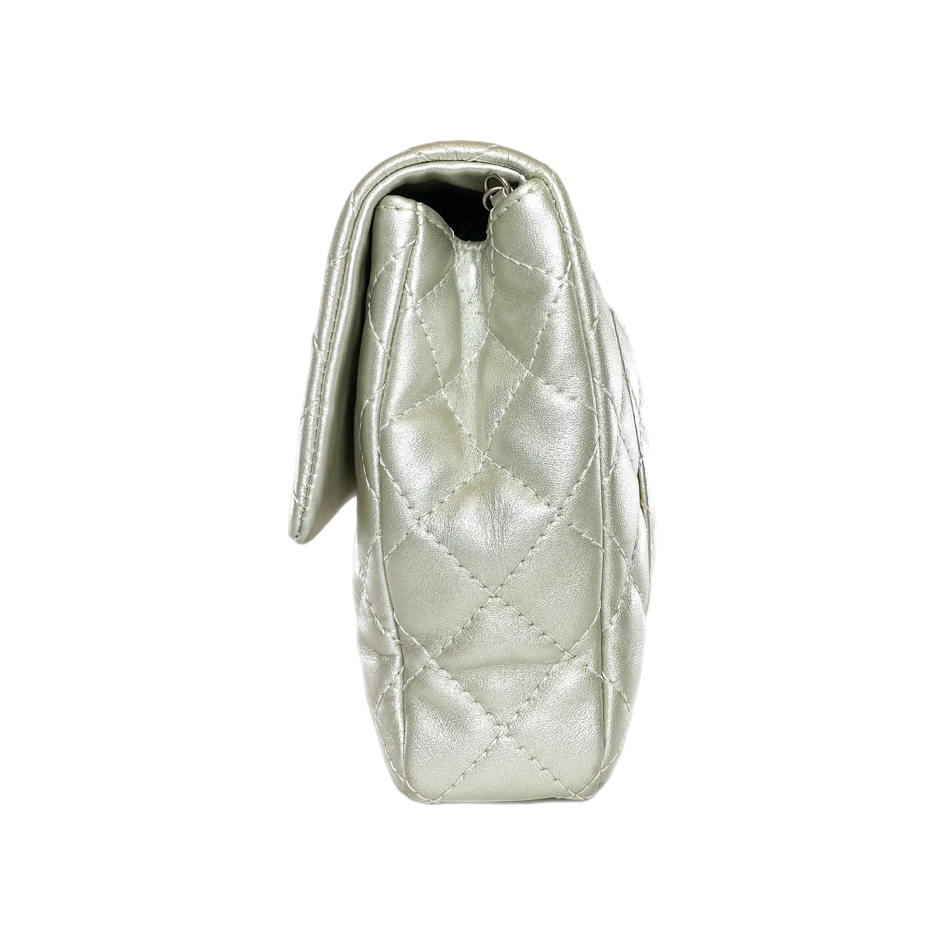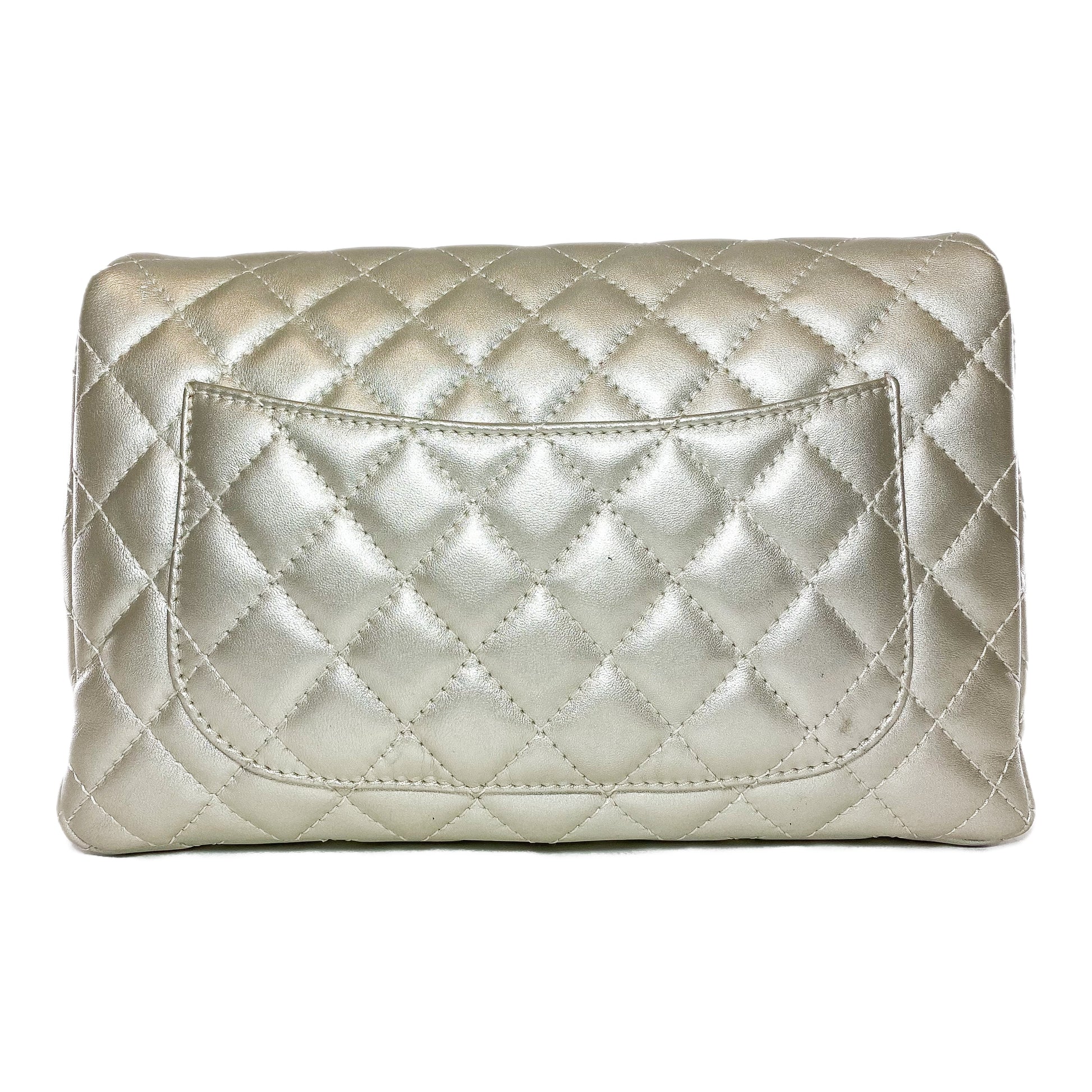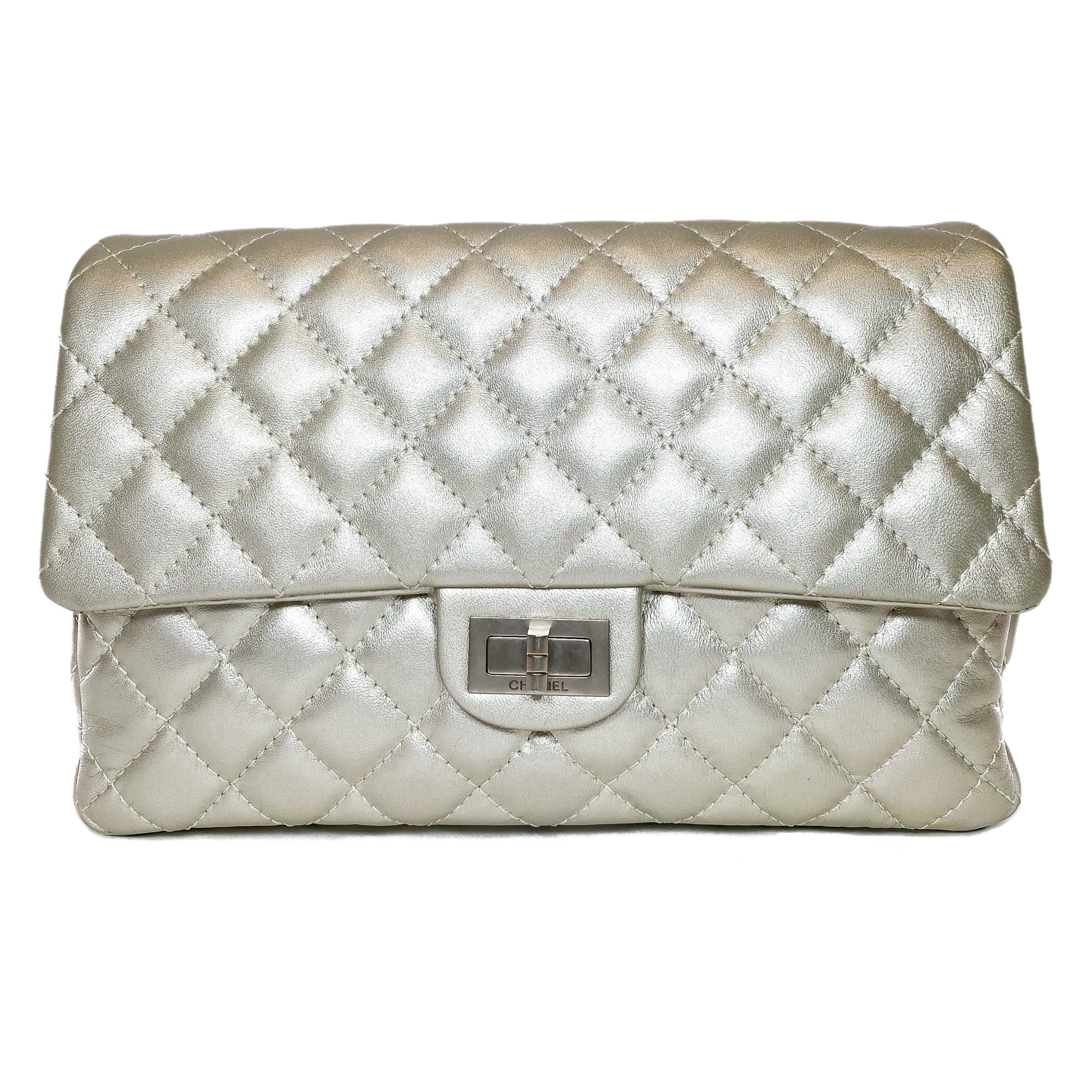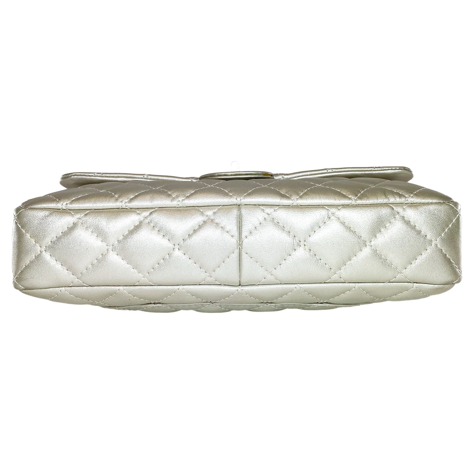 This is a Chanel Metallic Light Gold Reissue Flap Bag in lambskin leather with silver hardware. This chic Reissue features a 15-inch strap, a rear pocket, and a turn lock closure. The front flap opens to a light gold leather lined interior that features a patch pocket and a zipper pocket. This is an amazing handbag for any occasion!