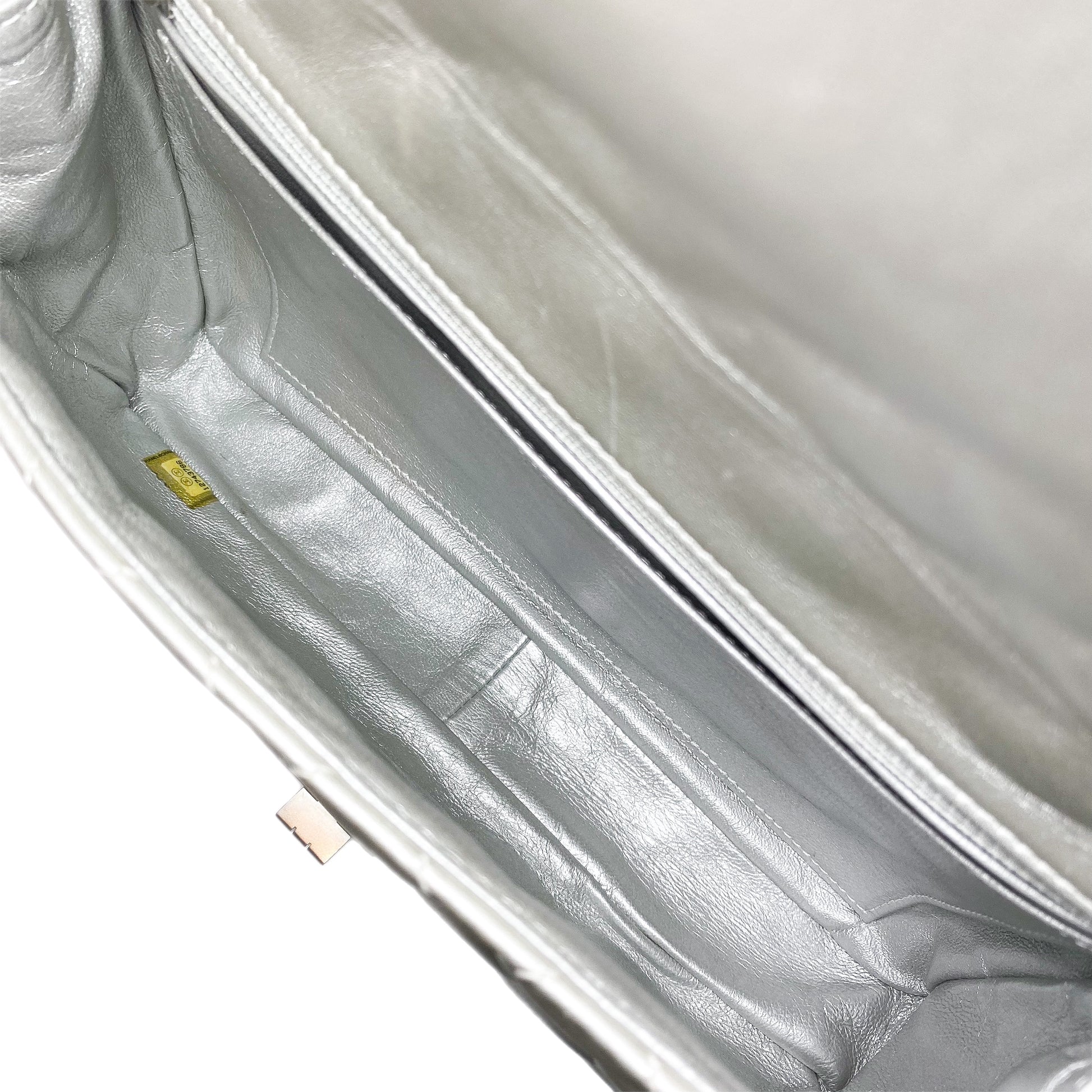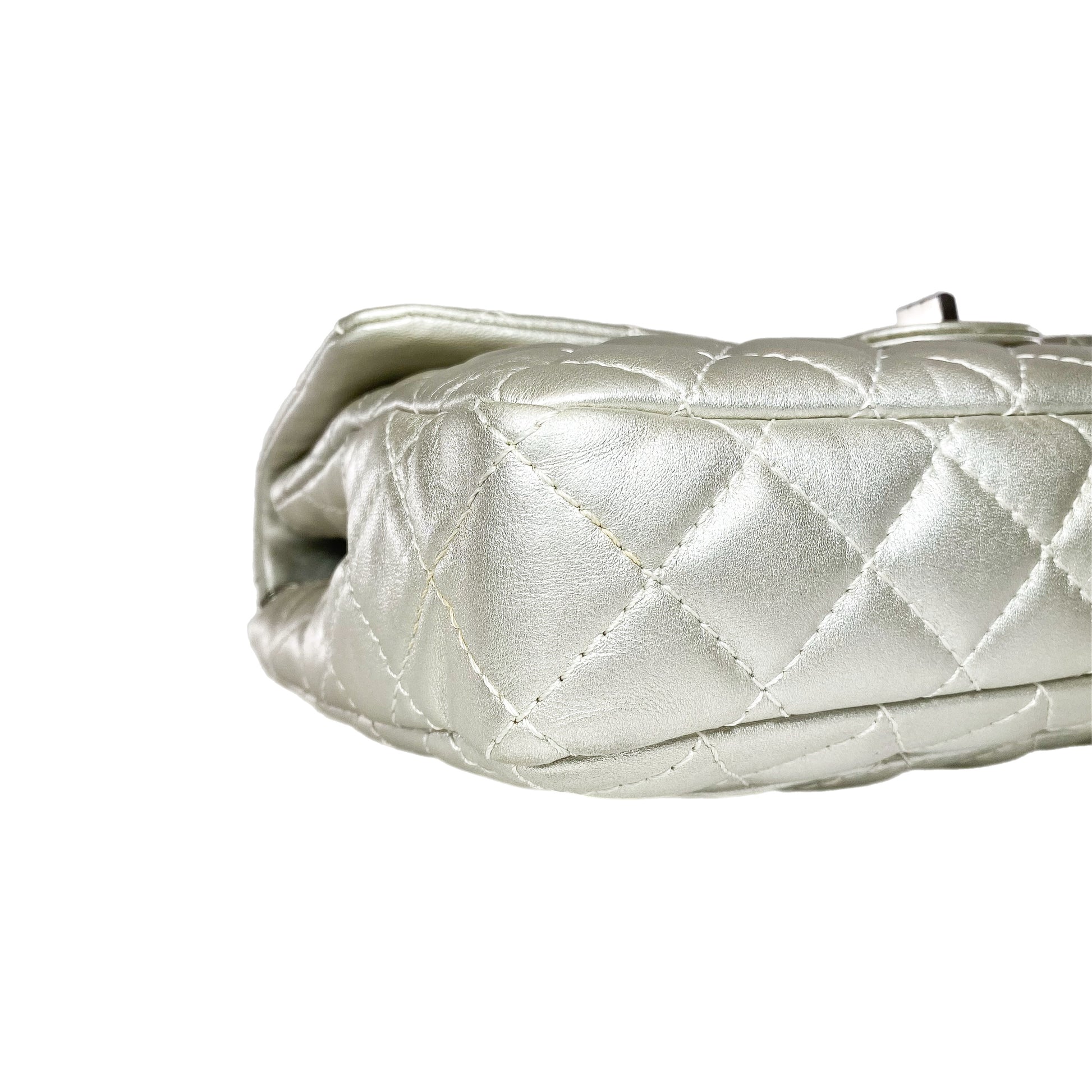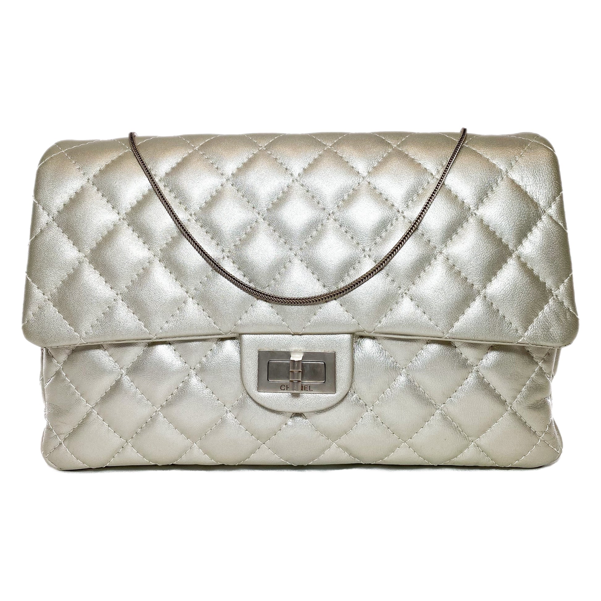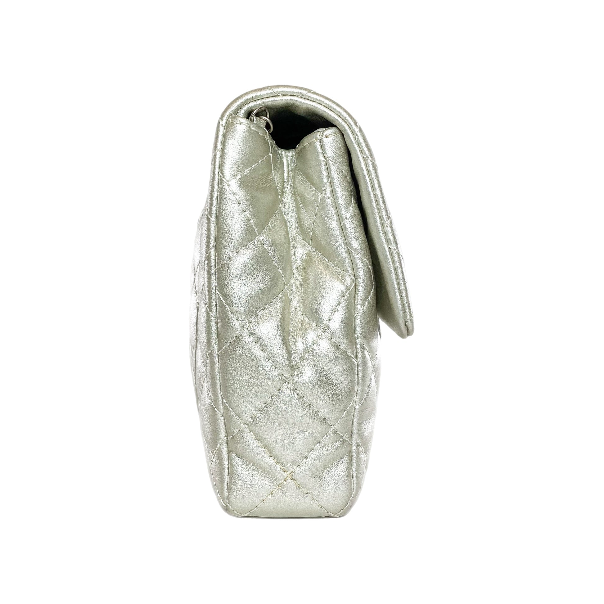 This is a Chanel Metallic Light Gold Reissue Flap Bag in lambskin leather with silver hardware. This chic Reissue features a 15-inch strap, a rear pocket, and a turn lock closure. The front flap opens to a light gold leather lined interior that features a patch pocket and a zipper pocket. This is an amazing handbag for any occasion!