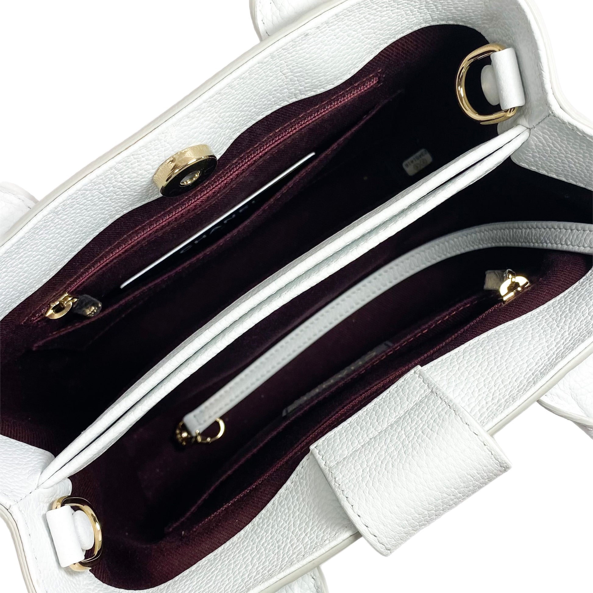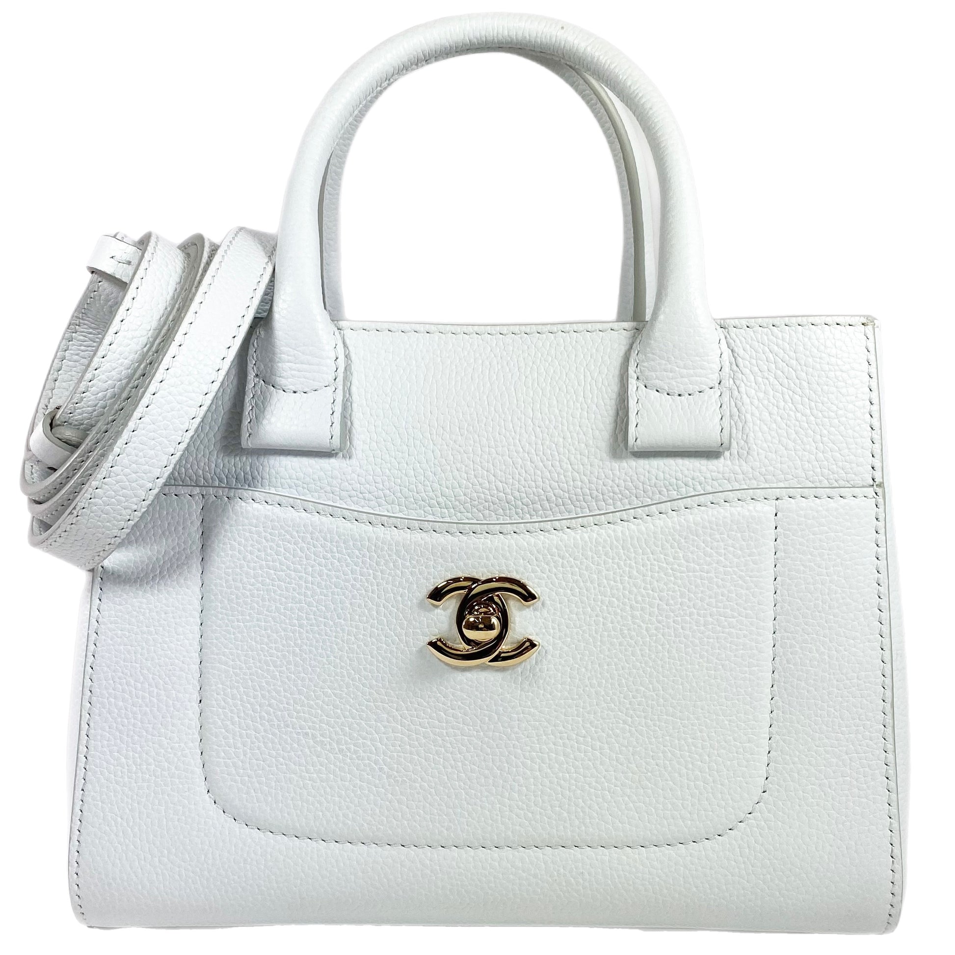 This is a new, Mini White Chanel Neo Executive Shopper Tote in grained calfskin leather with polished light gold hardware. This sophisticated shopper tote has two rolled leather top handles, a front and rear pocket, and a removable and adjustable strap. The interior is lined with burgundy fabric and features a central pocket along with two zipper pockets and two patch pockets. This is a timeless bag and perfect for year round use!