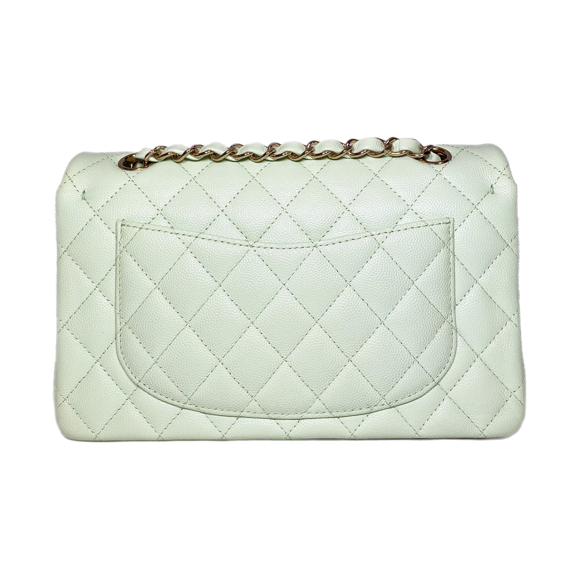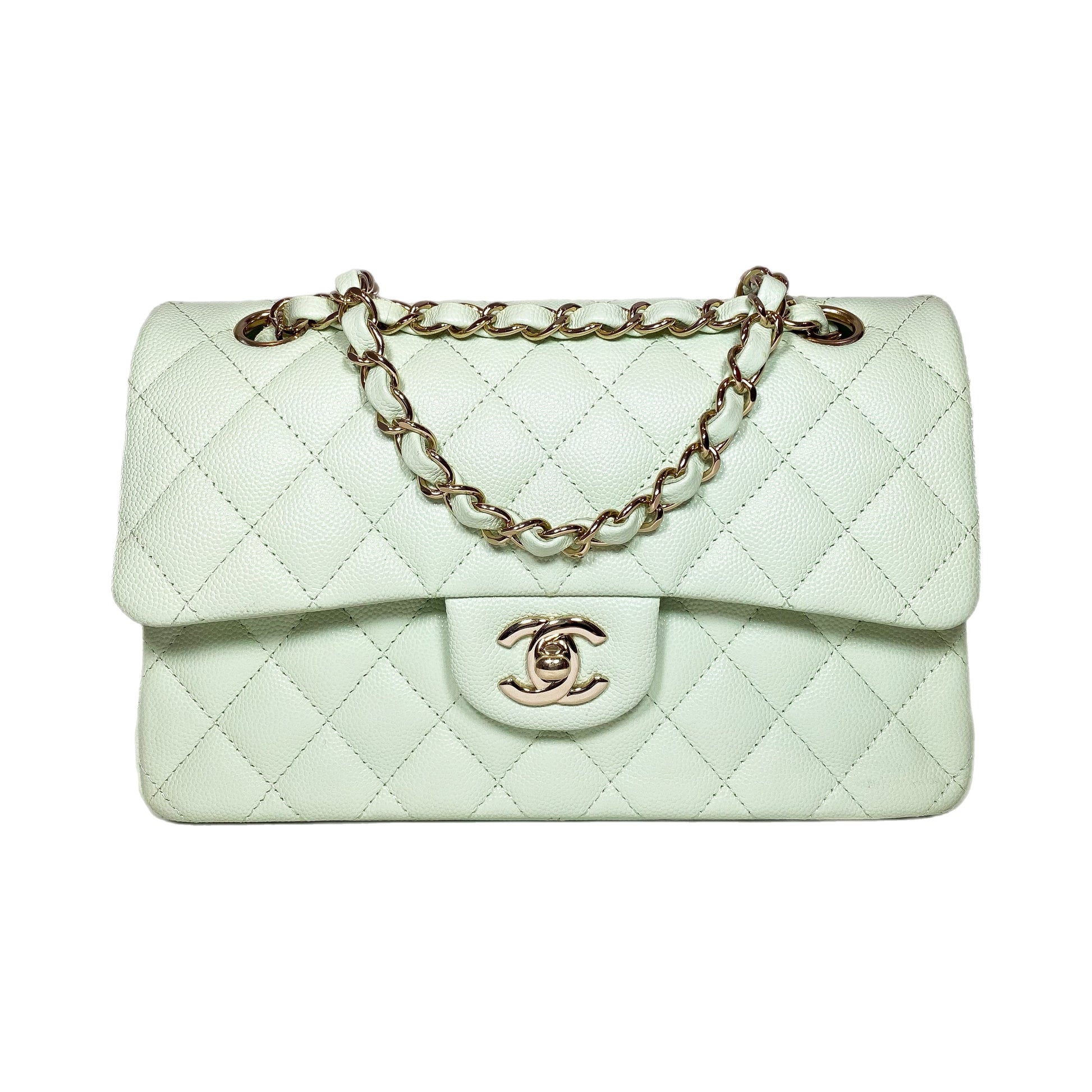 This is a Chanel Mint Small Double Flap Bag in caviar leather with light gold hardware. This stylish flap bag features a 17-inch strap, a rear exterior pocket, and a CC turn lock. The front flap opens to a mint leather lined interior that features two patch pockets. This is a stellar shoulder bag for a subtle pop of color!