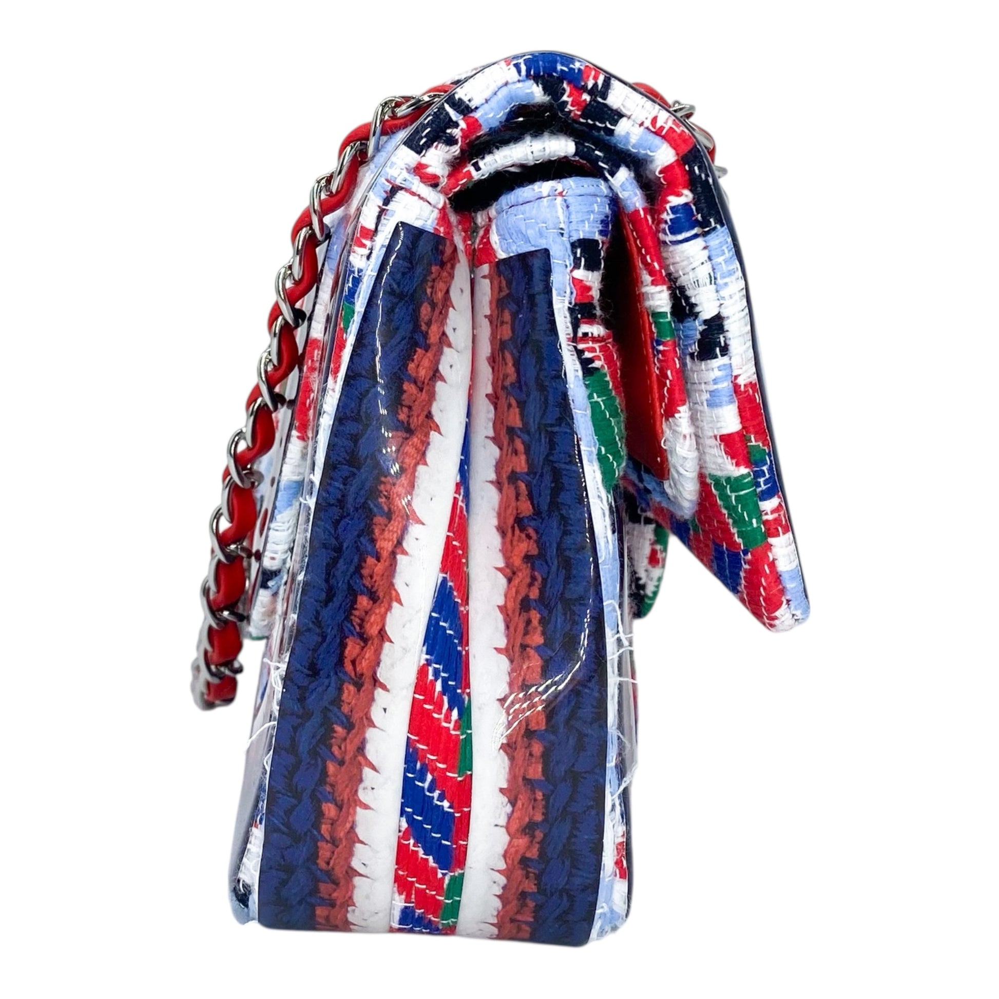 This is a Chanel Multicolor Airplane Double Flap Bag in tweed and silicone with silver hardware. This amazing flap bag features a strap, a rear pocket, and a CC turn lock. The front flap opens to a red leather lined interior that features two patch pockets. This is a wonderful handbag for any occasion!