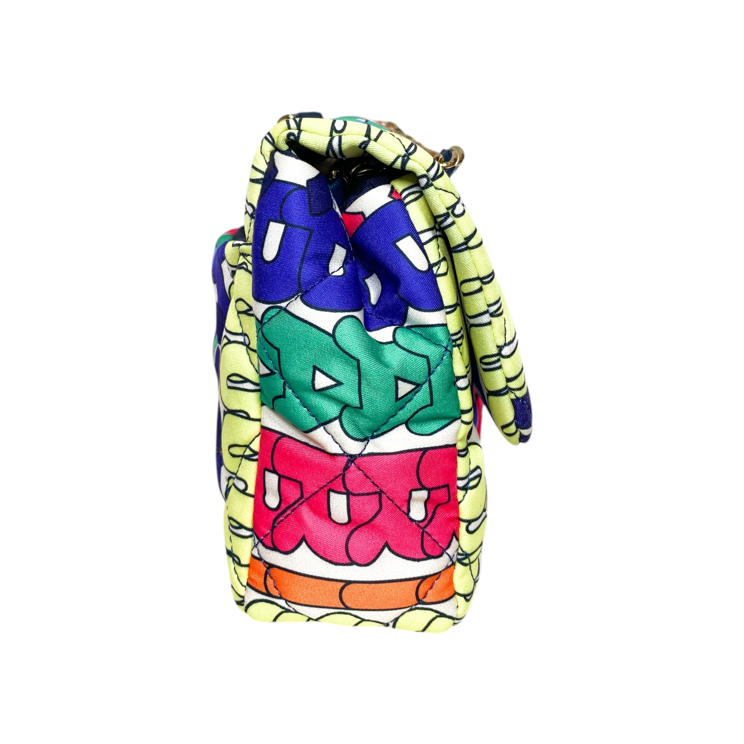 This is a Chanel Multicolor Printed Flap Bag in silk with gold hardware. This fashionable flap bag features a 19-inch strap, a rear pocket, and a CC turn lock. The interior is lined in navy fabric and features a patch pocket and a zipper pocket. This is an amazing flap bag to add to your collection!