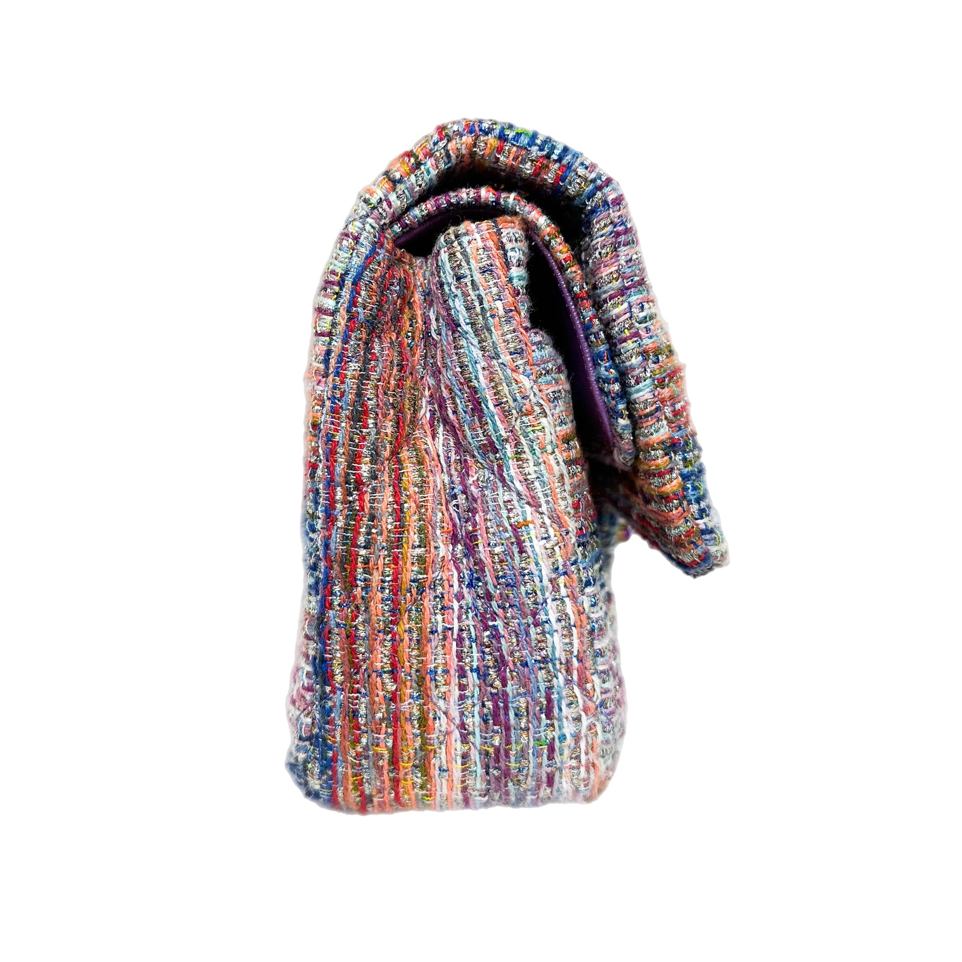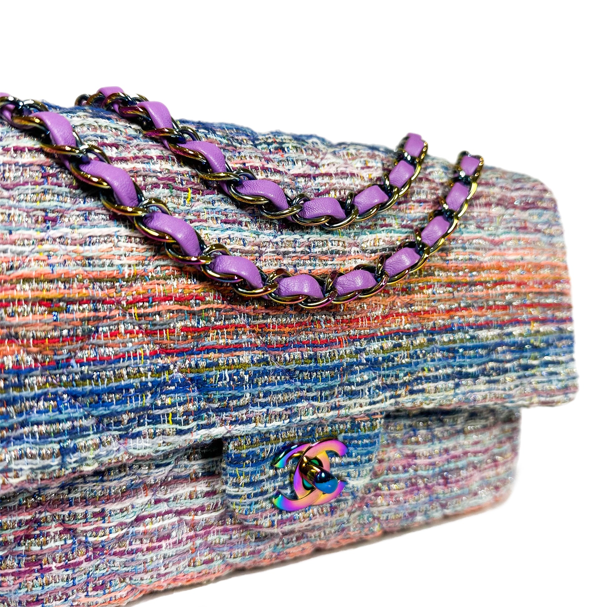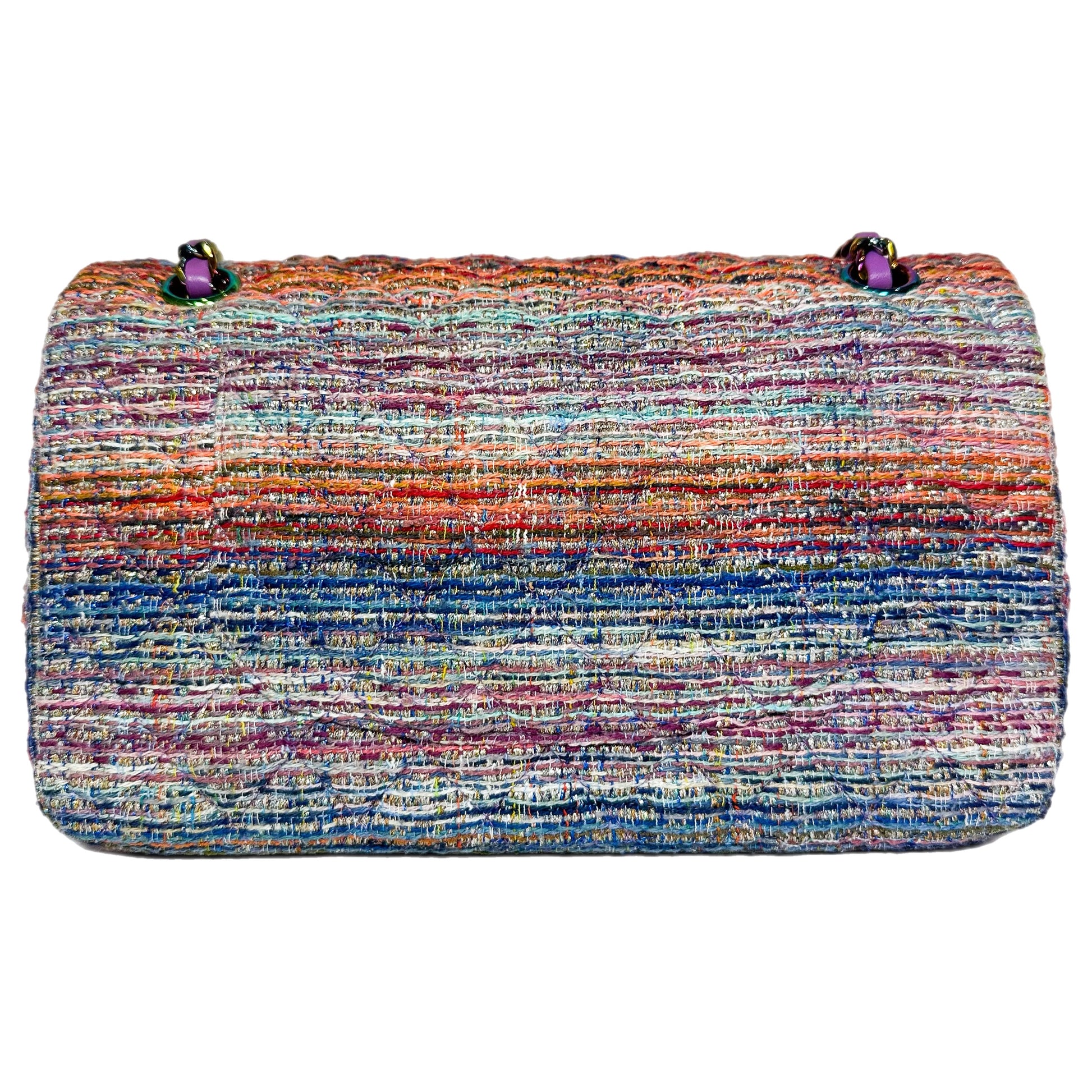 This is a Chanel Multicolor Rainbow Chain Double Flap Bag in tweed with rainbow hardware. This chic double flap features a 17-inch strap, a rear pocket, and a CC turn lock. The front flap opens to a purple leather lined interior that features two patch pockets. This is an amazing handbag for many occasions!