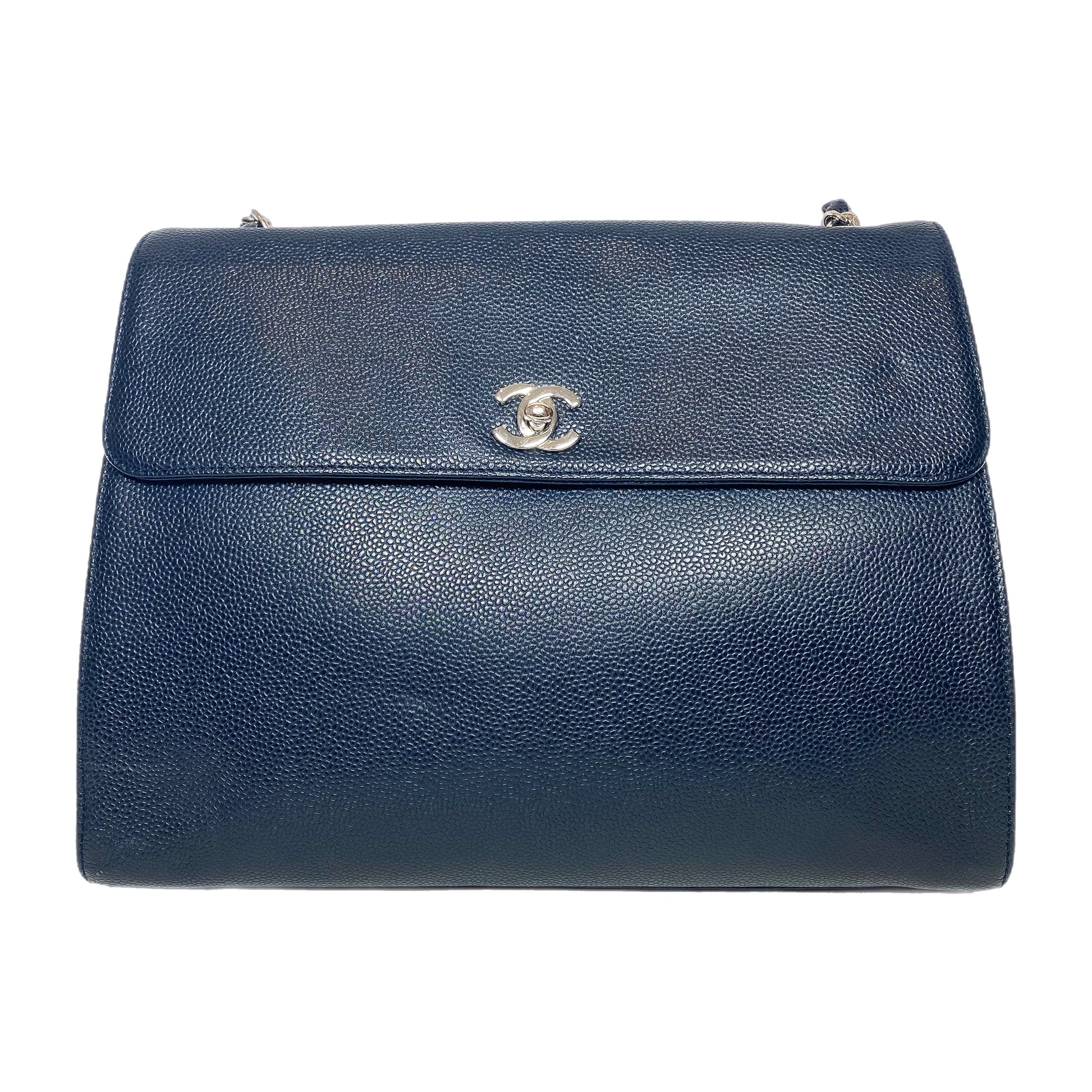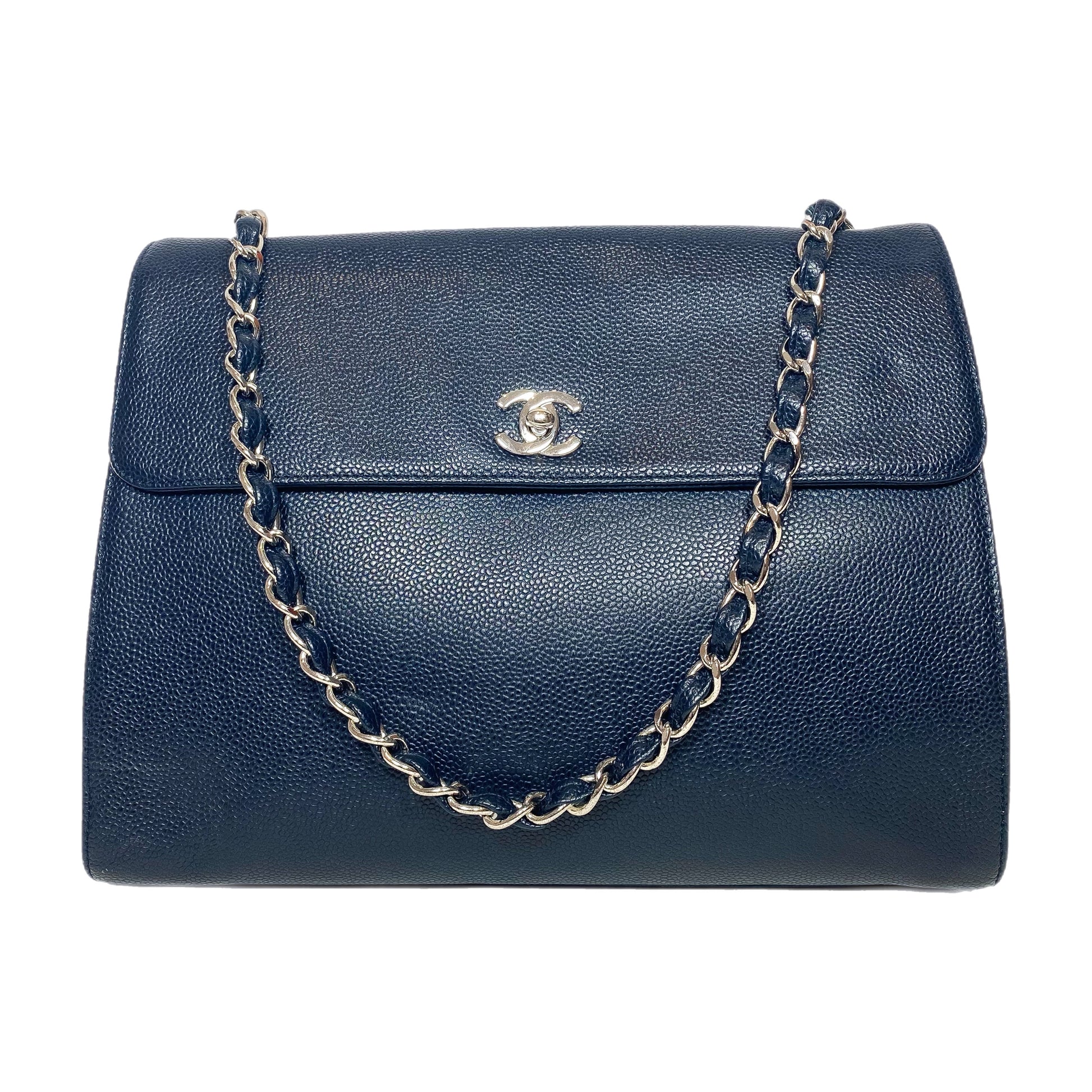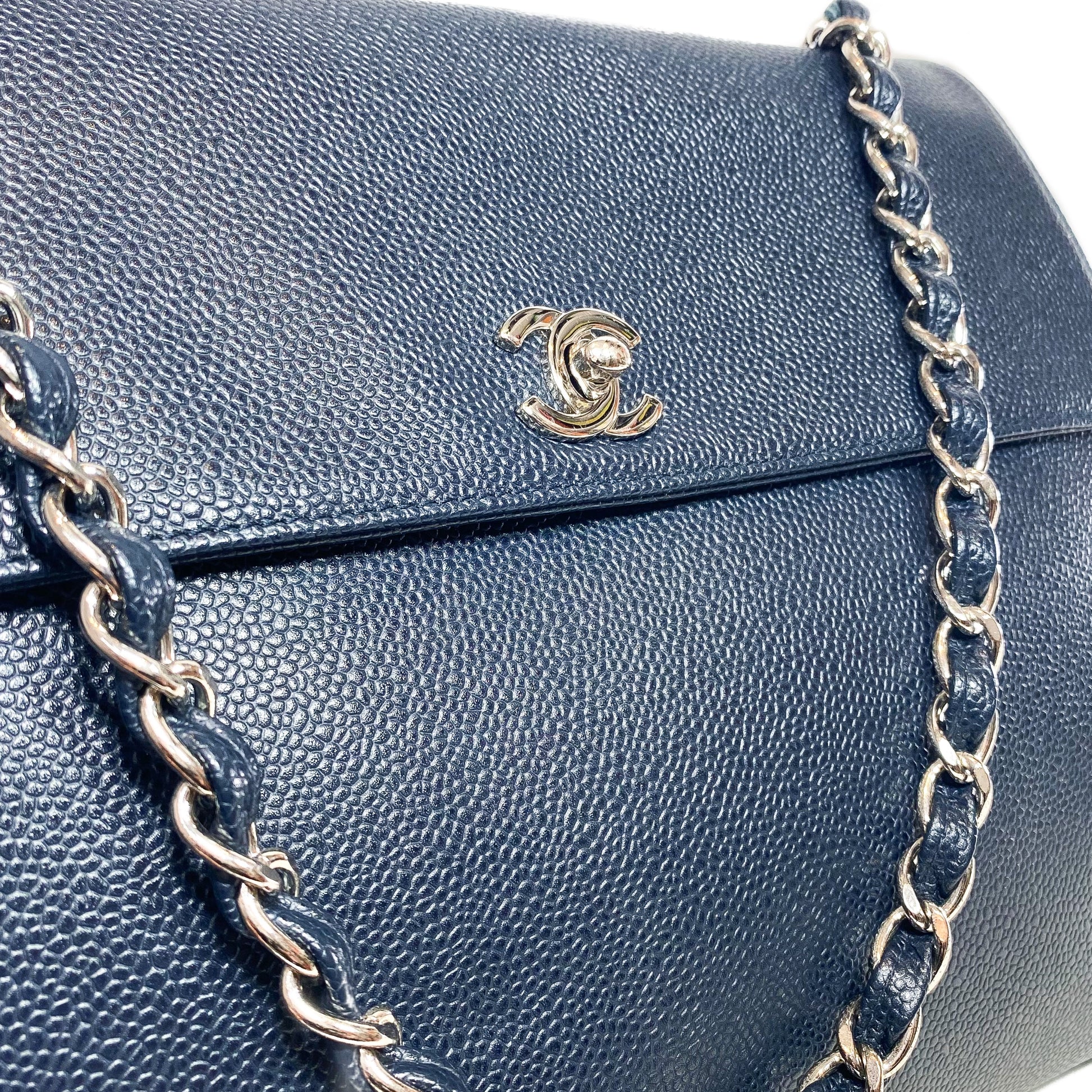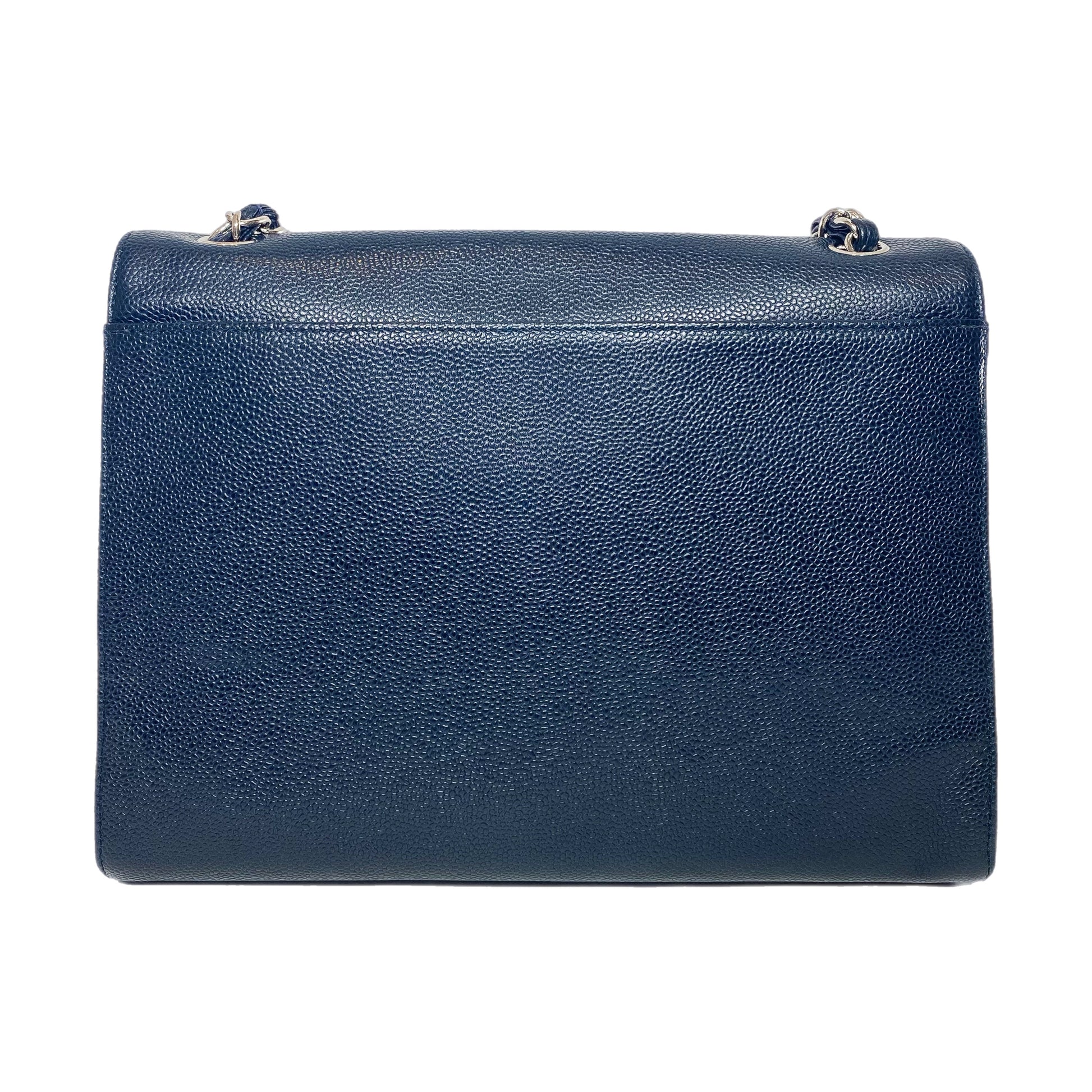 This is a Chanel Navy Flap Shoulder Bag in caviar leather with silver hardware. This stylish shoulder bag features a 8.75-inch strap, a rear exterior pocket, and a turn lock closure. The front flap opens to a navy leather lined interior that features a patch pocket and a zipper pocket. This is a wonderful everyday tote, suitable for year-round use!