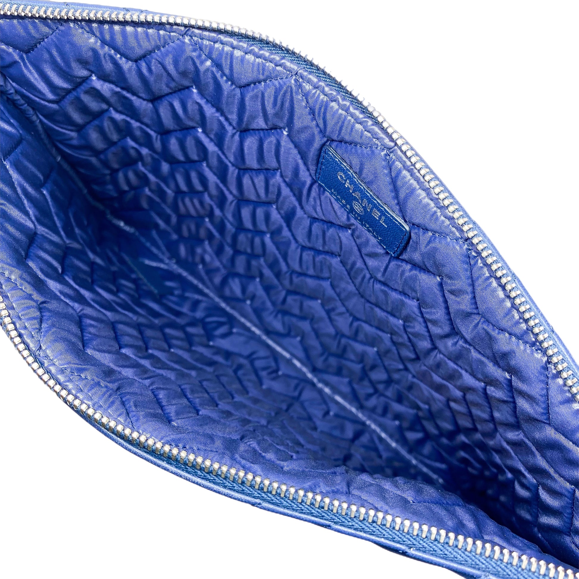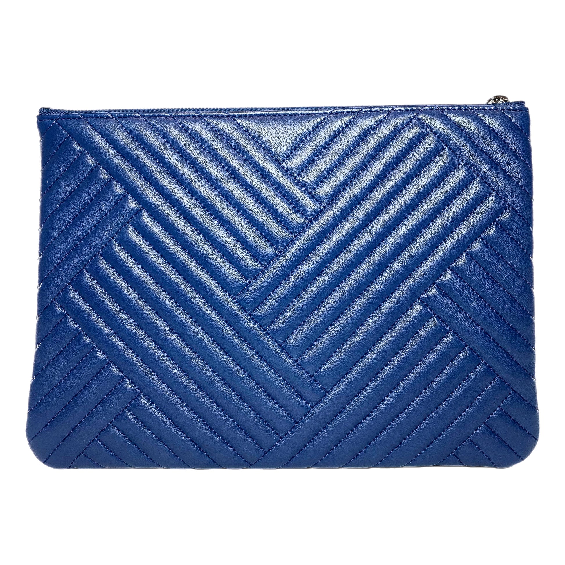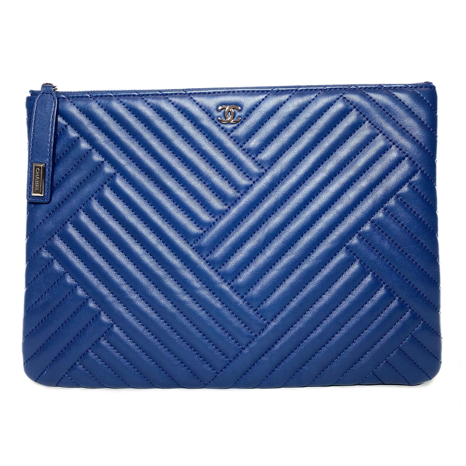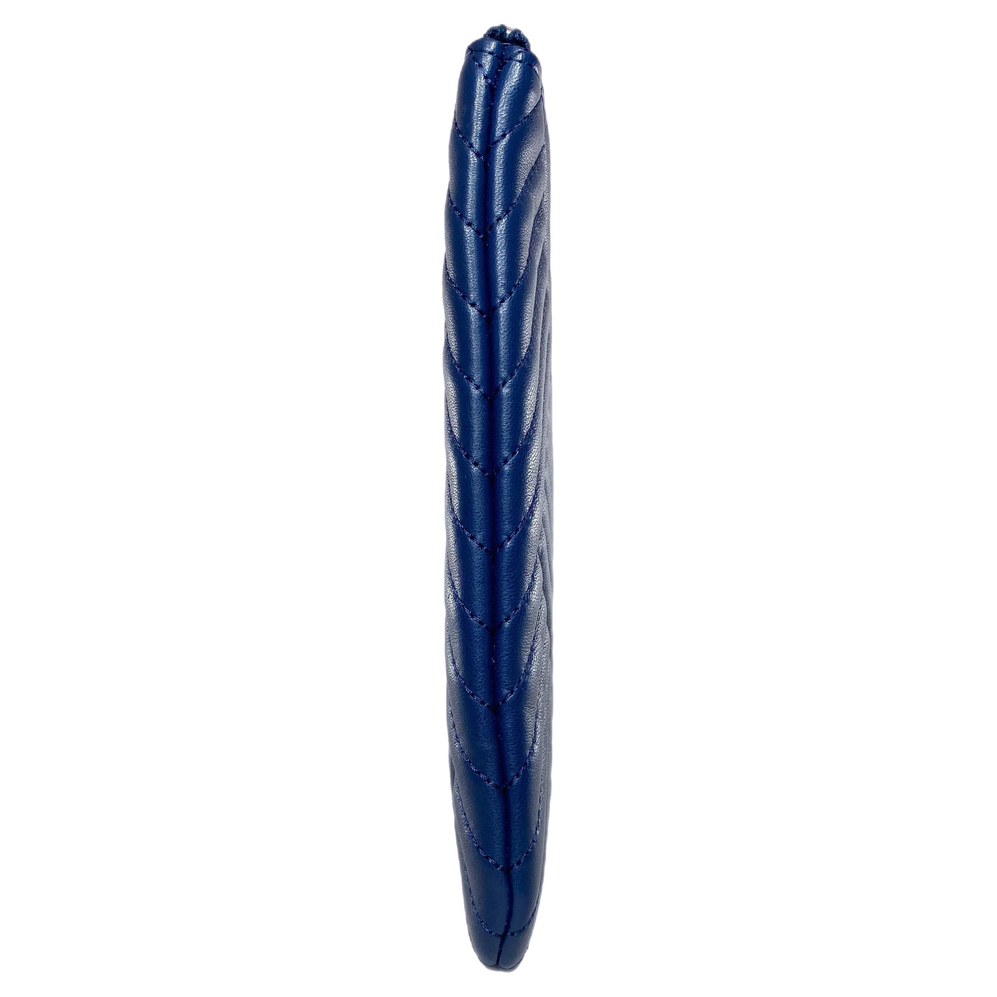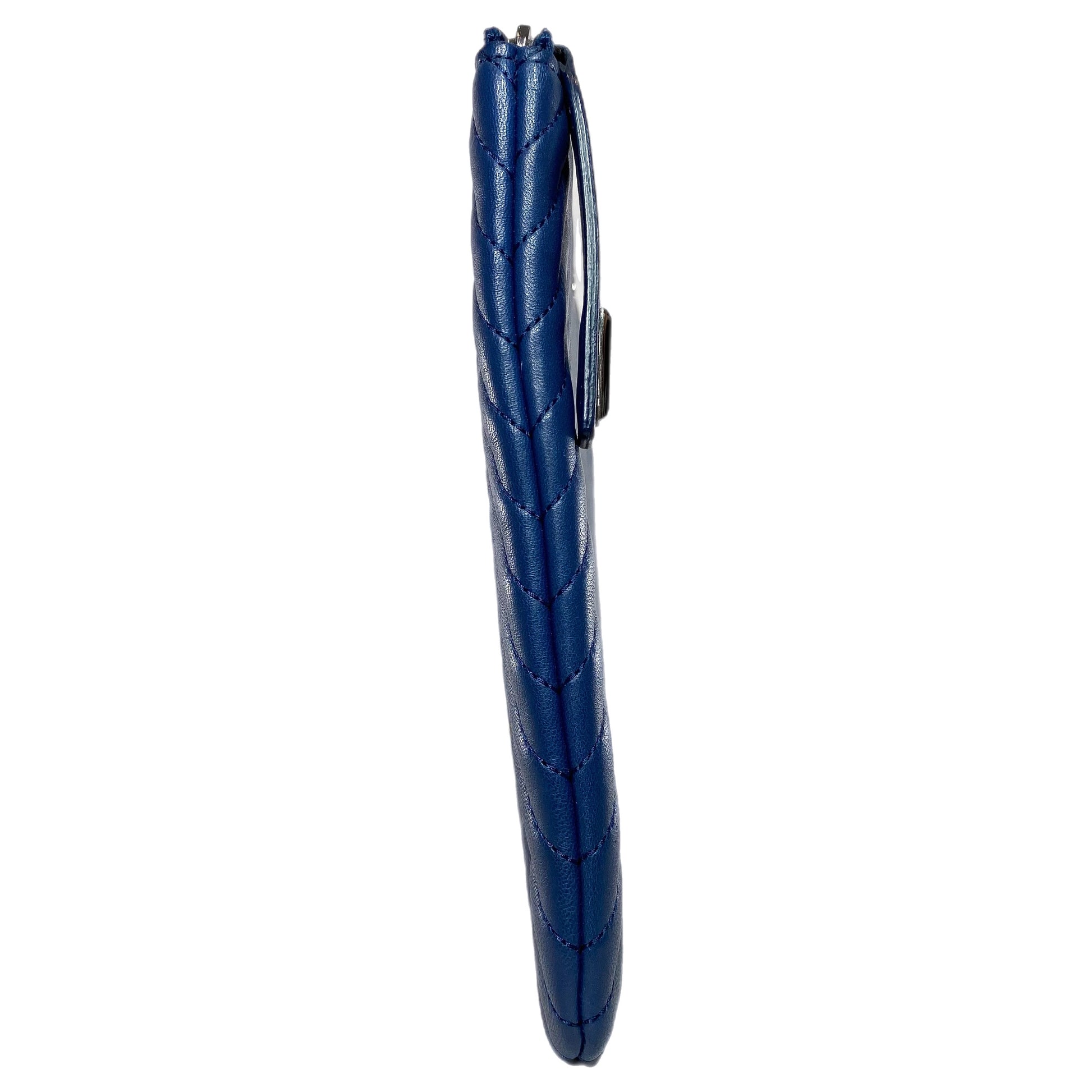 This is a Chanel Navy Padded O Case in calfskin with ruthenium hardware. This chic O Case features a Chanel “CC” at the top and a top zipper that opens to a navy satin lined interior. This is a stellar accessory for any occasion!