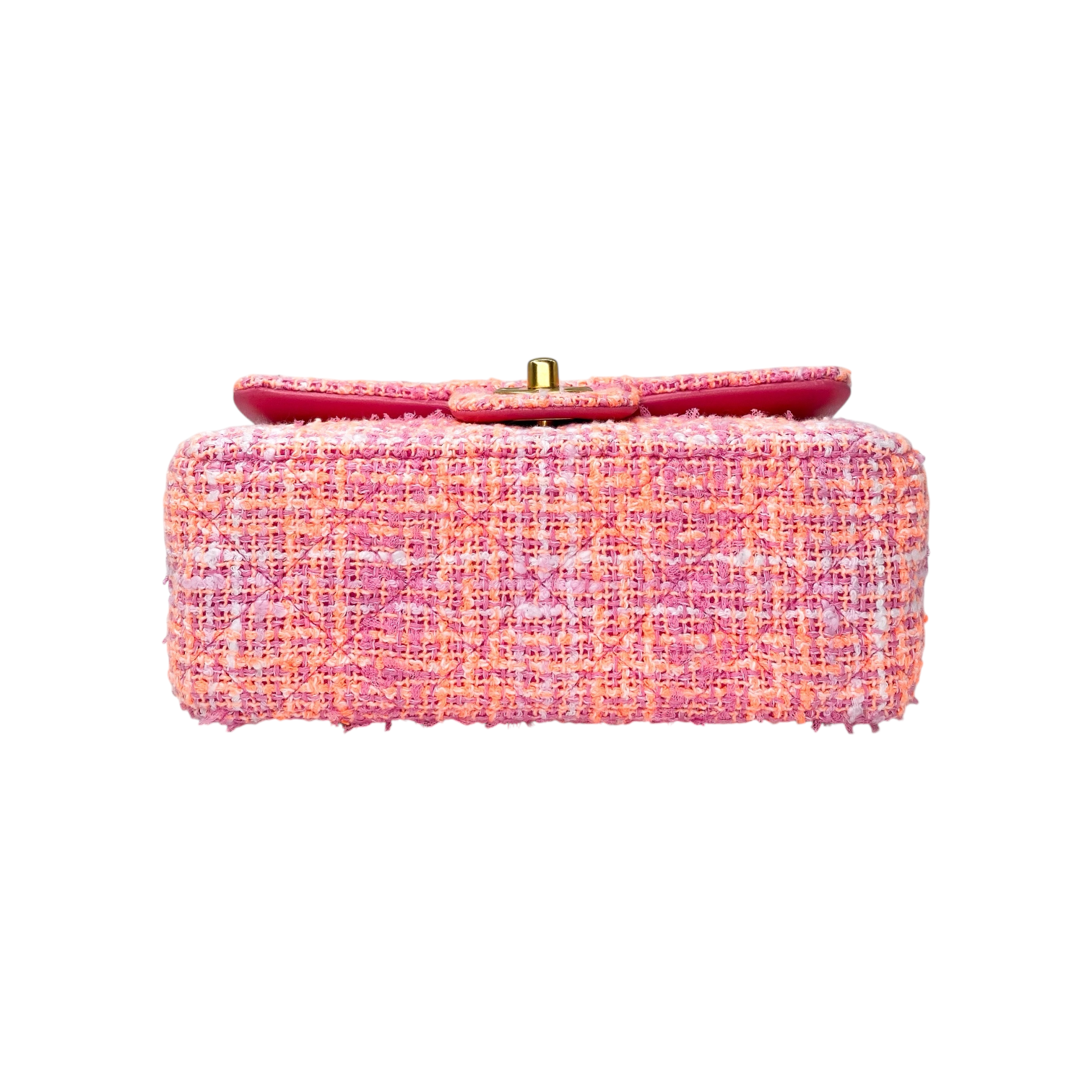 This is a Chanel Neon Pink Mini Rectangle in tweed and leather with gold hardware. This beautiful bag features a strap, a rear exterior pocket, and the iconic CC turn lock. The front flap opens the bag to a pink leather lined interior that features a patch pocket and a zipper pocket. This is a stellar bag for a pop of color!