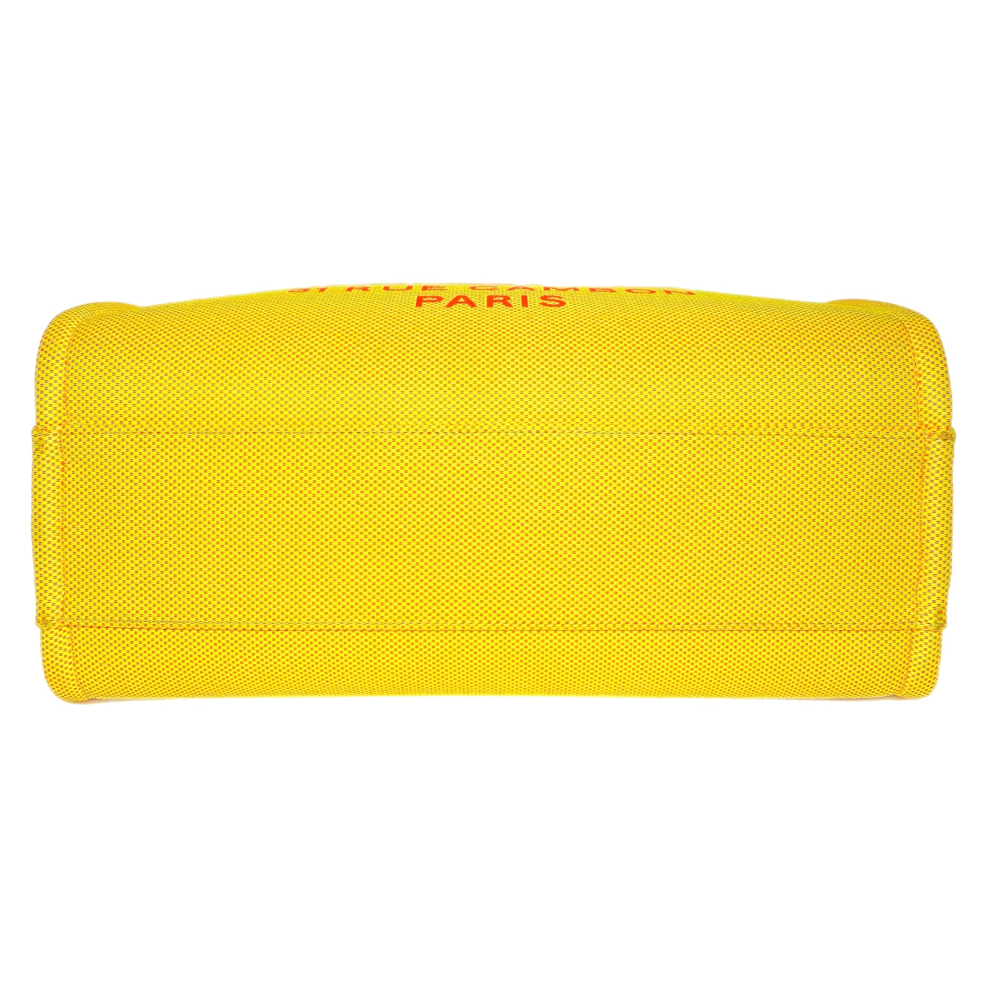 This is a Chanel Neon Yellow and Orange Deauville in mixed fibers and calfskin leather with silver hardware. This chic tote bag features two 10.5-inch handles and “CHANEL” written on the front. The top is open to a neon orange fabric lined interior that features two patch pockets and a zipper pocket. This is an amazing handbag for any occasion!