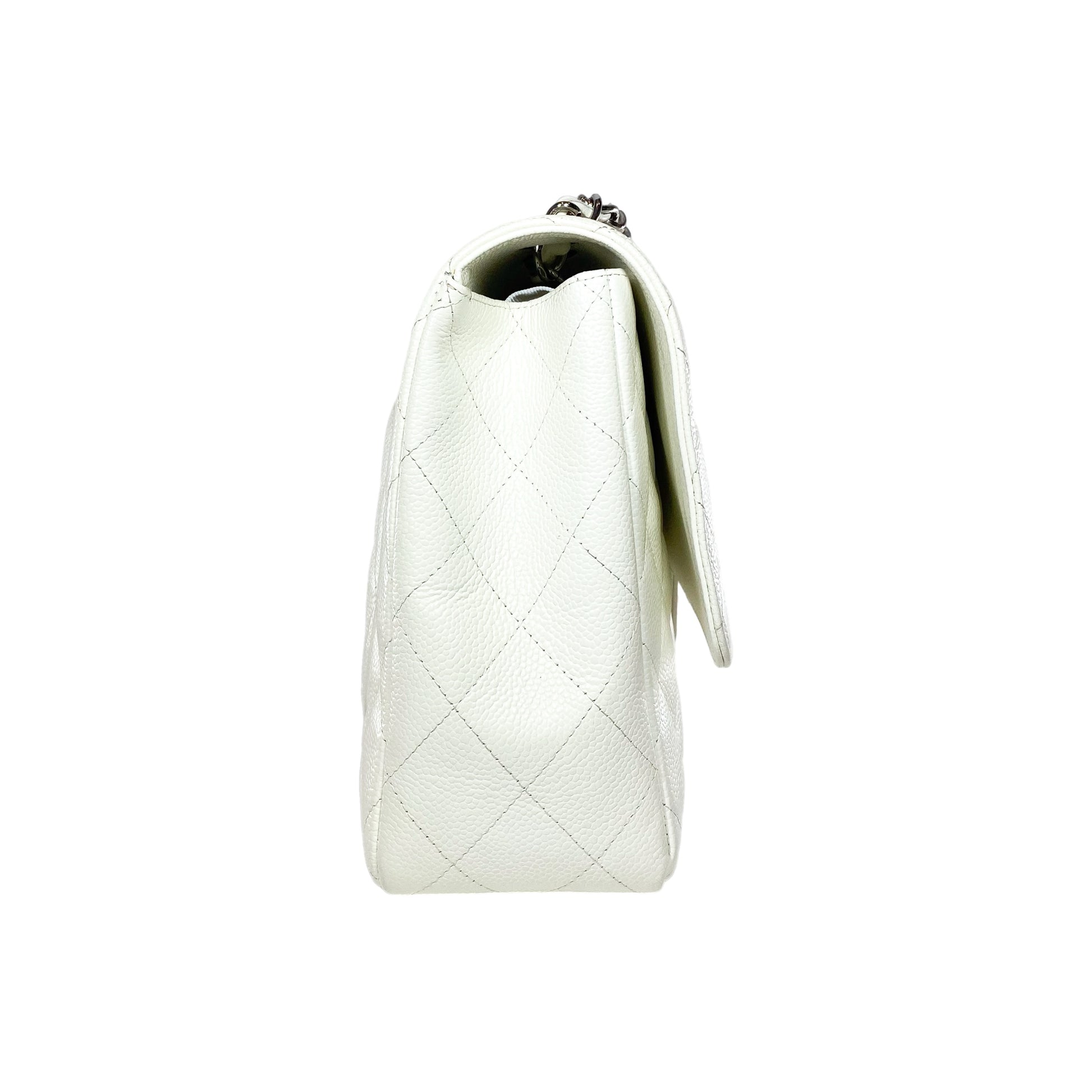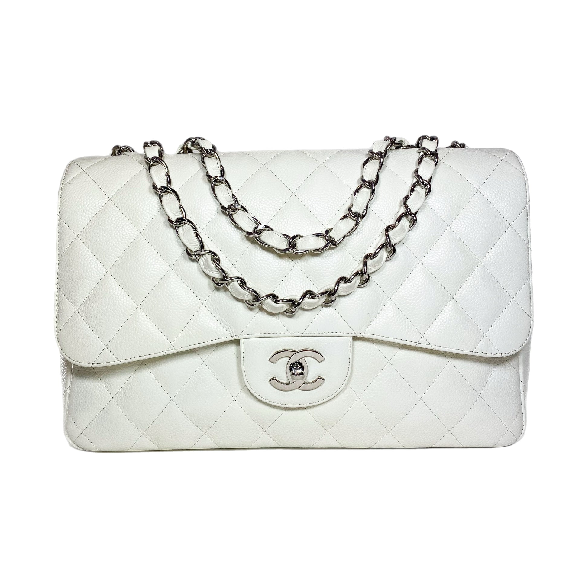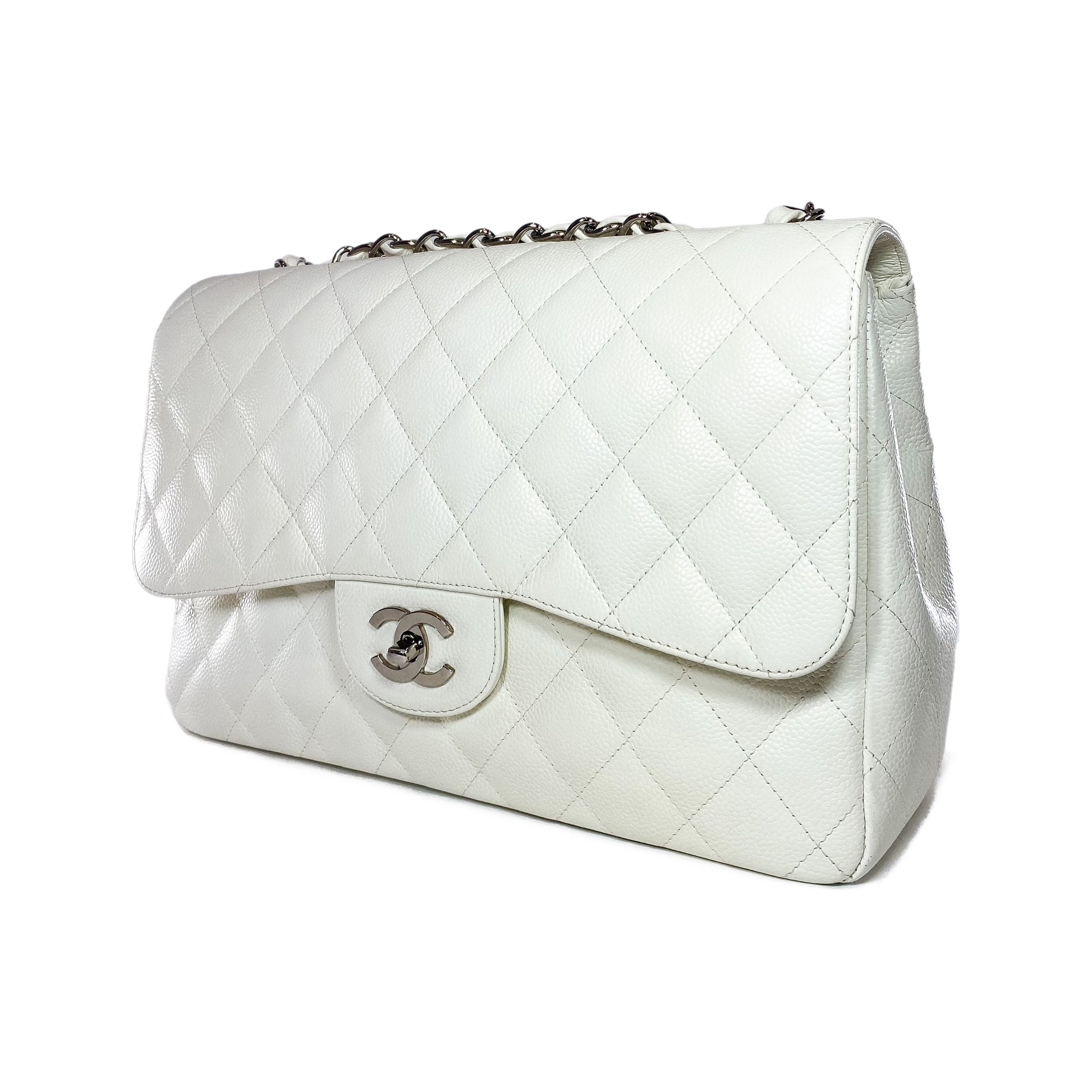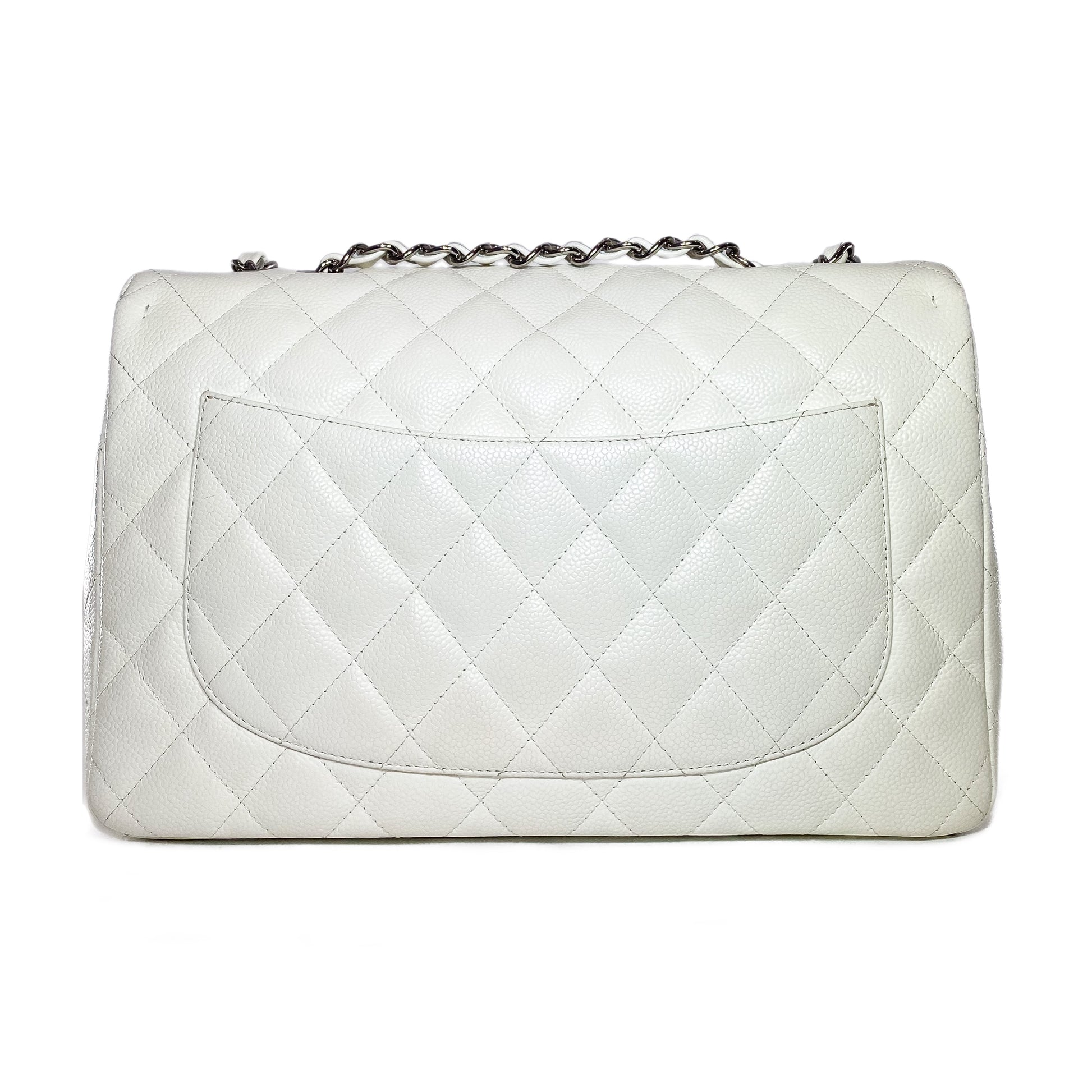 This is a Chanel Off White Jumbo Single Flap Bag in caviar leather with silver hardware. This stylish flap bag features a 23-inch strap, a rear pocket, and a “CC” turn lock closure. The front flap opens to a leather lined interior that features a patch pocket and a zipper pocket. This is a stellar handbag for everyday use!