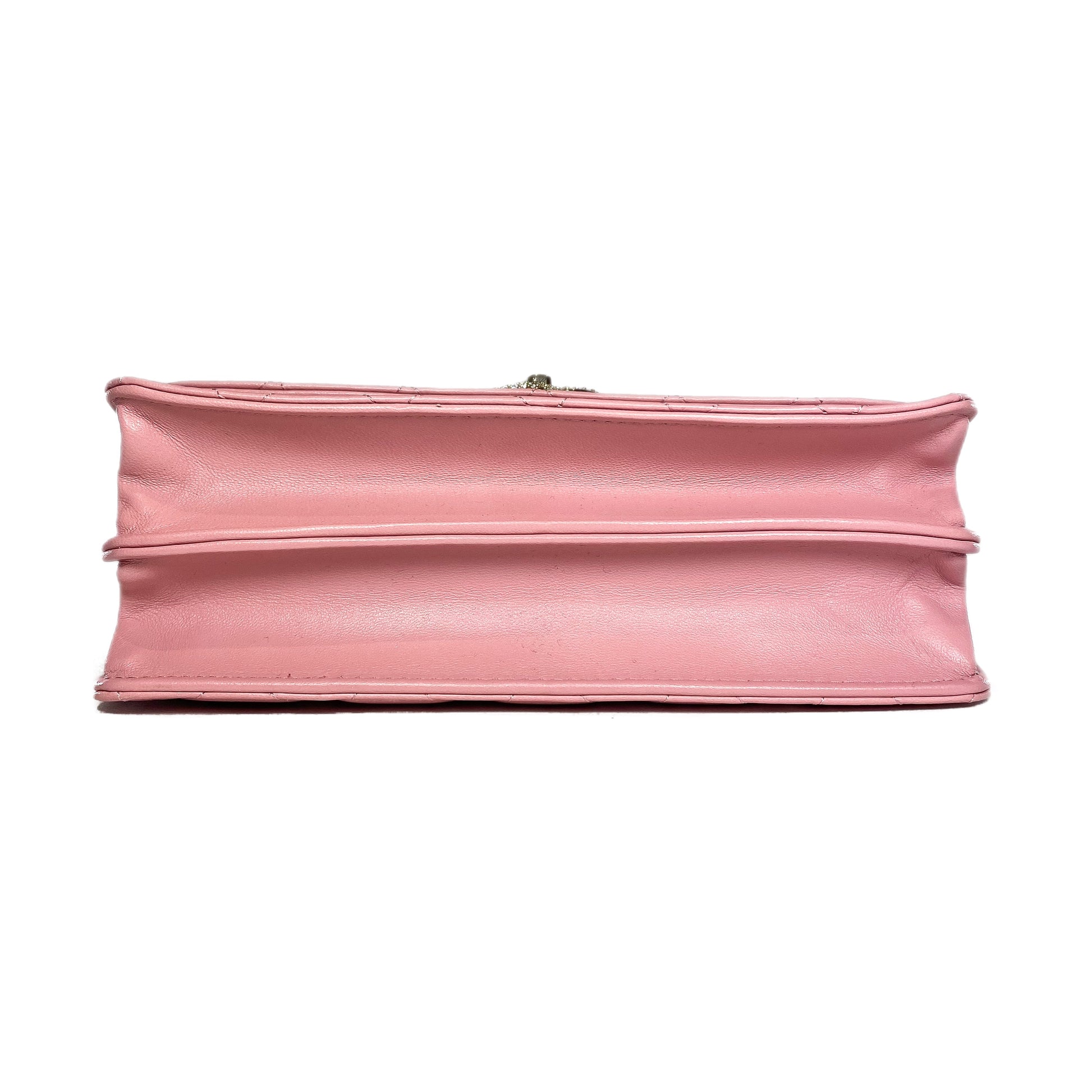 This is a Chanel Pink Clutch with Chain in lambskin leather with gold hardware. This beautiful handbag features a 1.5-inch crystal embellished top handle, a 22.5-inch strap, and a crystal embellished “CC” closure. The front flap opens to a partitioned pink fabric lined interior that features card slots and a zipper pocket. This is a stellar handbag for any occasion!