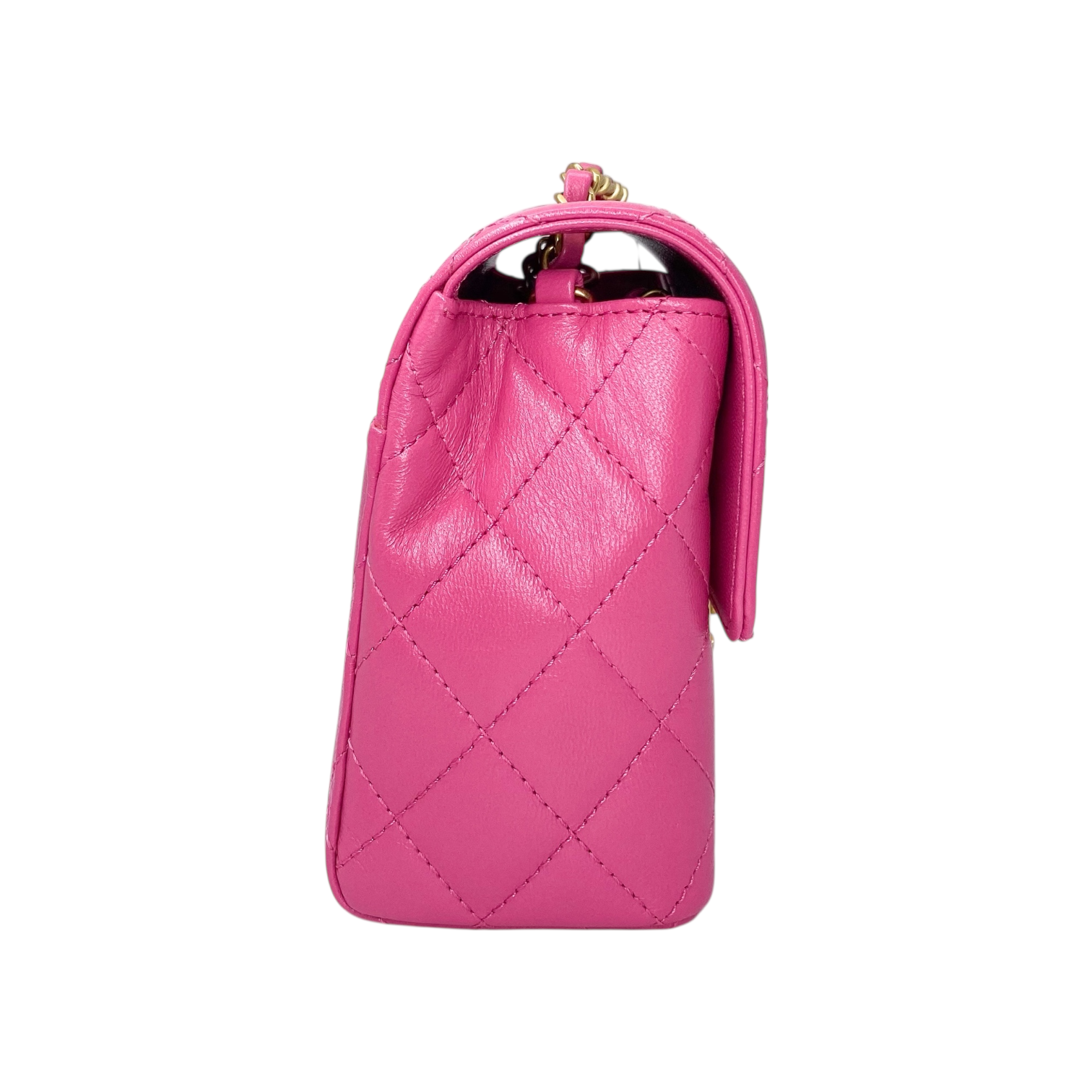 This is a Chanel Pink Mini Classic Single Flap Bag in calfskin leather with gold hardware. This wonderful handbag features a strap, a rear pocket, and a CC turn lock closure. The interior is lined in pink leather and features two patch pockets. This stellar handbag is wonderful for any occasion!