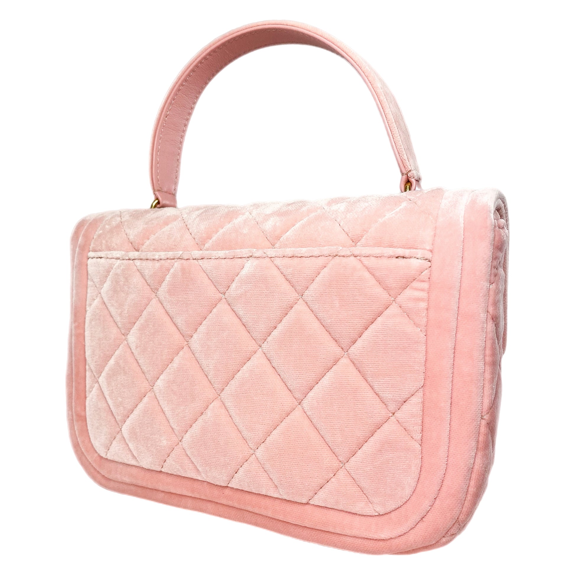 This is a Chanel Pink Mini Flap Bag in velvet with gold hardware. This stylish flap bag features a 24-inch strap, a rear pocket, and a CC turn lock. The front flap opens to a pink fabric lined interior that features a patch pocket and a zipper pocket. This is a stellar handbag for any occasion!