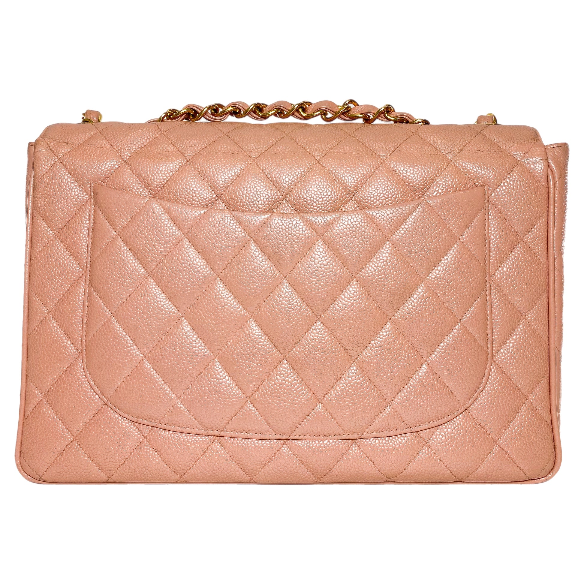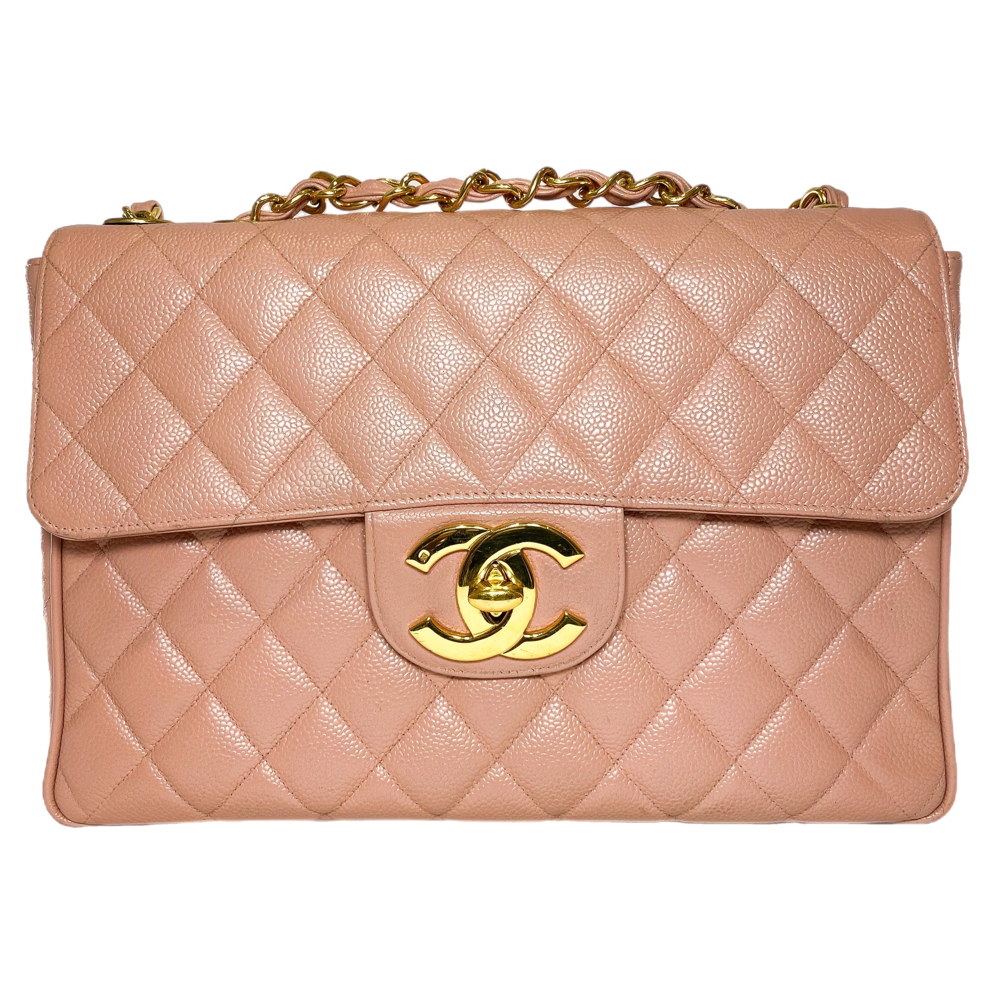 This is a Chanel Pink Vintage Jumbo Flap Bag in caviar leather with 24k gold hardware. This beautiful flap bag features a 24-inch strap, a rear pocket, and a CC turn lock closure. The front flap opens to a pink leather lined interior that features a patch pocket and a zipper pocket. This is a stellar handbag for any occasion!