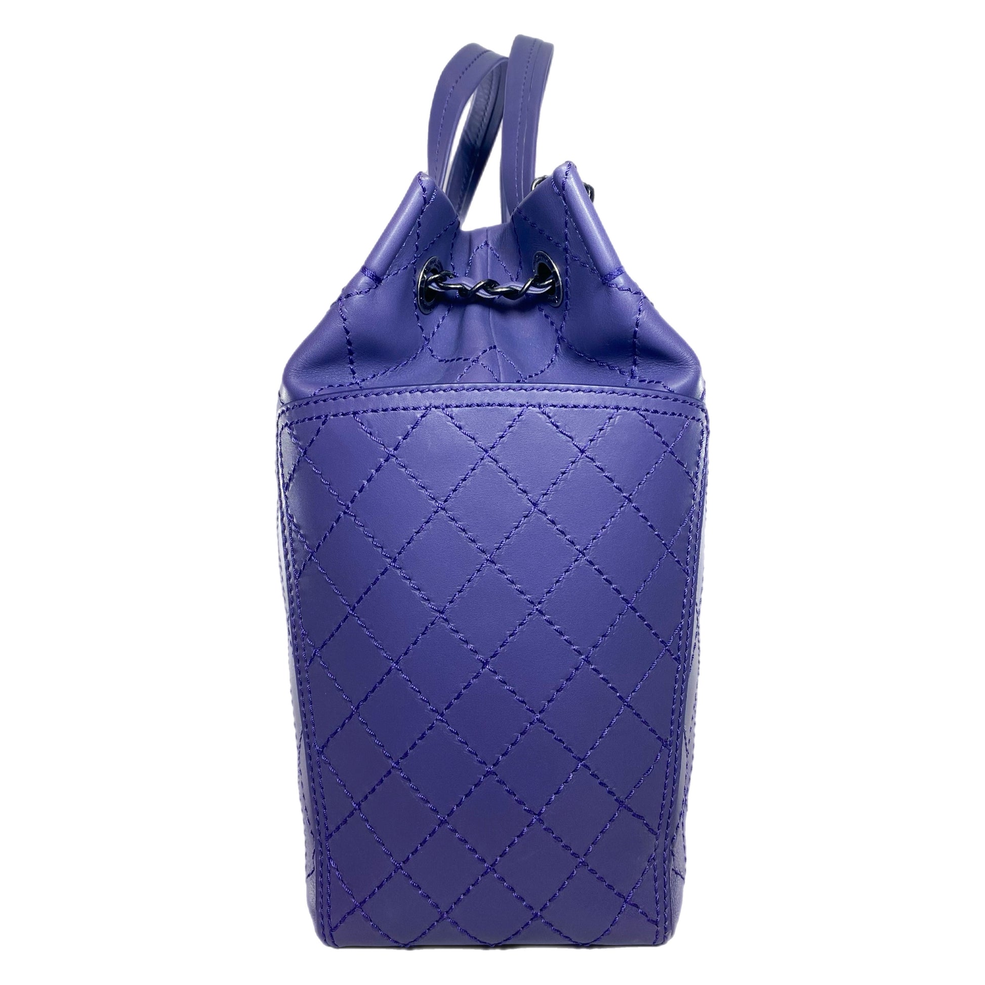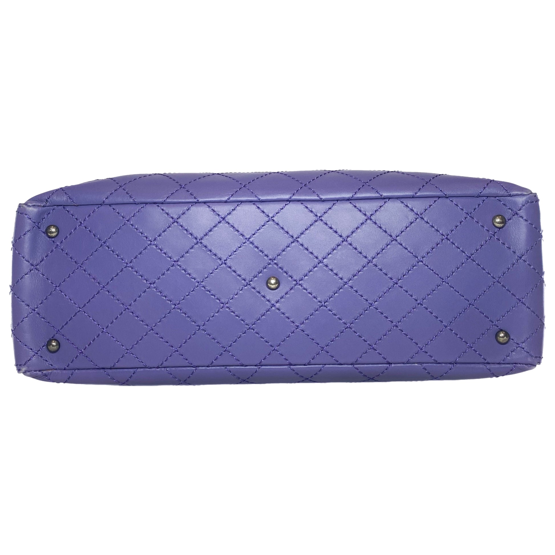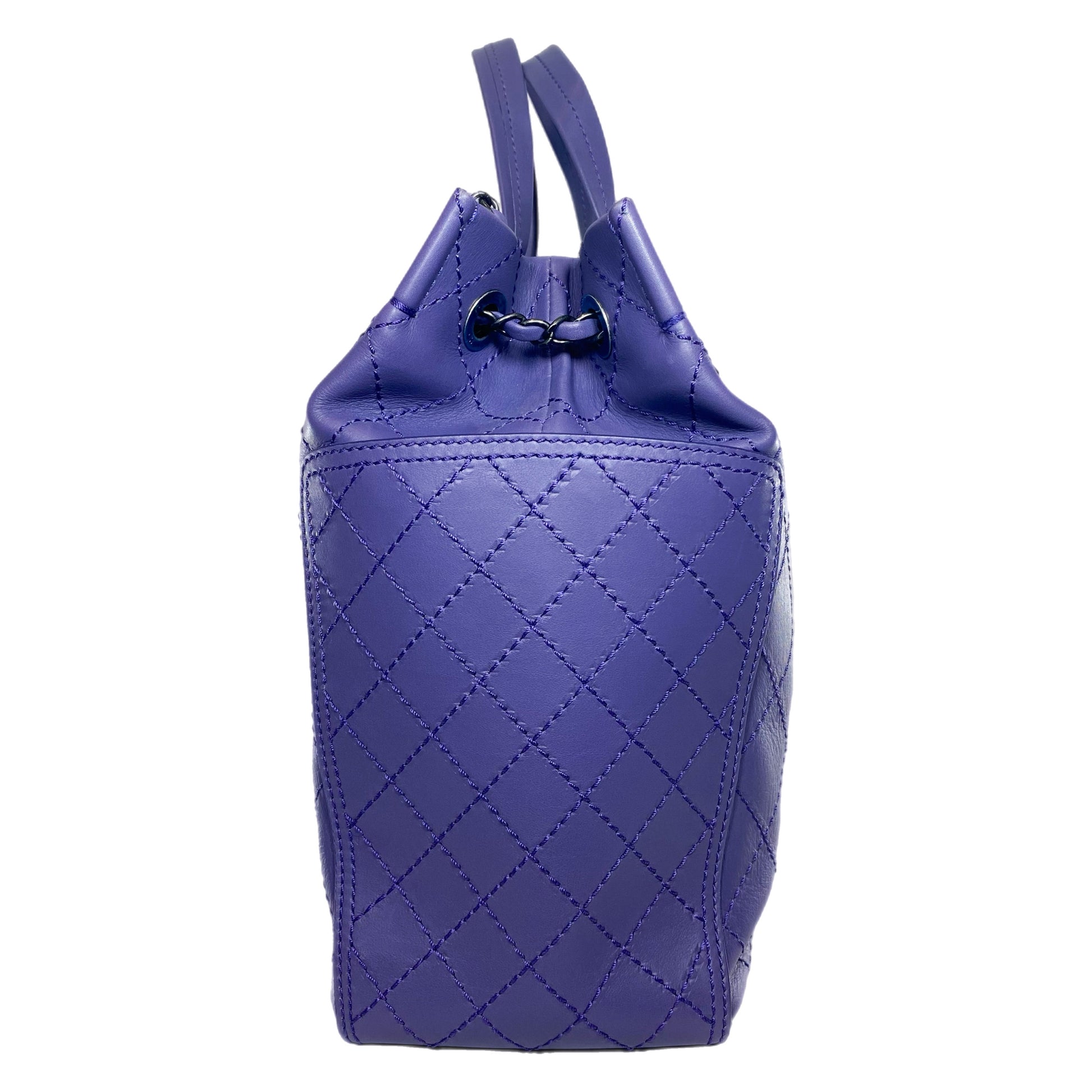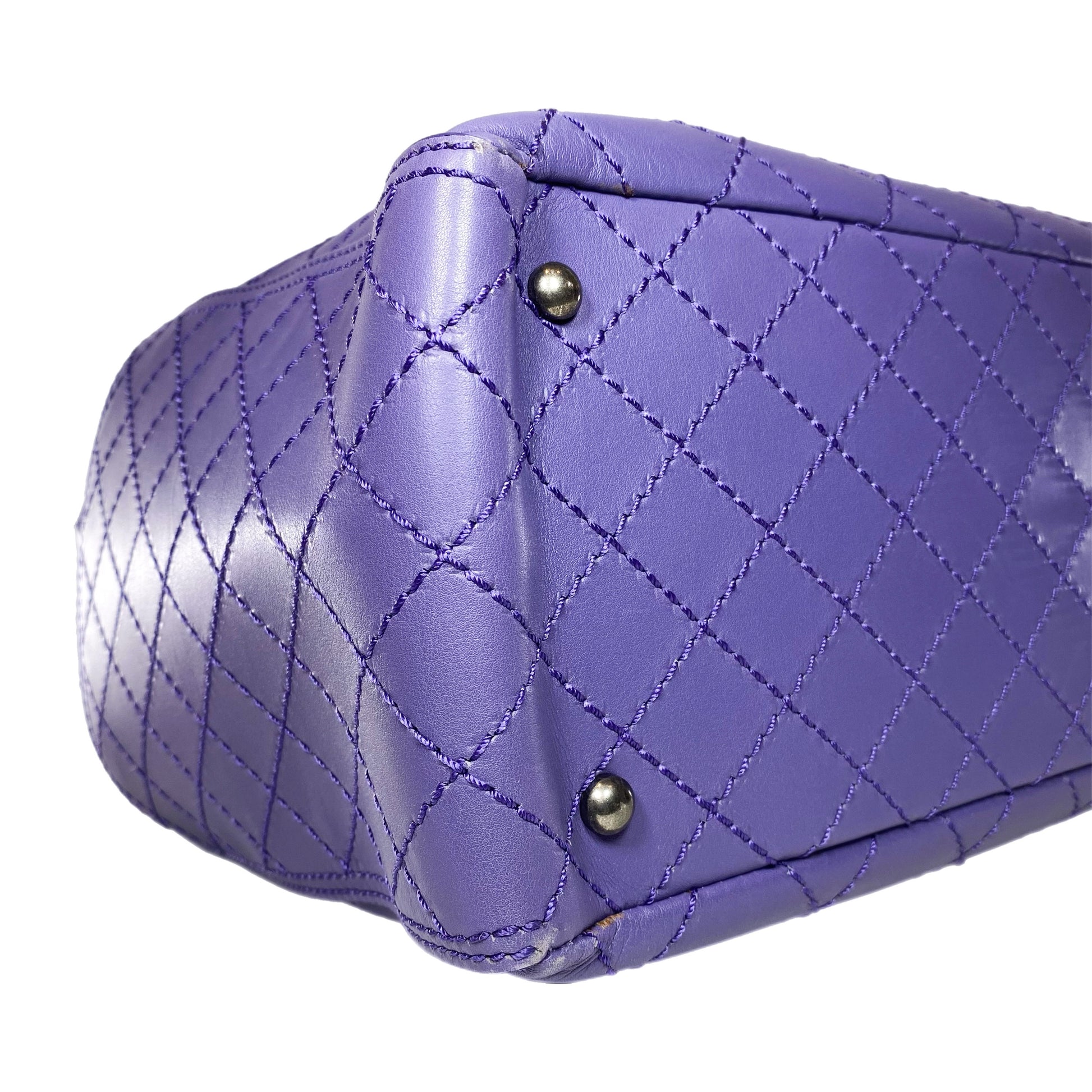 This is a Chanel Purple CC Pocket Tote in calfskin leather with ruthenium hardware. This chic tote bag features two 3.75-inch handles, two 14.5-inch straps, a CC charm, and two side pockets. The top is open to a tan fabric lined interior that features two patch pockets and a zipper pocket. This is a wonderful tote bag for everyday use!