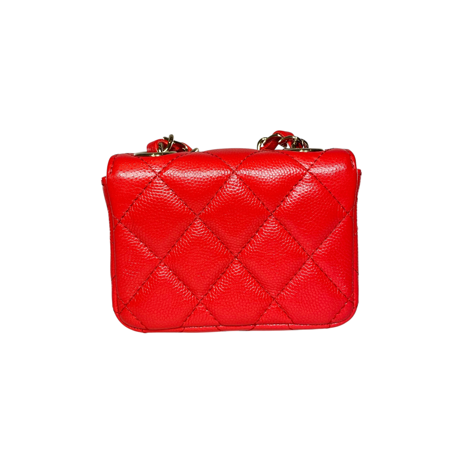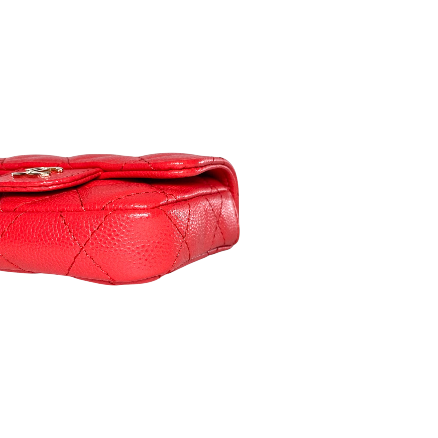 This is a Chanel Red Mini Flap Bag Charm in caviar leather with gold hardware. This stylish mini flap features a 20-inch strap and a snap closure. The interior is lined in red fabric. This is a wonderful addition to your collection!