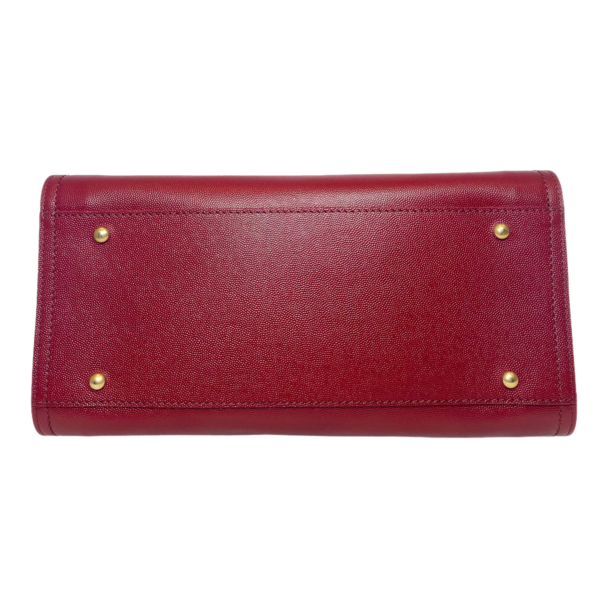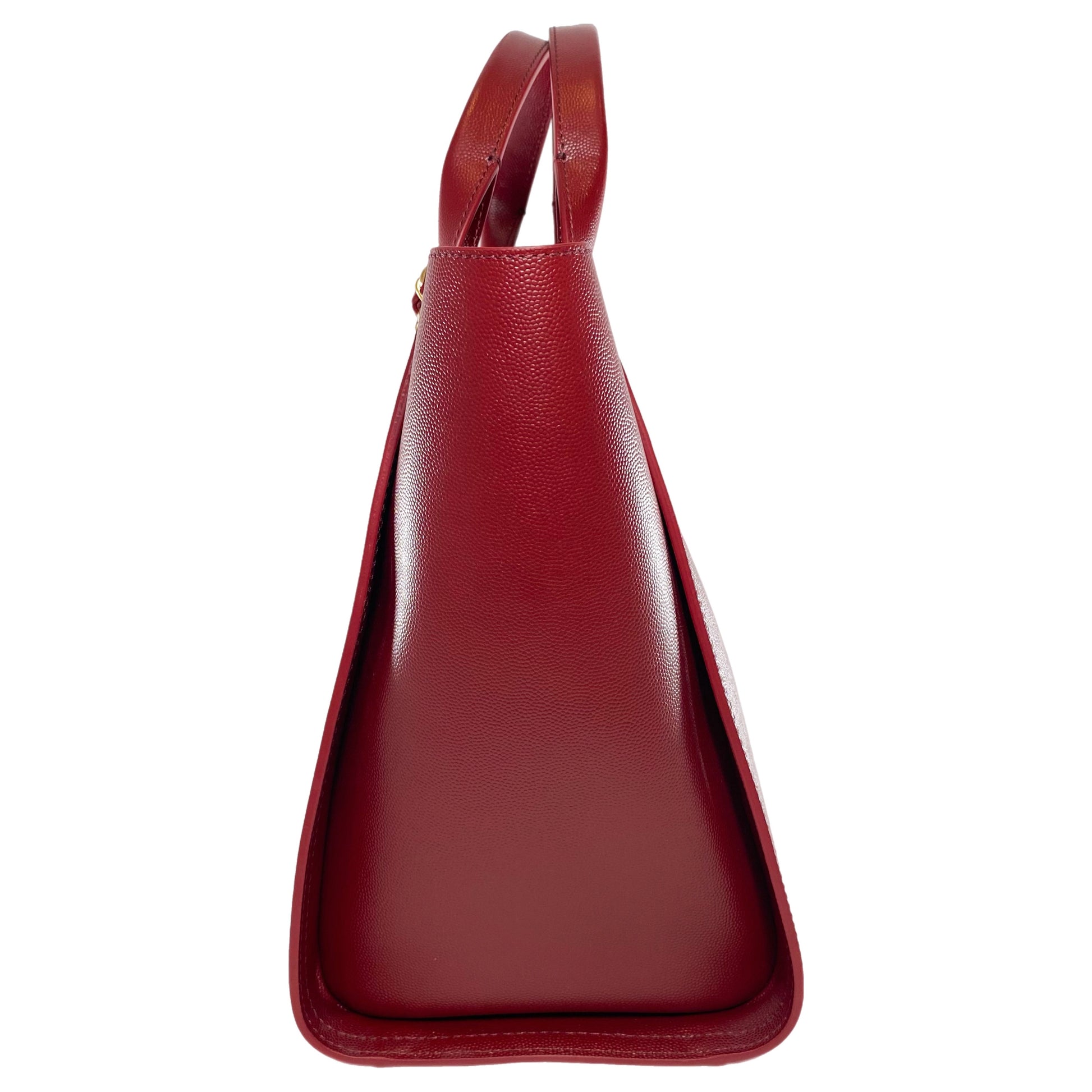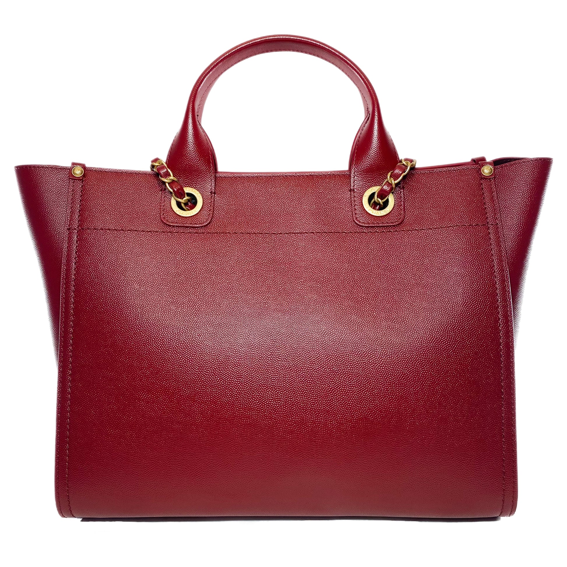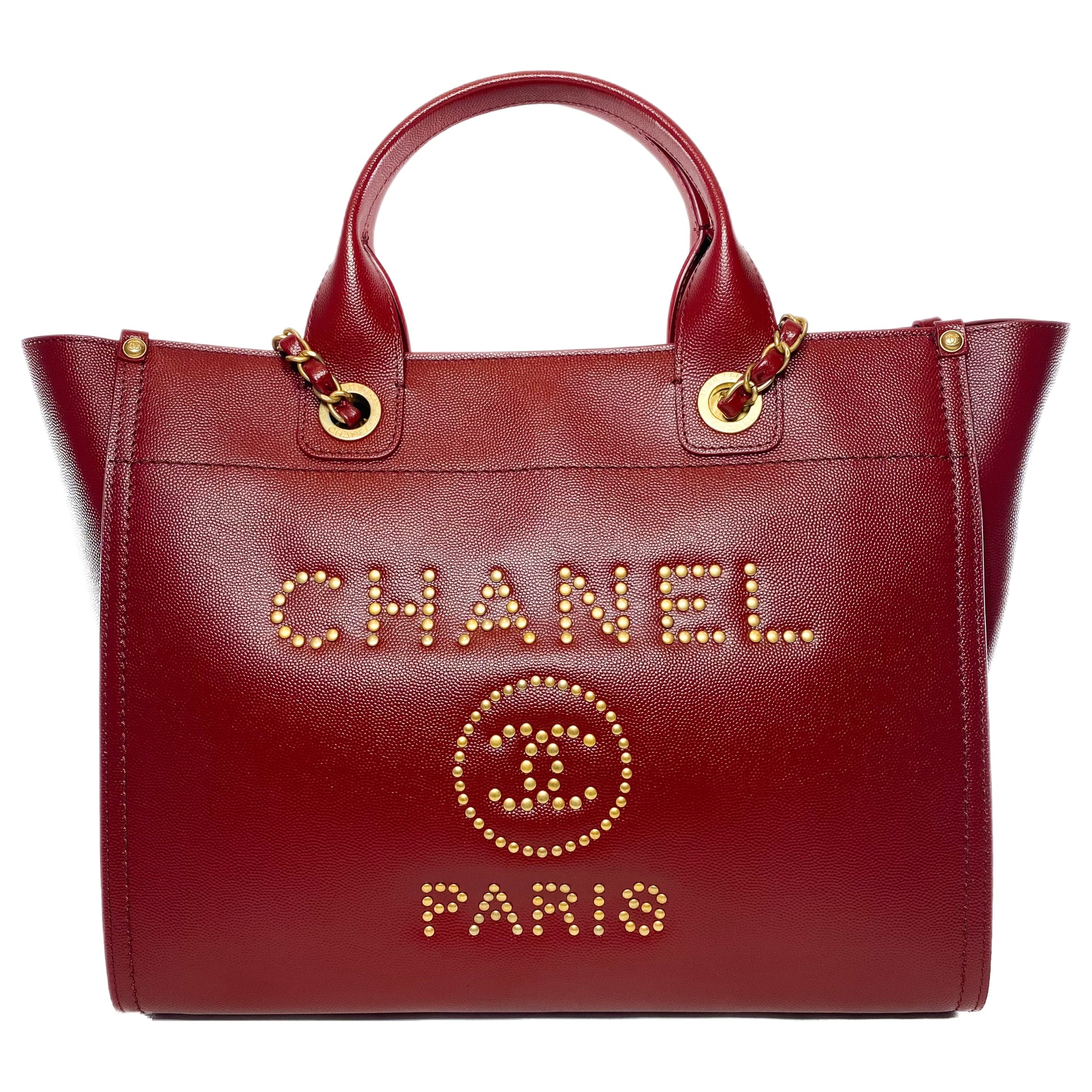 This is a Chanel Red Studded Medium Deauville in caviar leather with gold hardware. This stylish Deauville features two 4-inch handles, two 14-inch straps, and a gold studded Chanel logo on the front. A top snap closure opens the handbag to a burgundy suede lined interior that features two zipper pockets. This is an amazing tote bag for everyday use!
