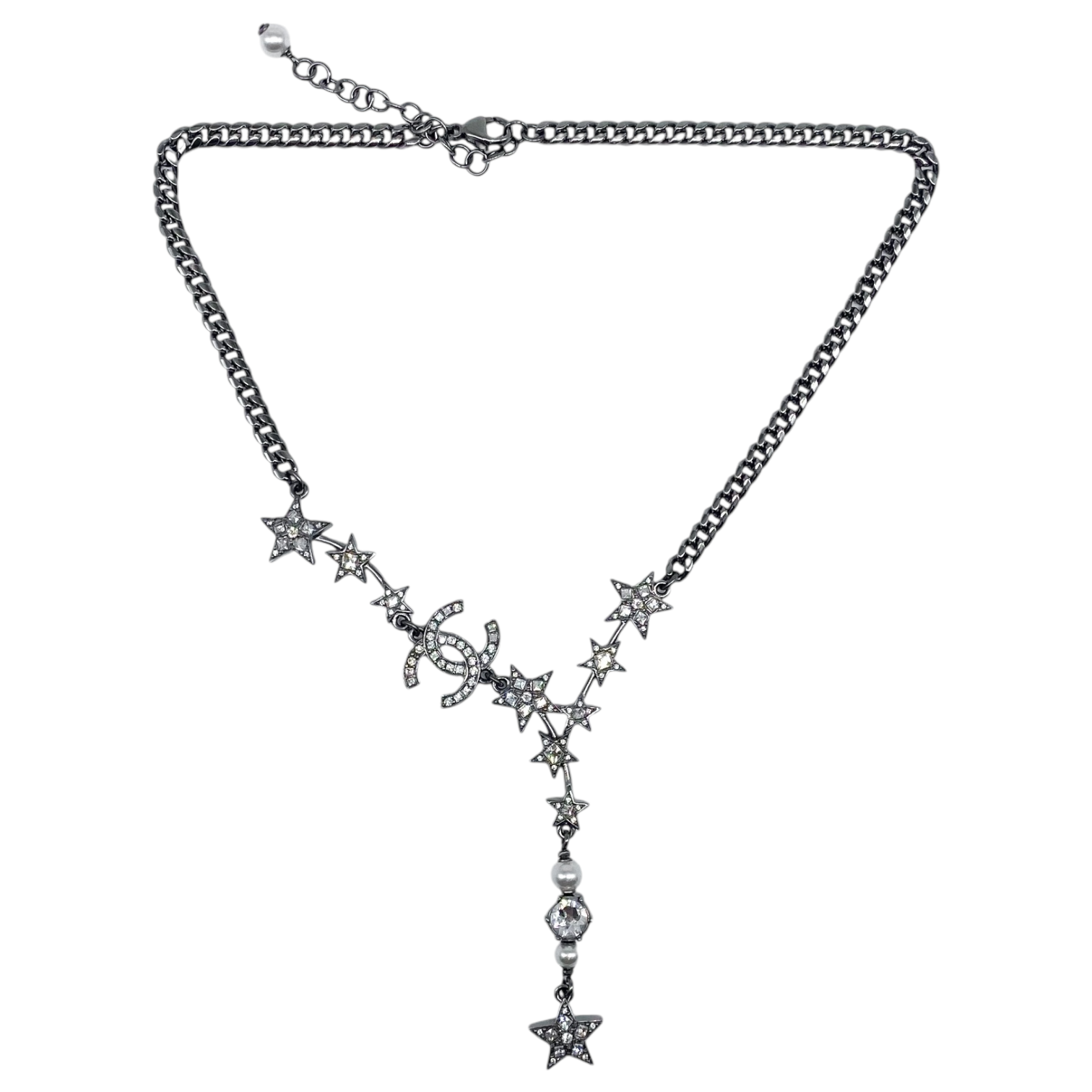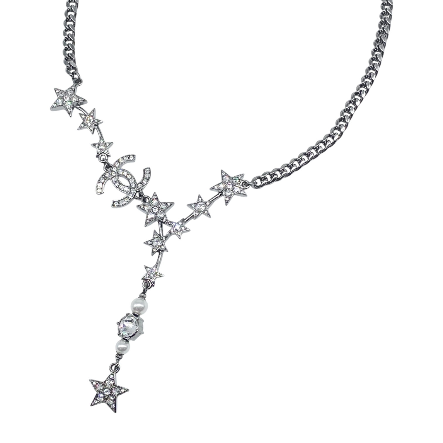 This is a Chanel SIlver Star Crystal Necklace. This stylish necklace features a star pendant with a pearl detail. A beautiful necklace for a special occasion!