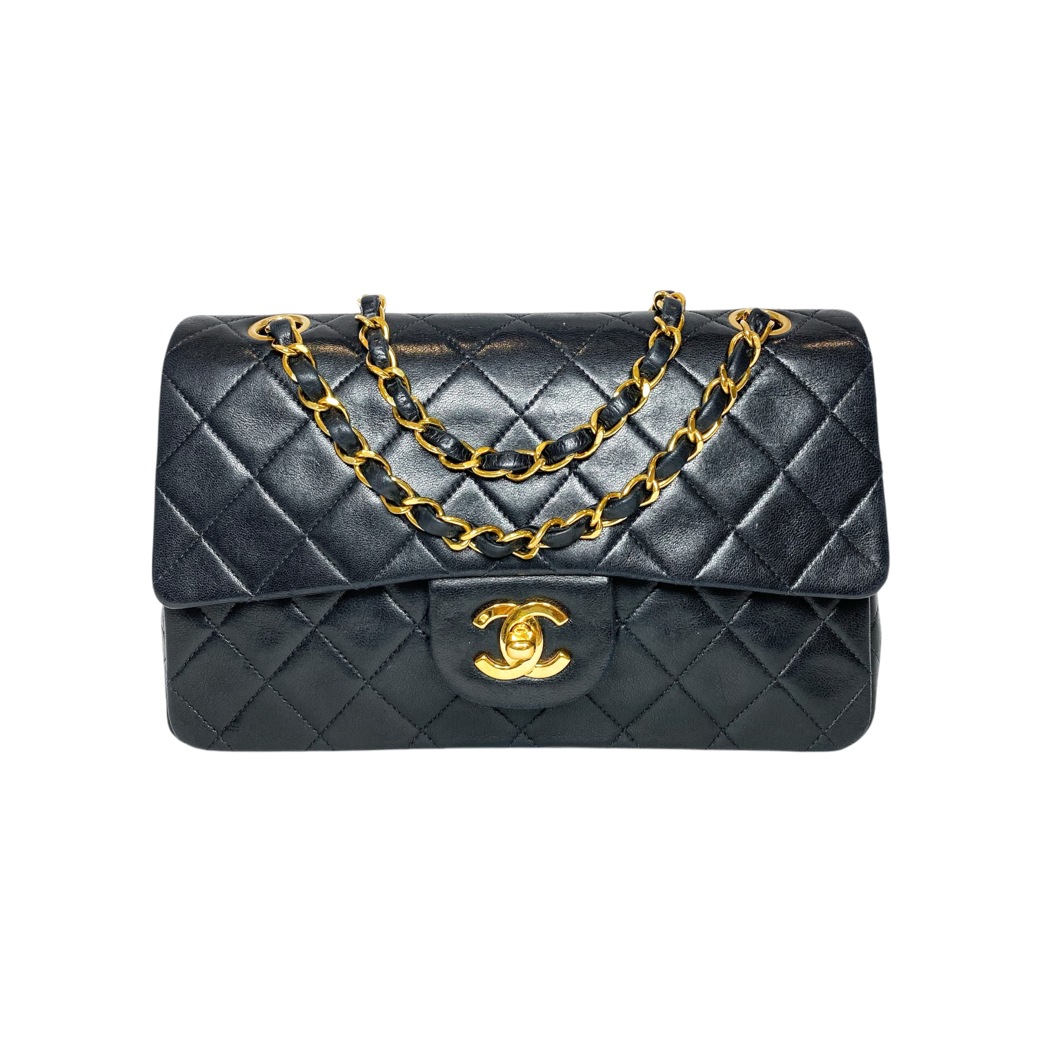 This is a Chanel Small Black Vintage Double Flap Bag in lambskin leather with gold hardware. This beautiful vintage flap features a 17-inch strap, a rear pocket, and a CC turnlock. The front flap opens to a red leather lined interior that features two patch pockets. This is an amazing handbag for many occasions!