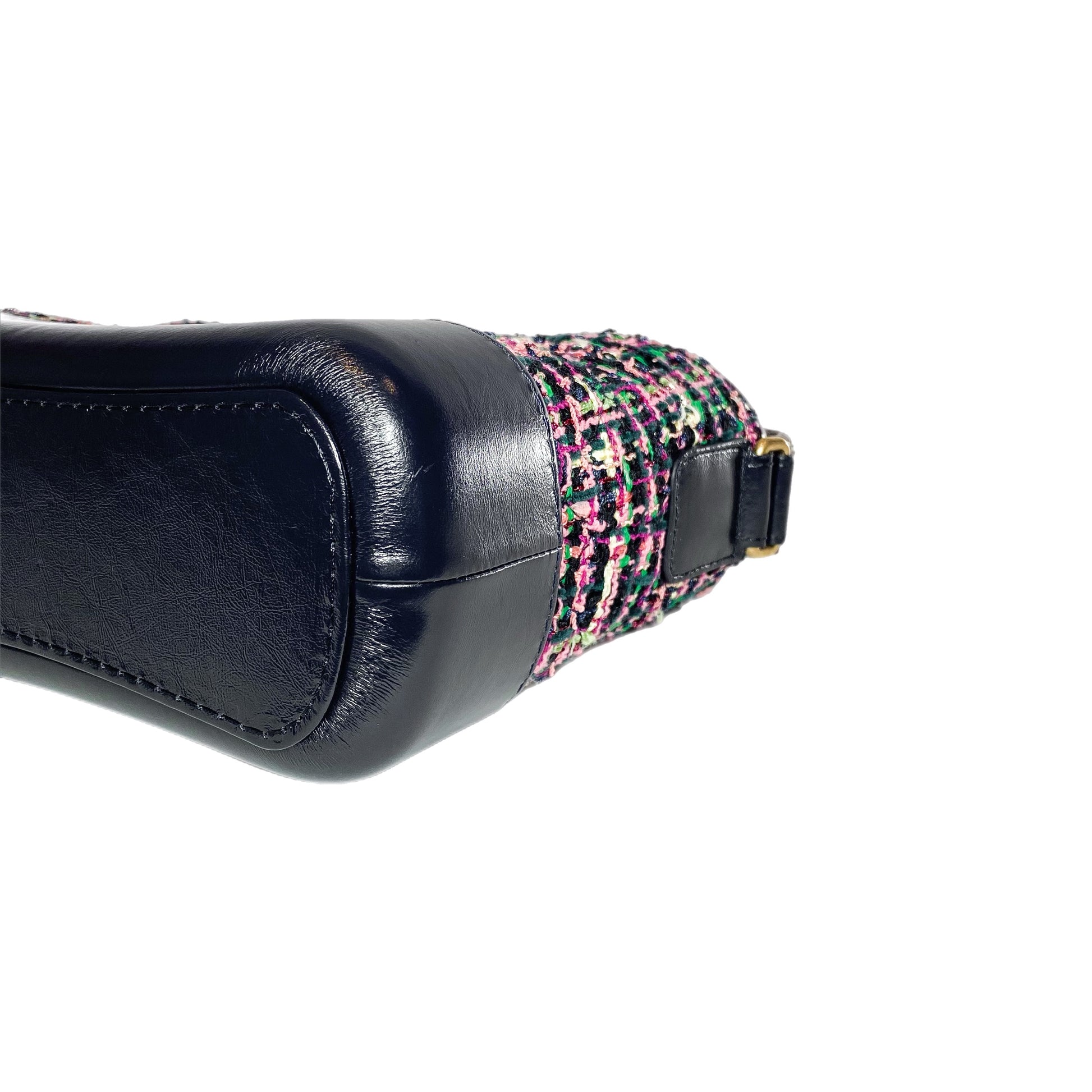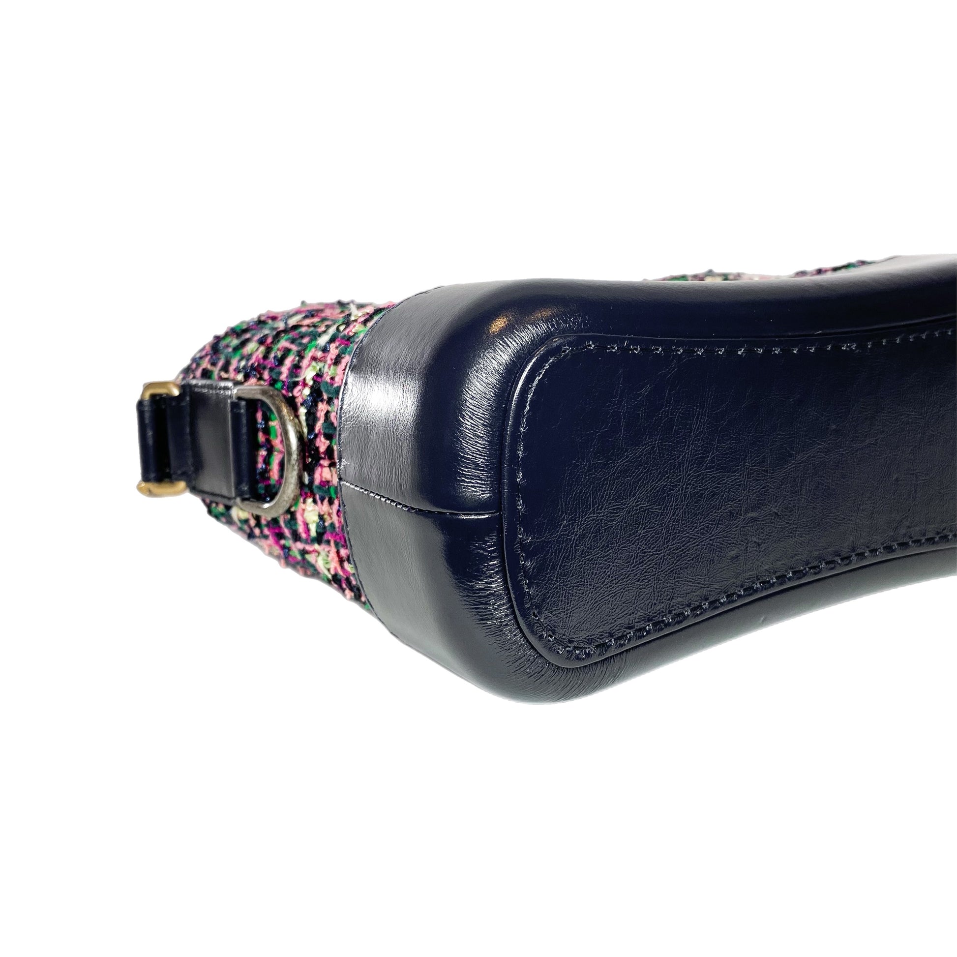 This is a Chanel Small Multicolor Gabrielle Hobo Bag in tweed and calfskin leather with three toned hardware. This stylish handbag features a 28.5-inch strap and a top zipper closure. The interior is lined in black fabric and features two patch pockets and a zipper pocket. This is an amazing handbag for many occasions!