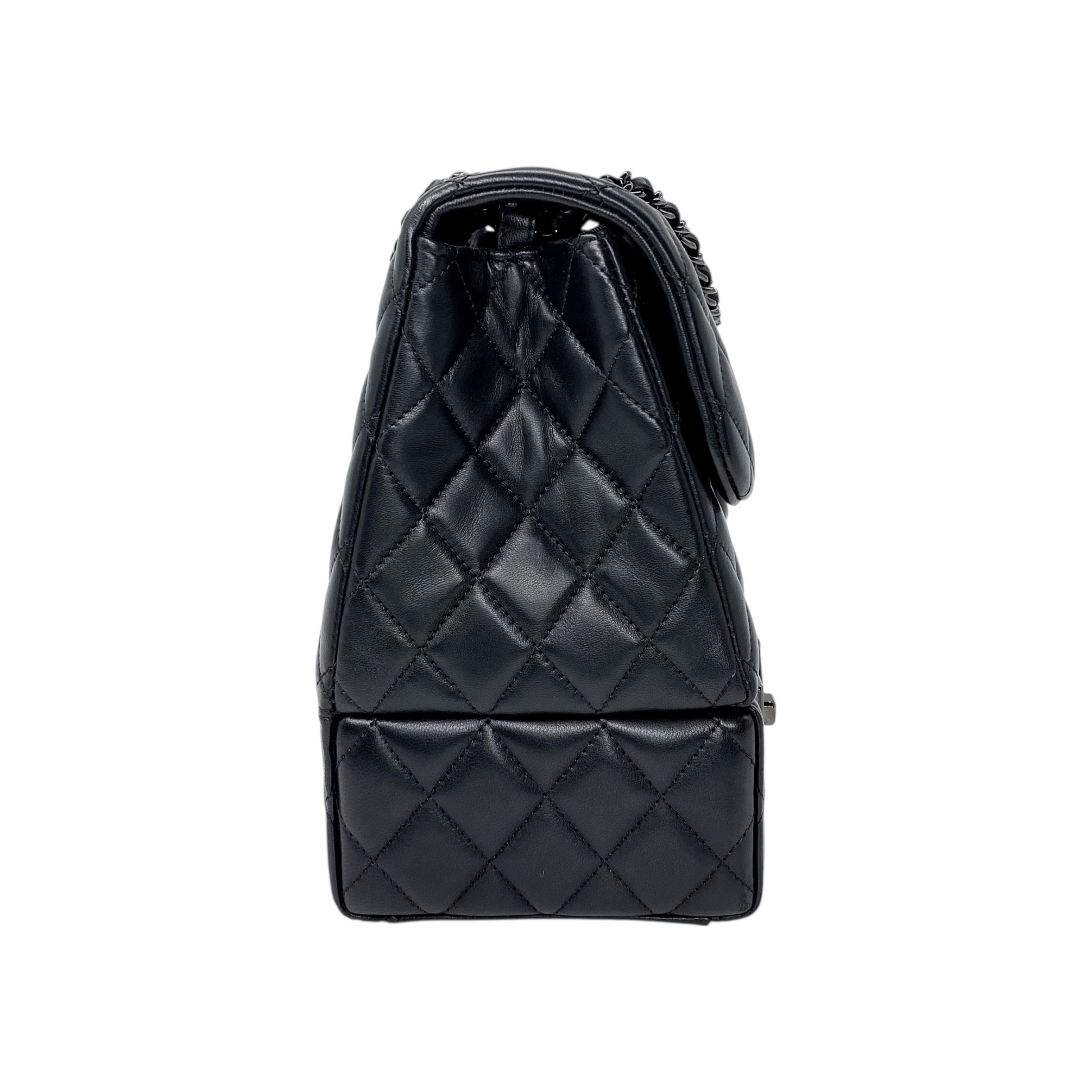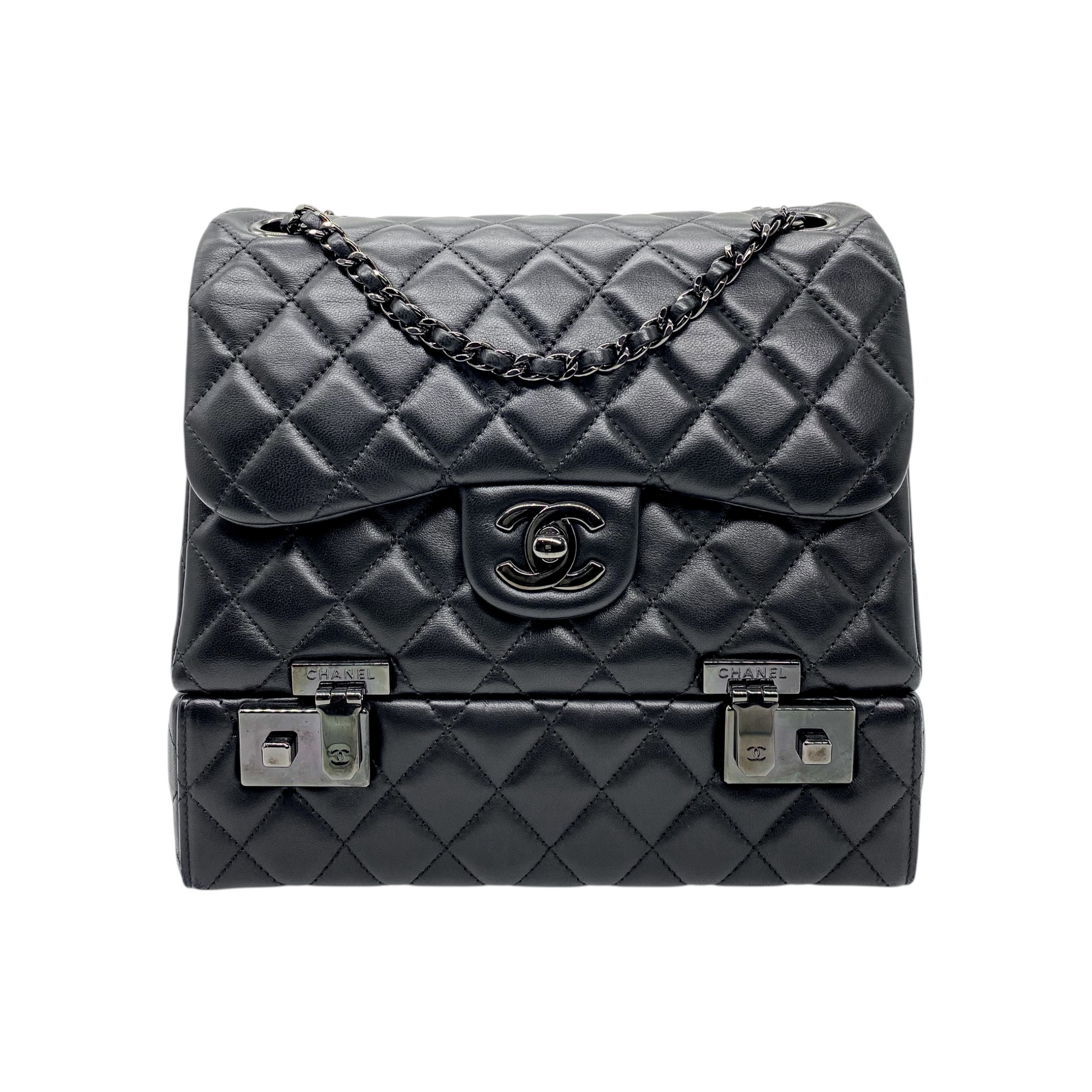 This is a Chanel So Black Cockpit Flap Bag in lambskin leather with black hardware. This amazing handbag features a strap and a turn lock closure. The interior is lined in black fabric and features a zipper pocket. This is a stellar handbag to add to your collection!