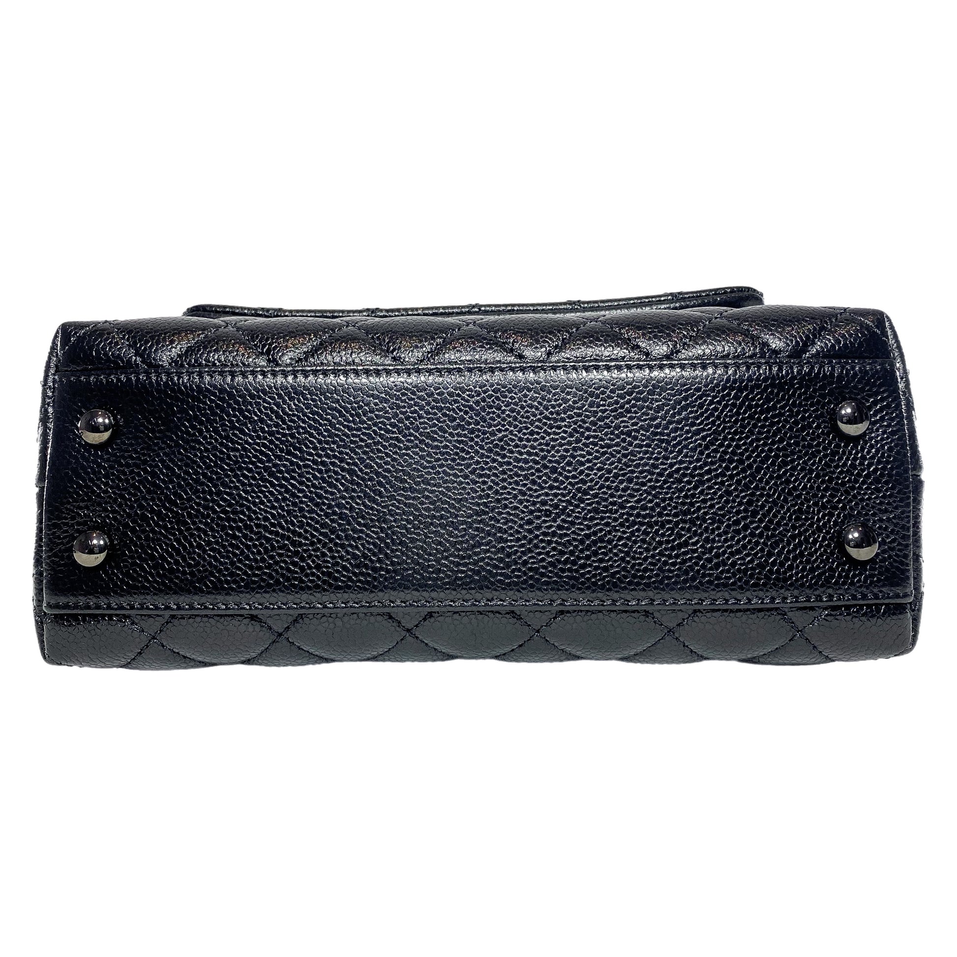 This is a Chanel So Black Mini Coco Handle in caviar leather with black hardware. This chic handbag features a 3-inch top handle, an 18-inch detachable strap, and a rear exterior pocket. A CC turn lock opens to a black fabric lined interior that features a patch pocket and a zipper pocket. This is a stellar handbag for any occasion!