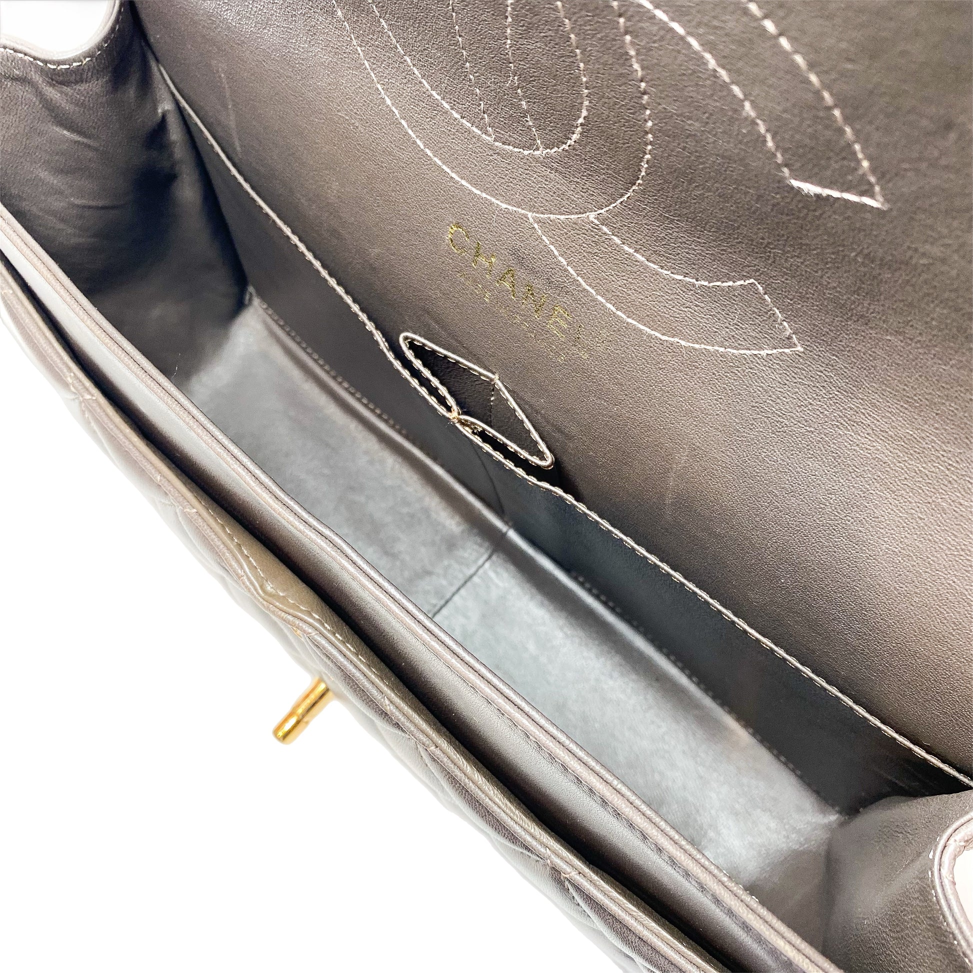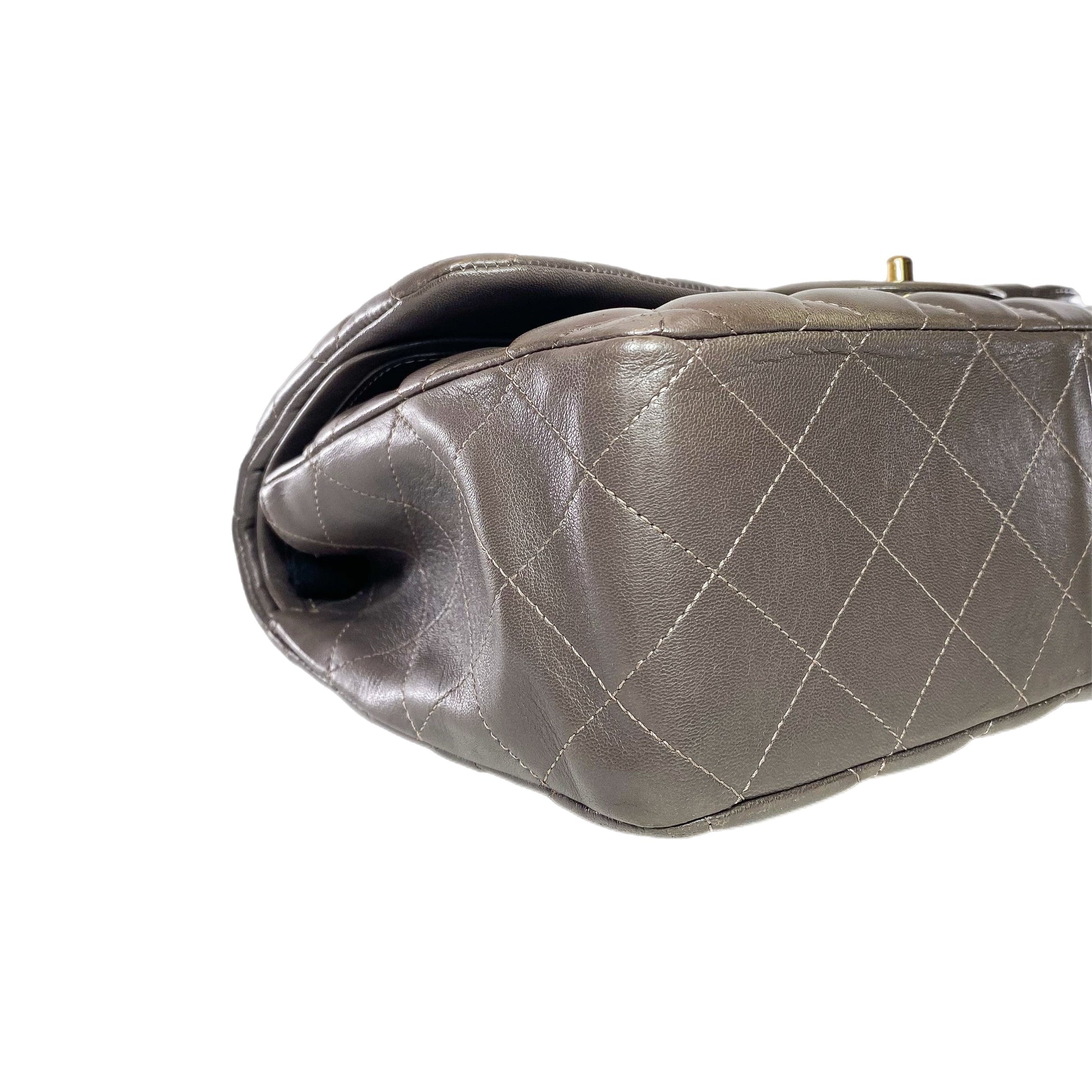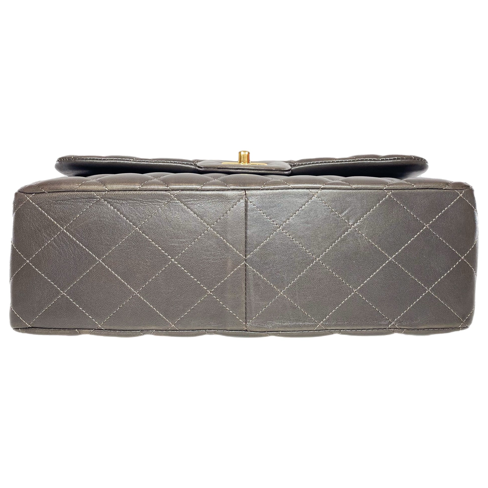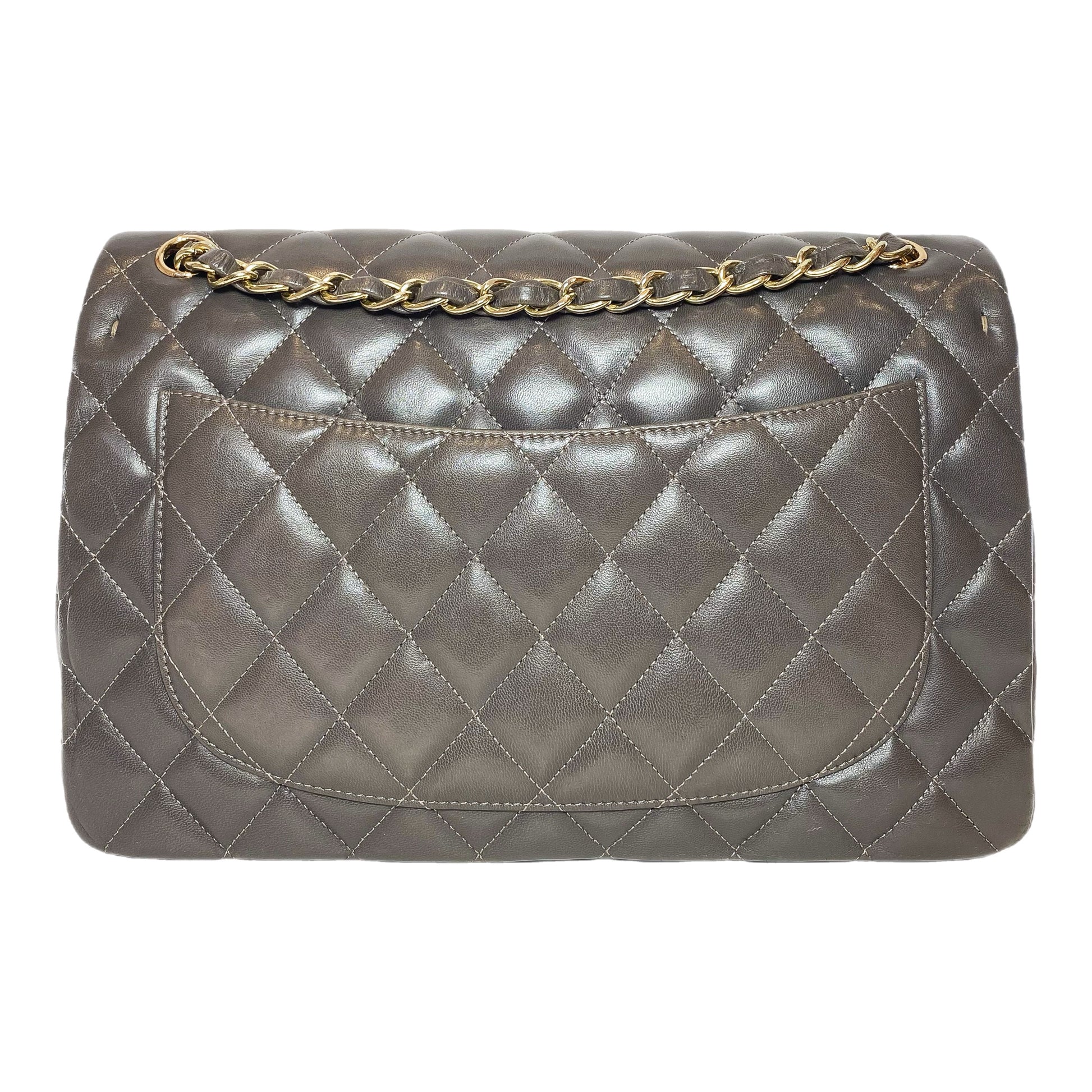 This is a Chanel Taupe Jumbo Flap Bag in lambskin leather with gold hardware. This chic handbag features a 20-inch strap, a rear pocket, and a CC turn lock closure. The front flap opens to a taupe leather lined interior that features two patch pockets. This is an amazing handbag for any occasion!