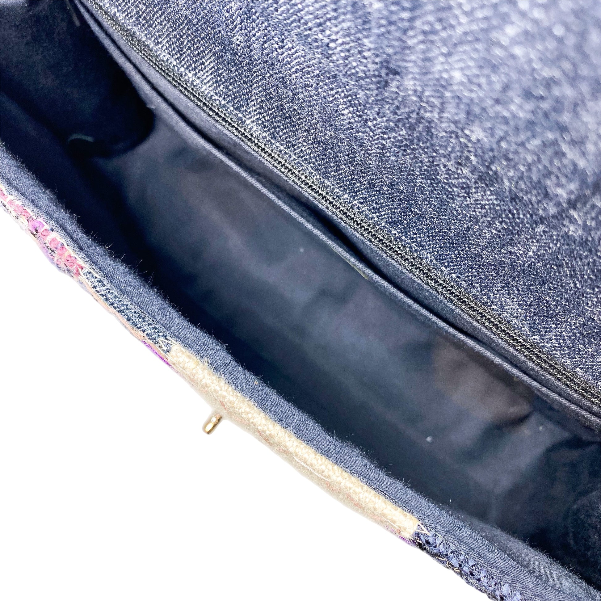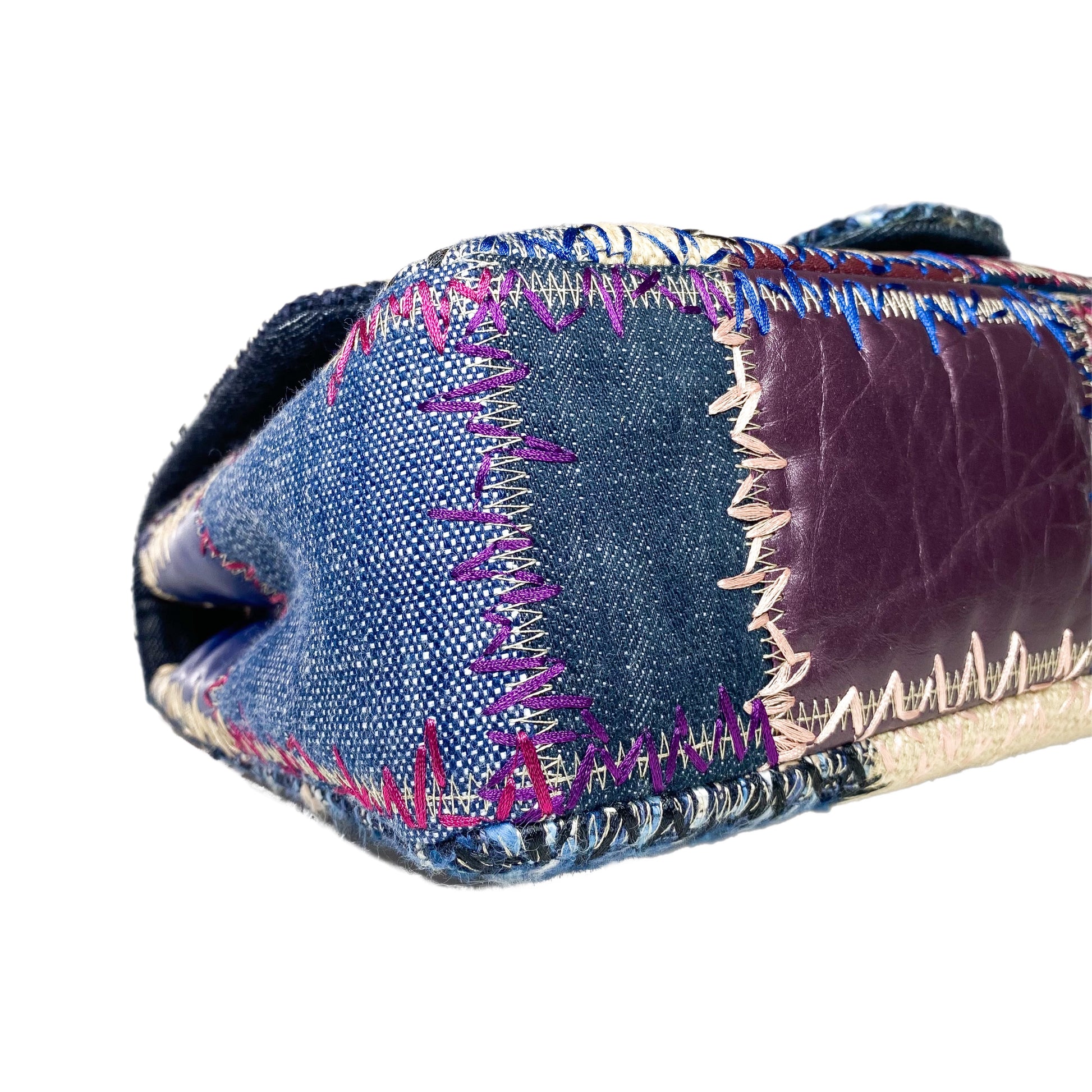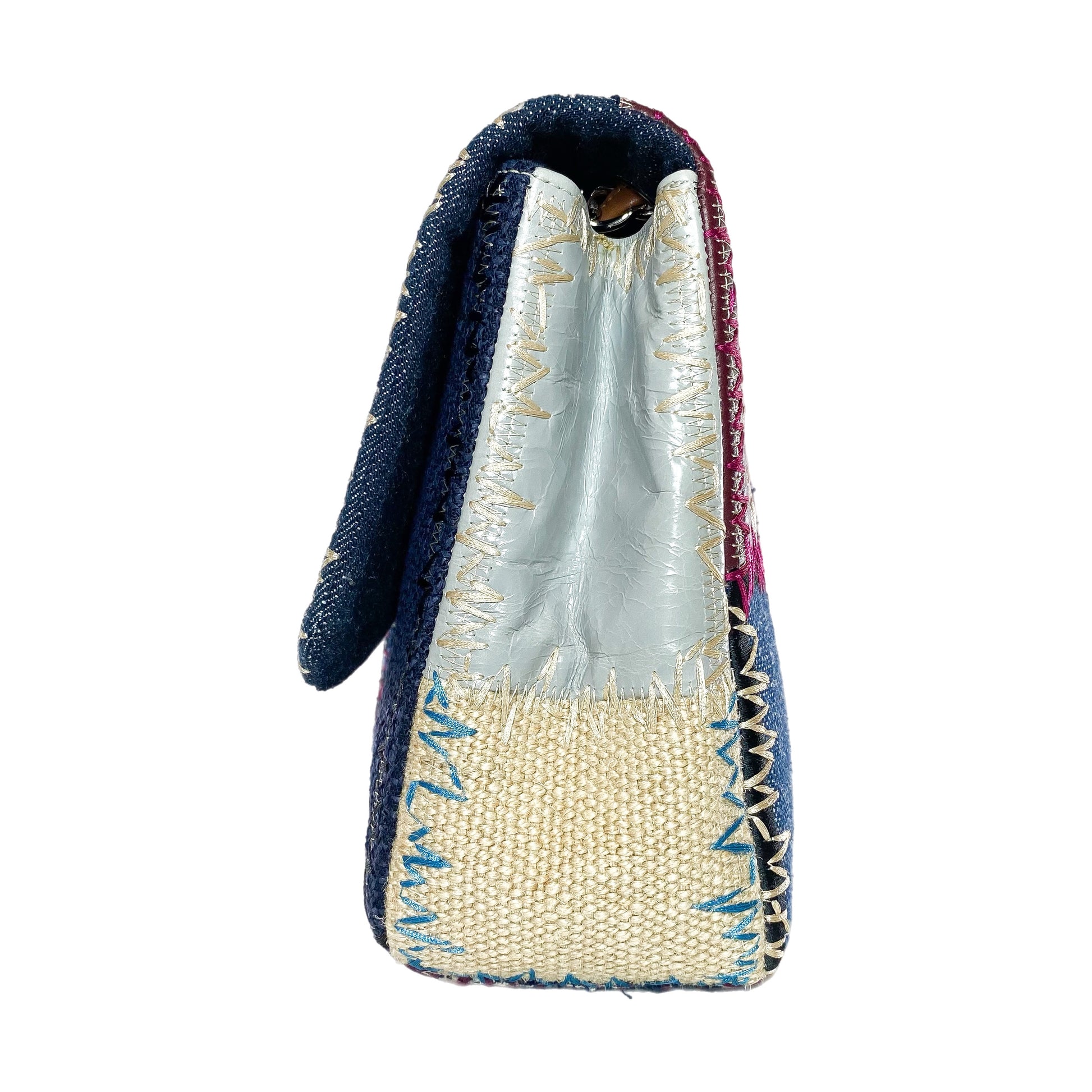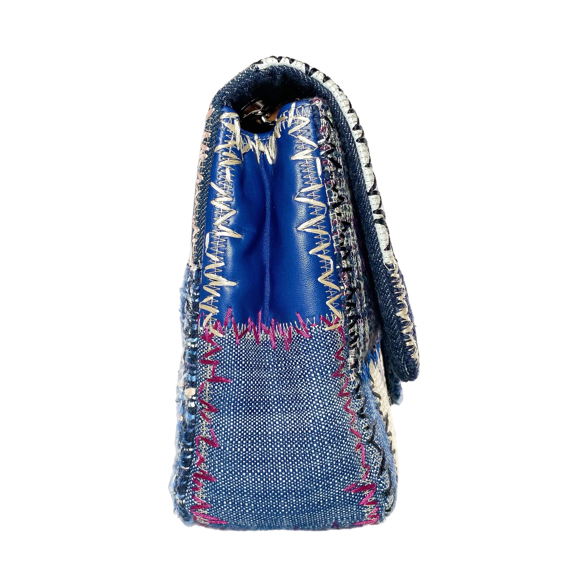 This is a Chanel Timeless Patchwork Multicolor Single Flap Bag in denim and tweed with silver hardware. This chic single flap features multicolor denim and tweed patchwork, a 19-inch strap, and a CC turn lock closure. The front flap opens to a denim fabric lined interior that features a patch pocket and a zipper pocket. This flag bag is an amazing accessory for any outfit!