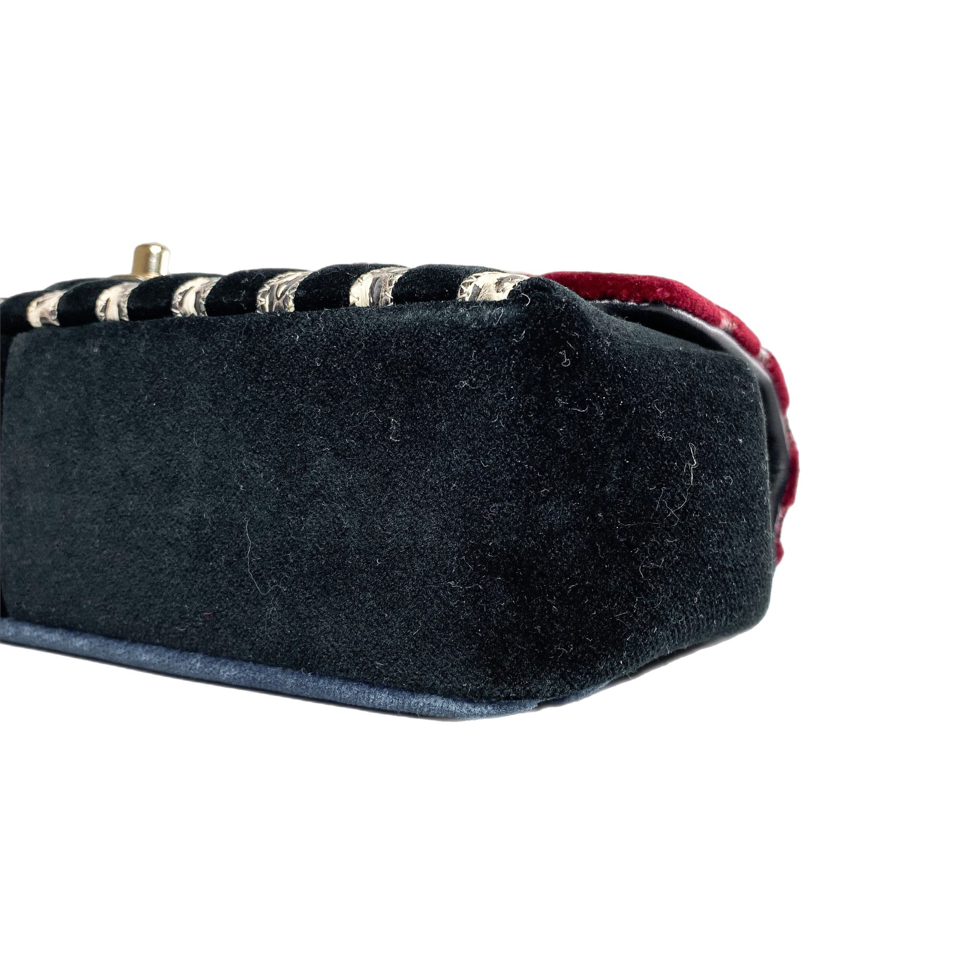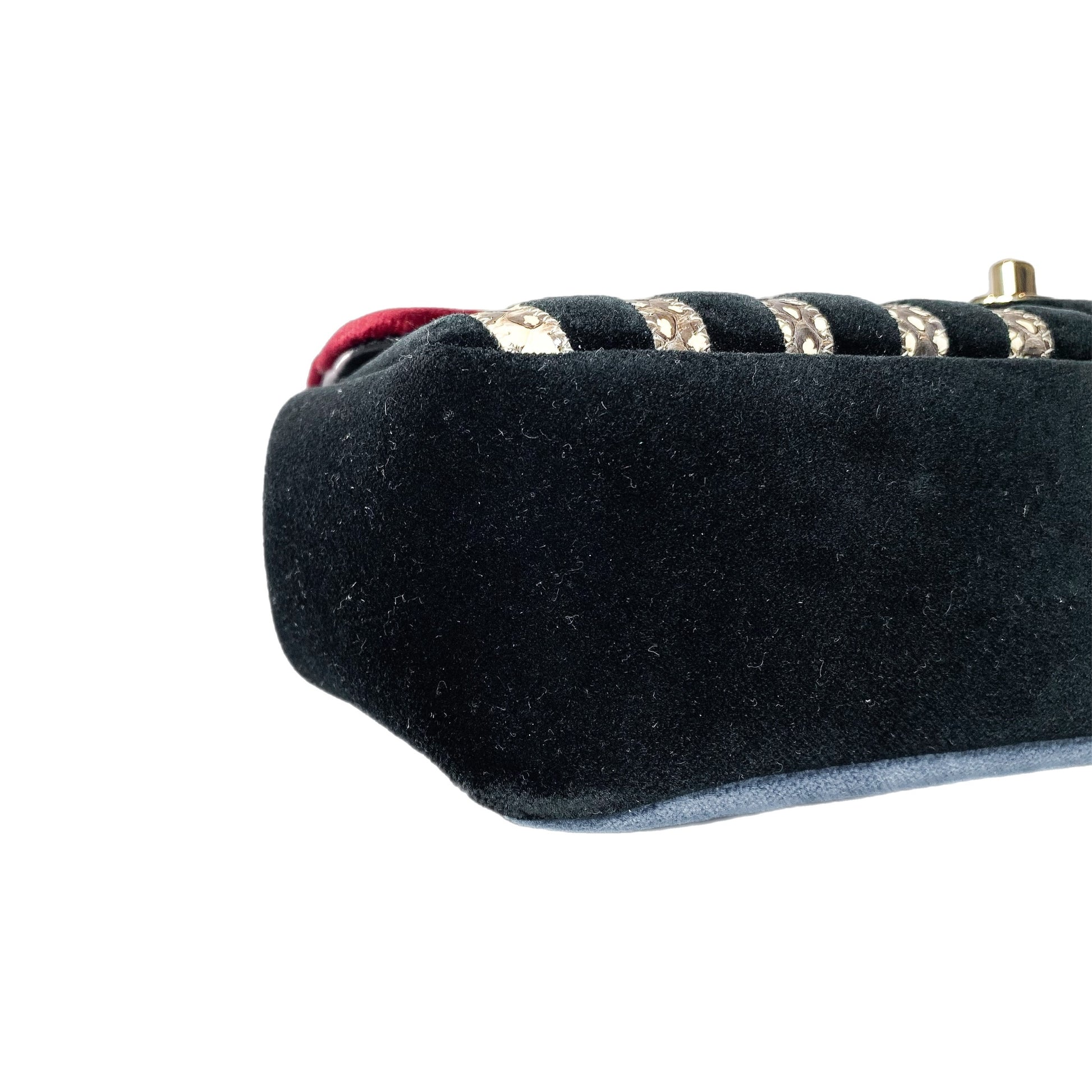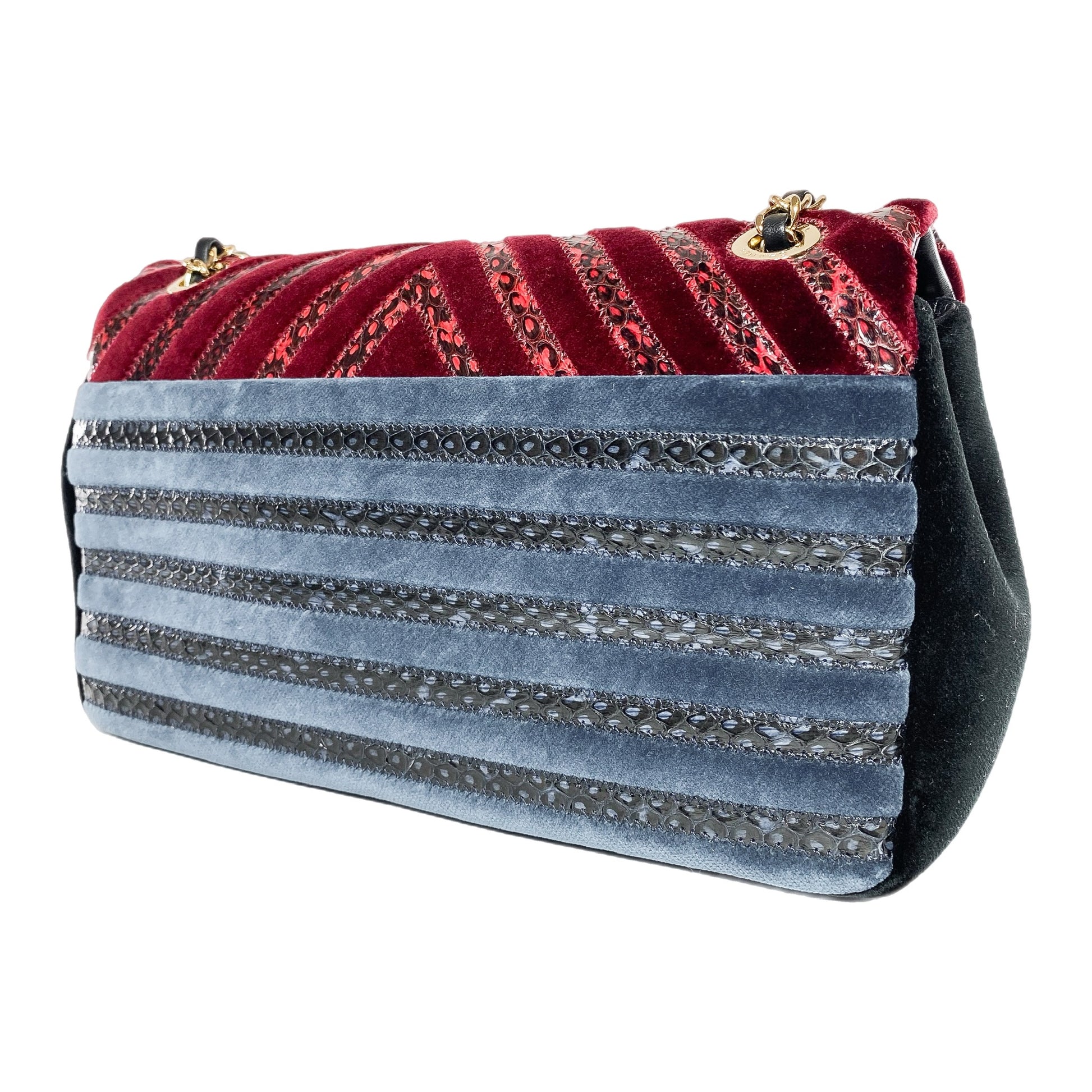 This is a Chanel Red and Black Limited Edition Flap Bag in velvet and python skin with gold hardware. This chic flap bag features a 20-inch strap, a rear pocket, and a turn lock closure. The front flap opens to a burgundy fabric lined interior that features a zipper pocket. This is a wonderful handbag for Fall and Winter!