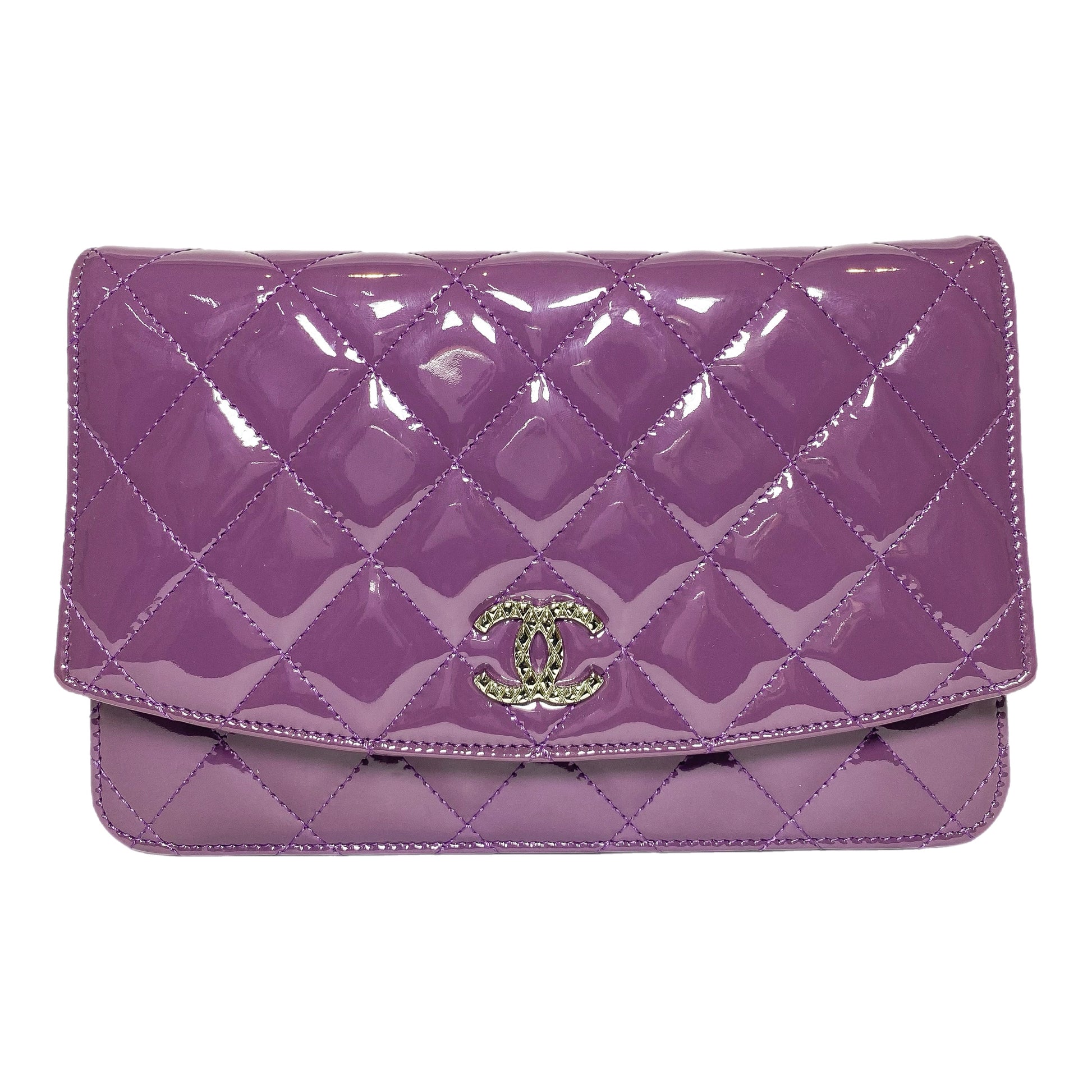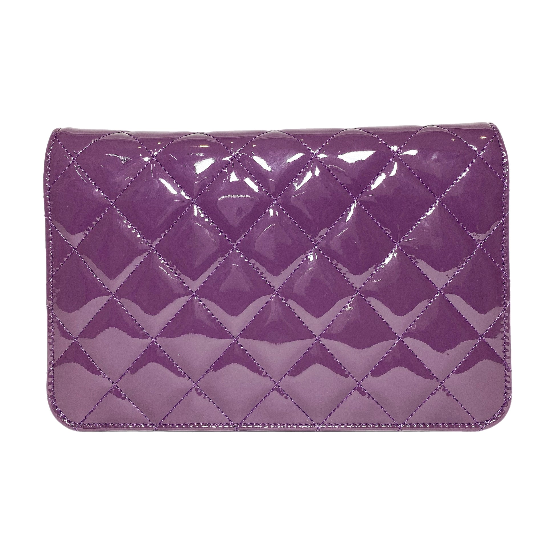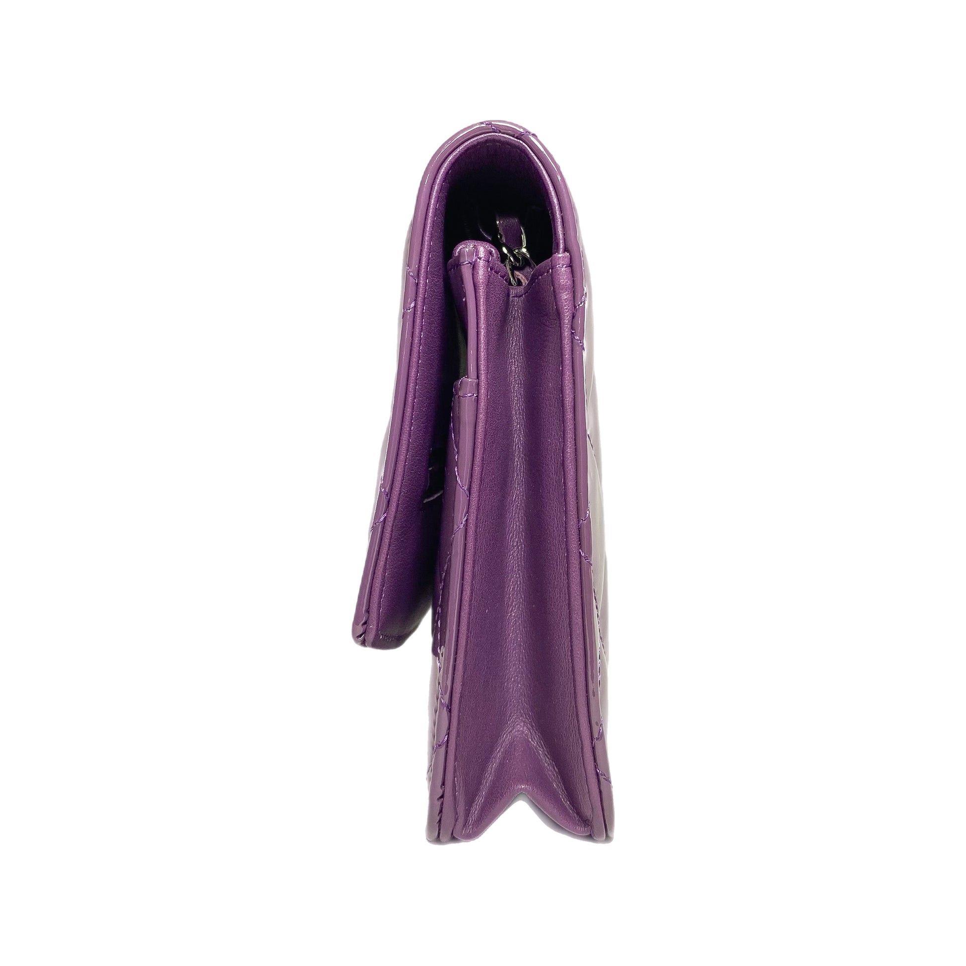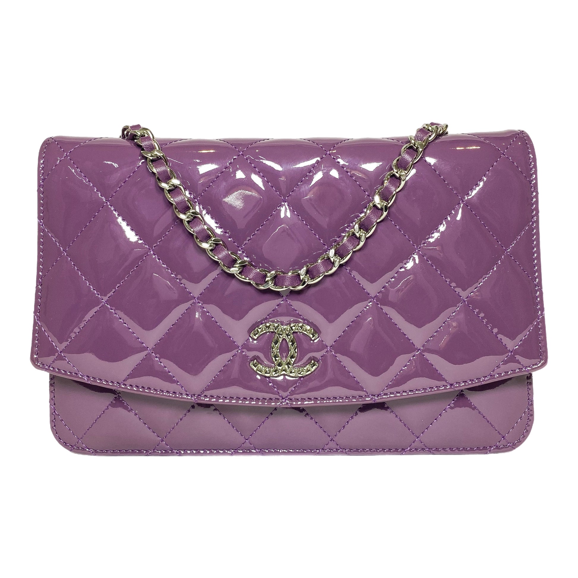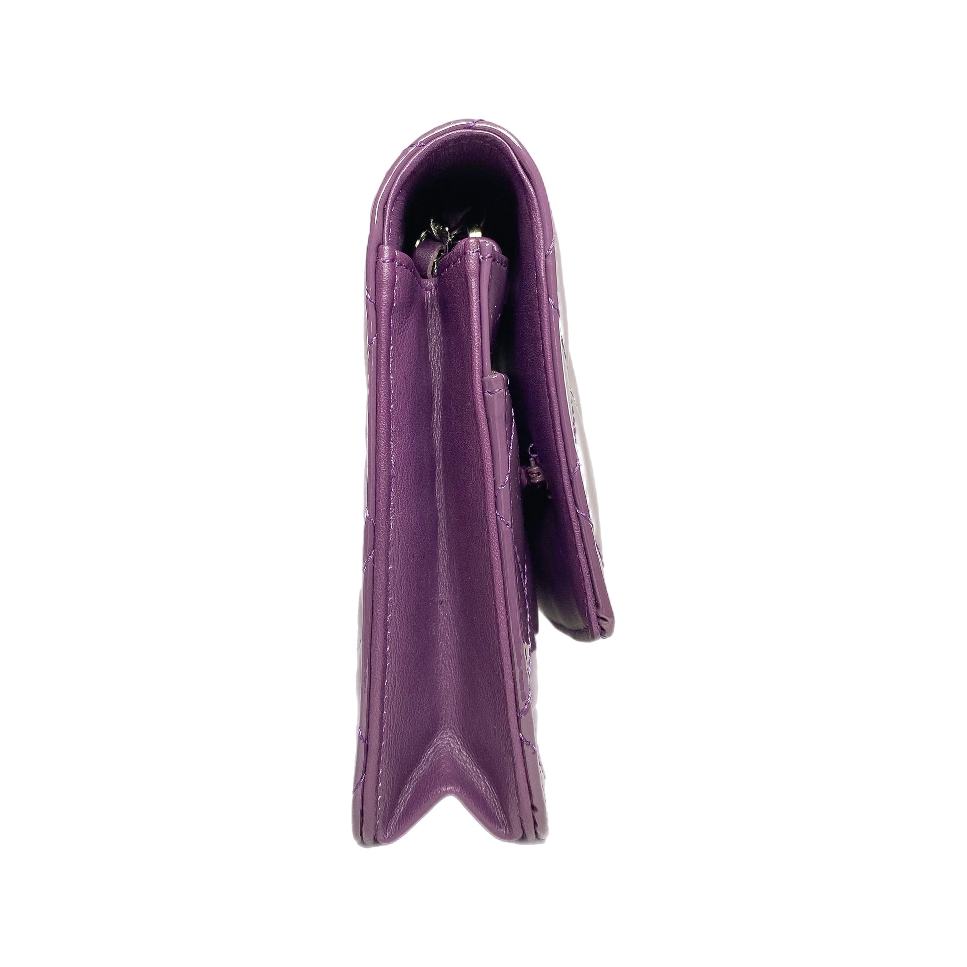 This is a Chanel Violet Brilliant Wallet on Chain in patent leather with silver hardware. This chic wallet on chain features a 24.5-inch strap, a textured “CC”, and a snap closure. The front flap opens to a silver fabric lined interior that features a patch pocket, a zipper pocket, and card slots. This is a stellar Wallet on Chain for any occasion!