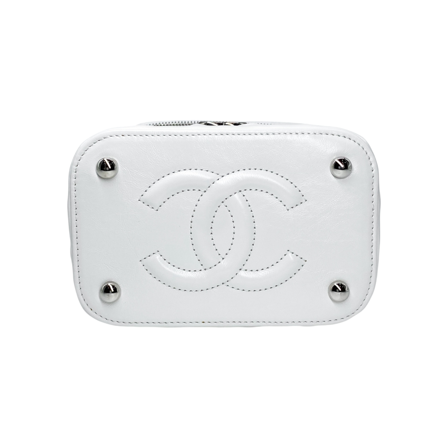 This is a Chanel Vanity Bag in white and beige raffia with smooth calfskin and silver hardware. This chic handbag features a structured rectangular shape, a top handle, a strap, and a zip-around closure. Its white raffia construction offers an elevated, contemporary look while maintaining timeless Chanel charm!