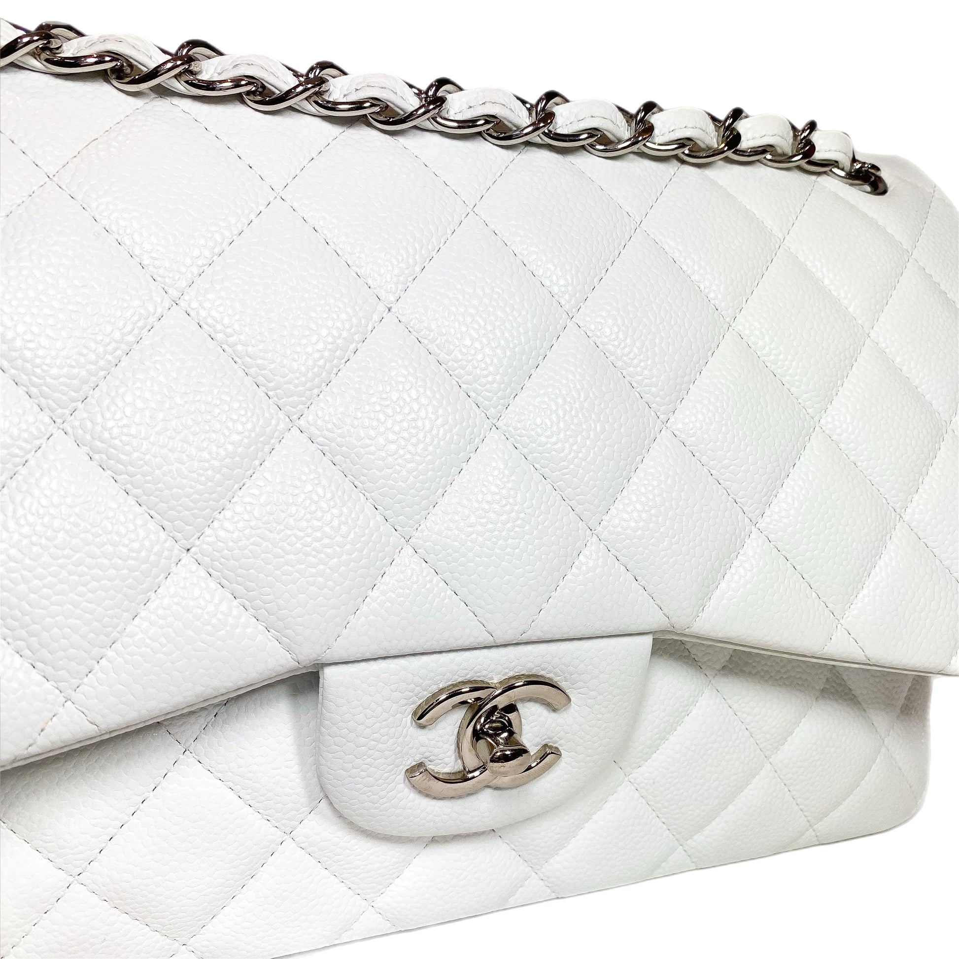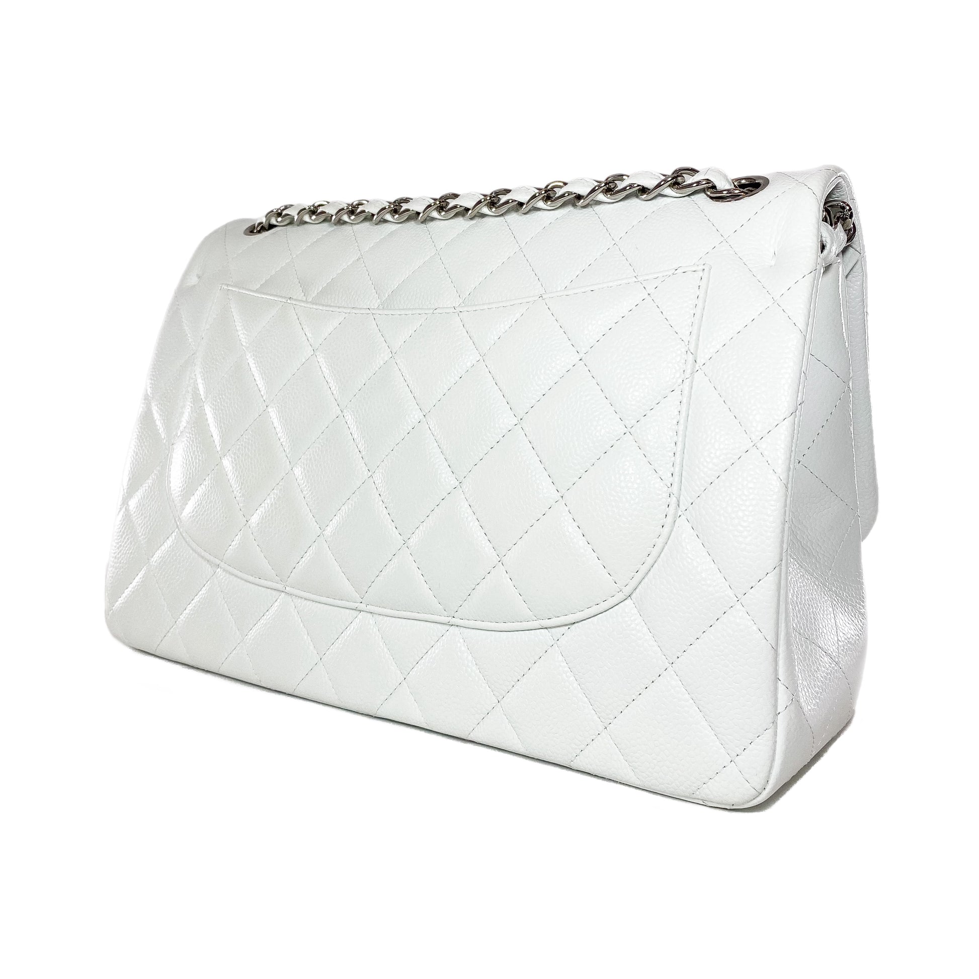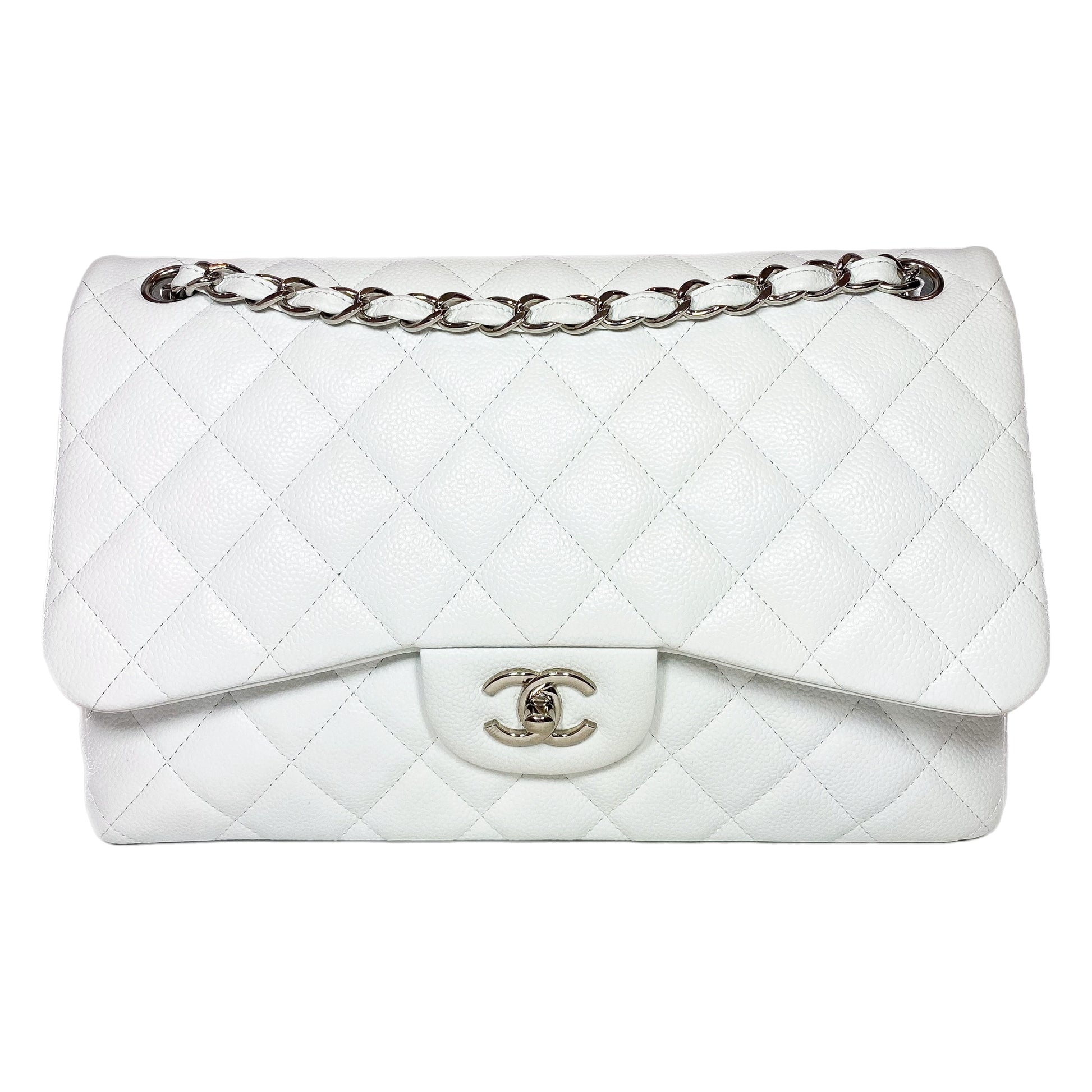 This is a Chanel White Jumbo Double Flap Bag in caviar leather with silver hardware. This stylish flap bag features a 24-inch strap, a rear exterior pocket, and the iconic Chanel CC turn lock. The front flap opens to a white leather lined interior that features two patch pockets. This is a stellar everyday handbag!