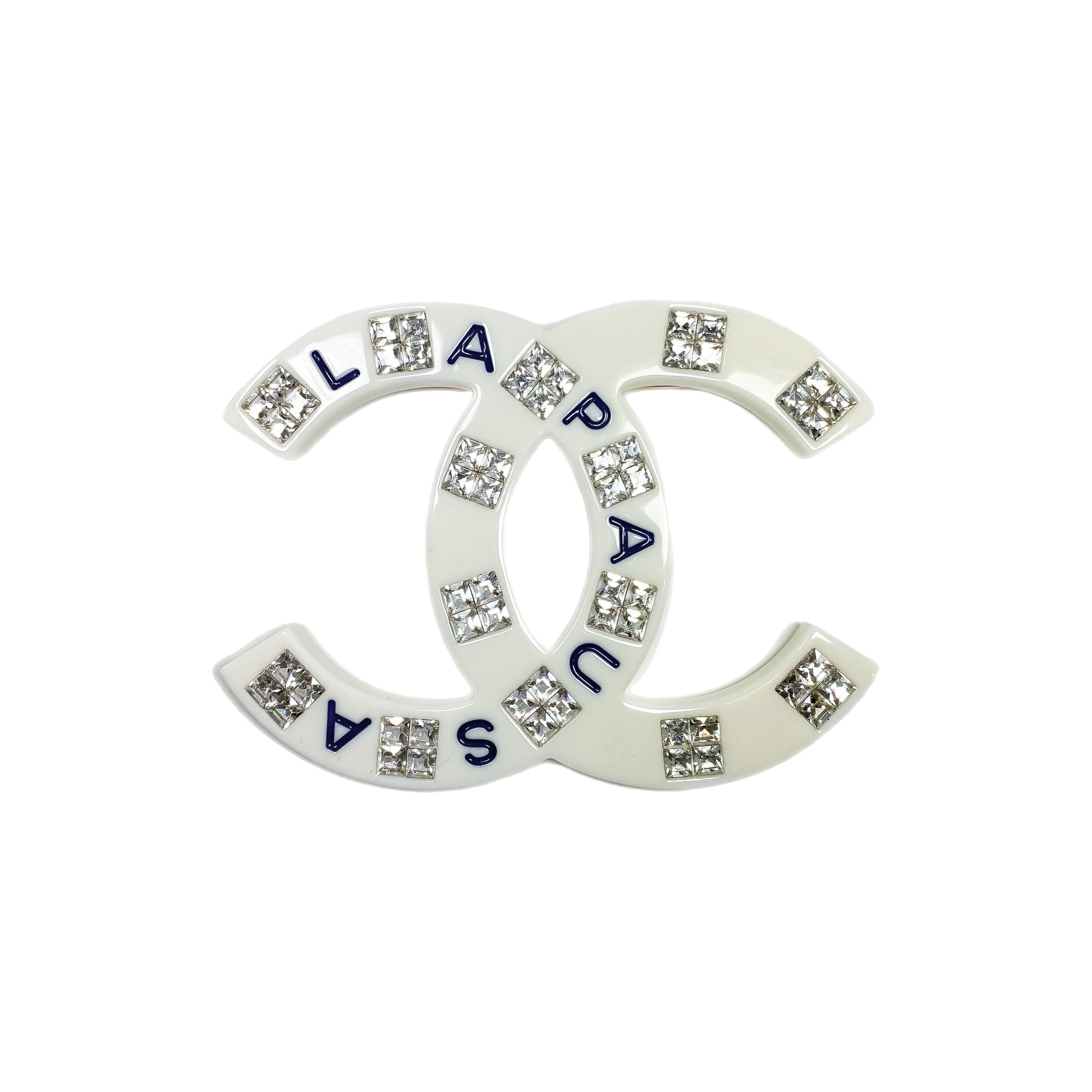 This is a Chanel White La Pause Crystal Brooch in resin with silver hardware. This stylish brooch features crystals and “LA PAUSA” written on the front. This is a wonderful accessory for any occasion!