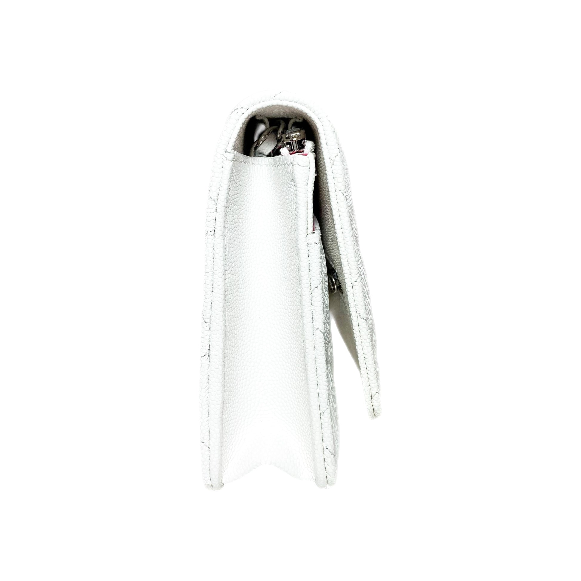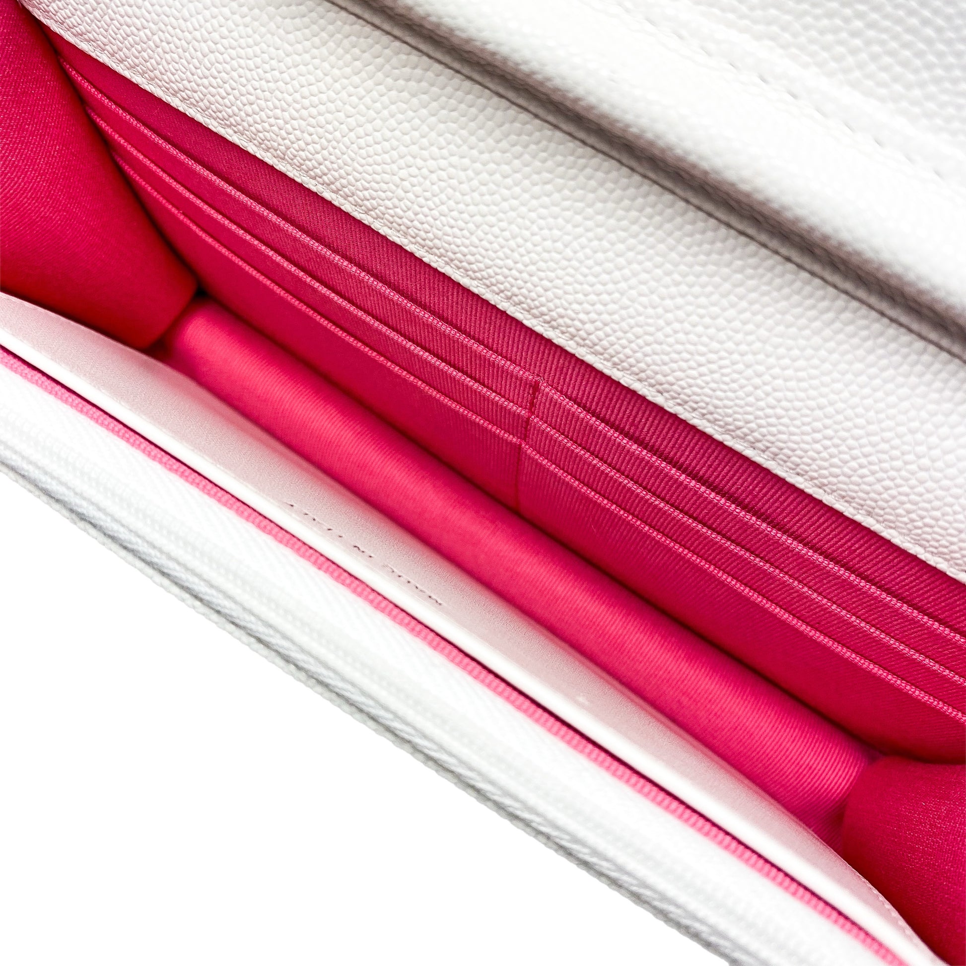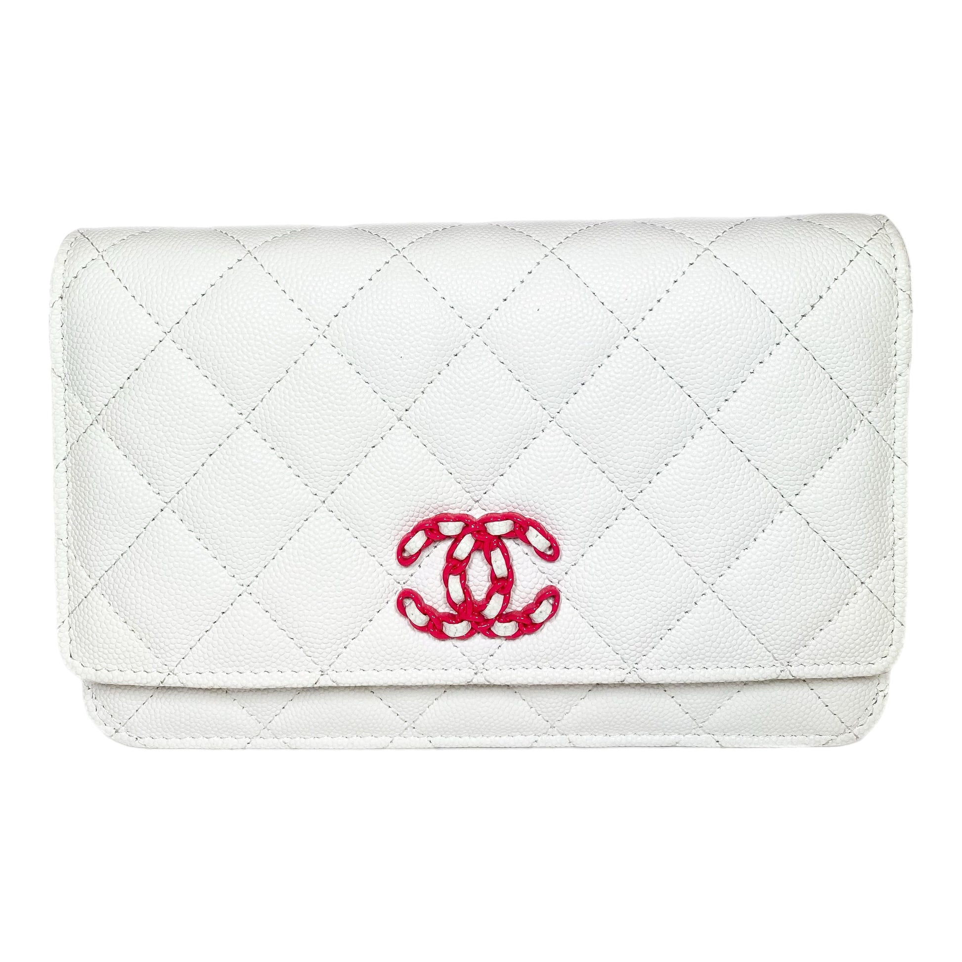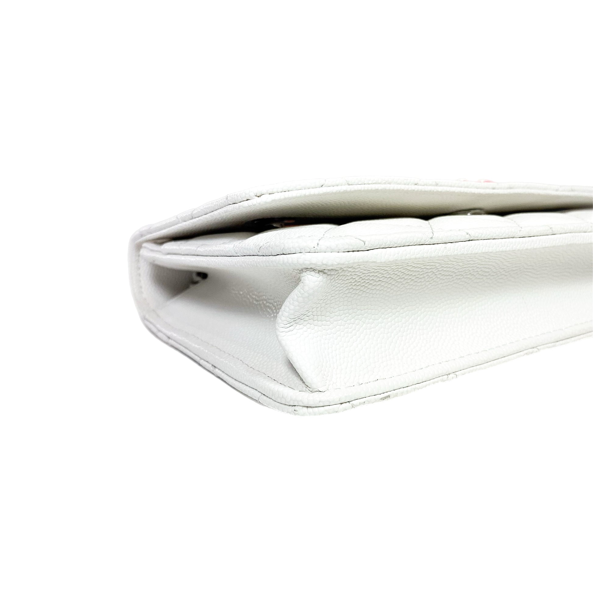 This is a Chanel White and Pink Woven CC Wallet on Chain in caviar leather with silver hardware. This stylish WOC features a 23-inch strap, a pink and white woven “CC,” and a rear pocket. The front flap opens to a pink fabric lined interior that features card slots, a patch pocket, and a zipper pocket. This is a wonderful accessory for everyday use!