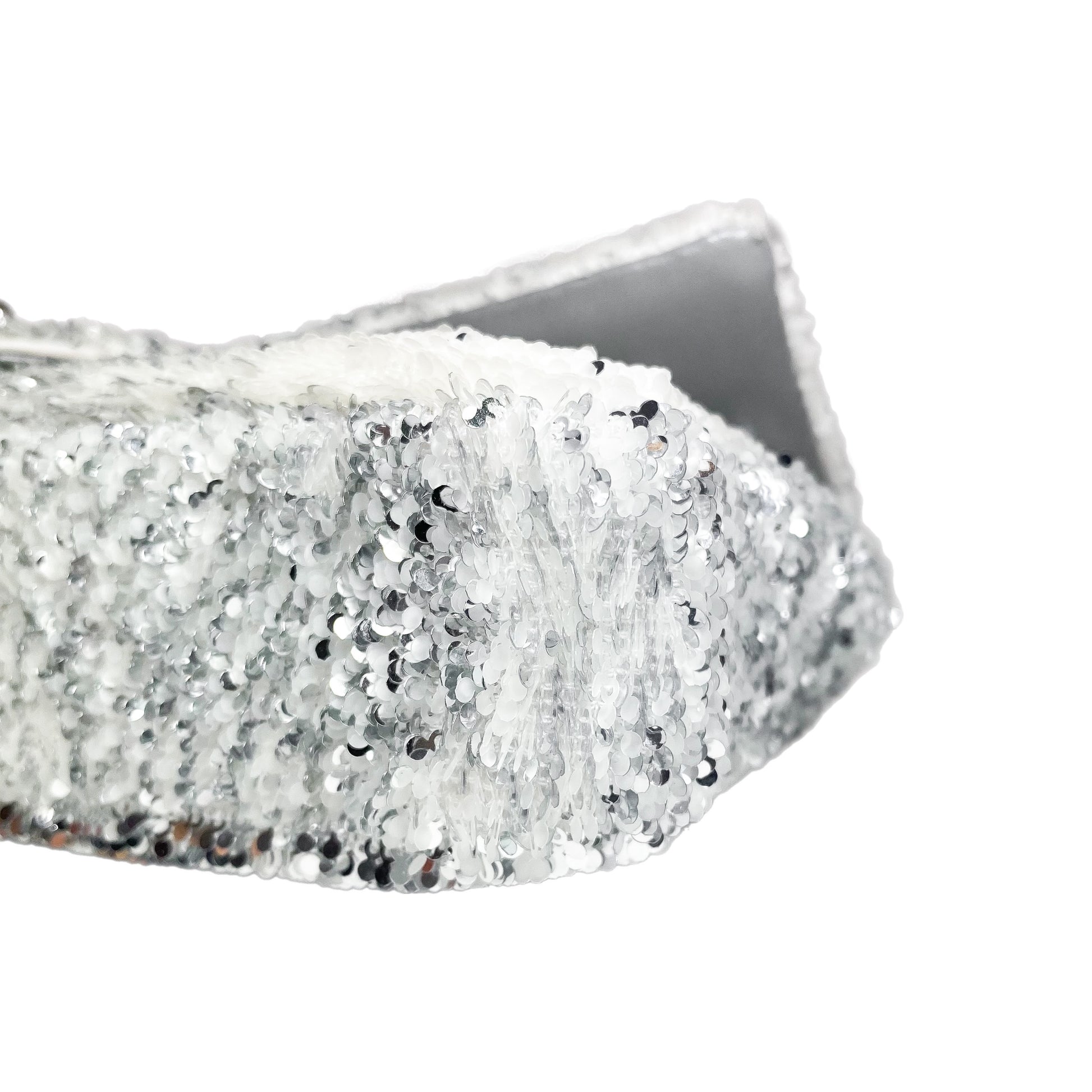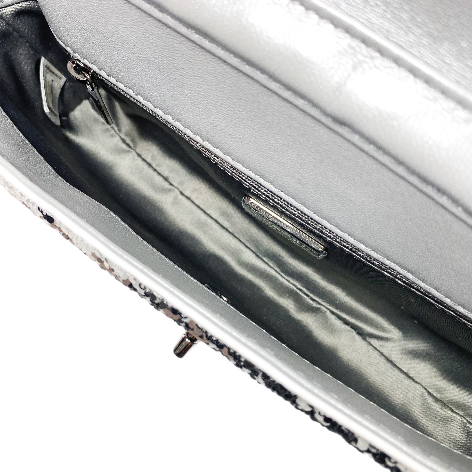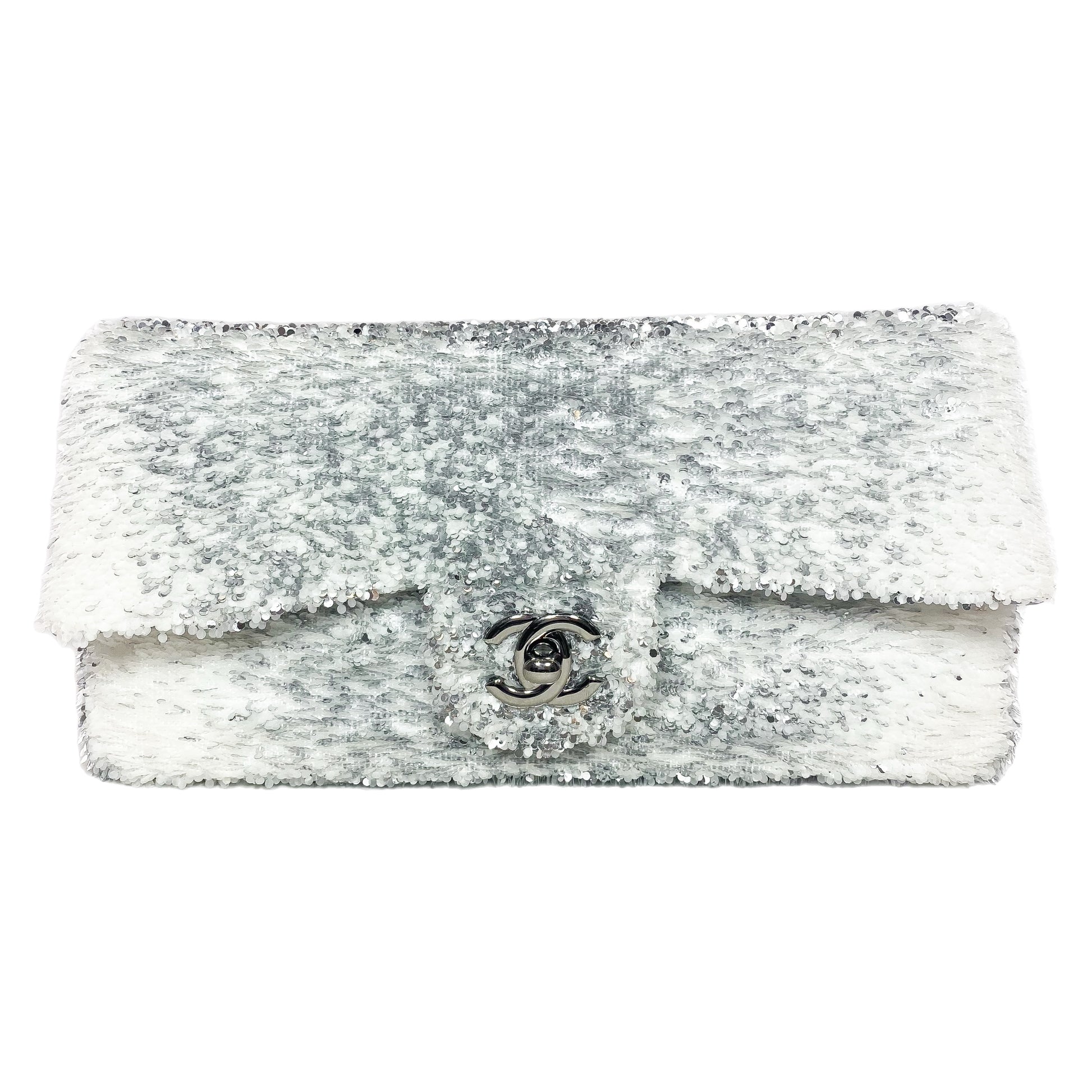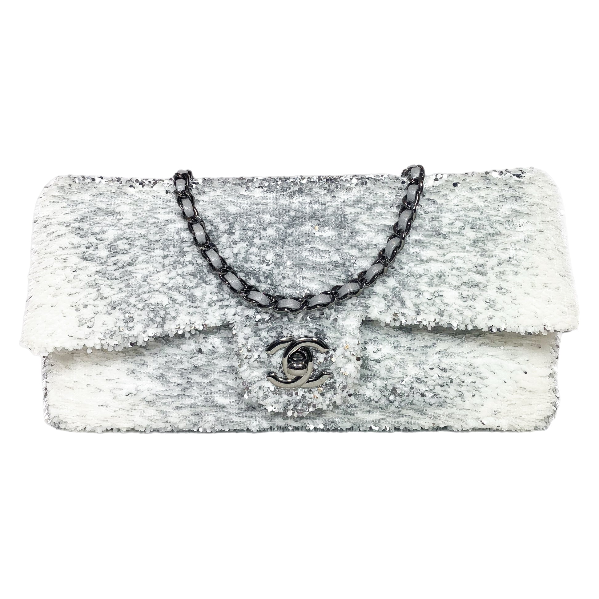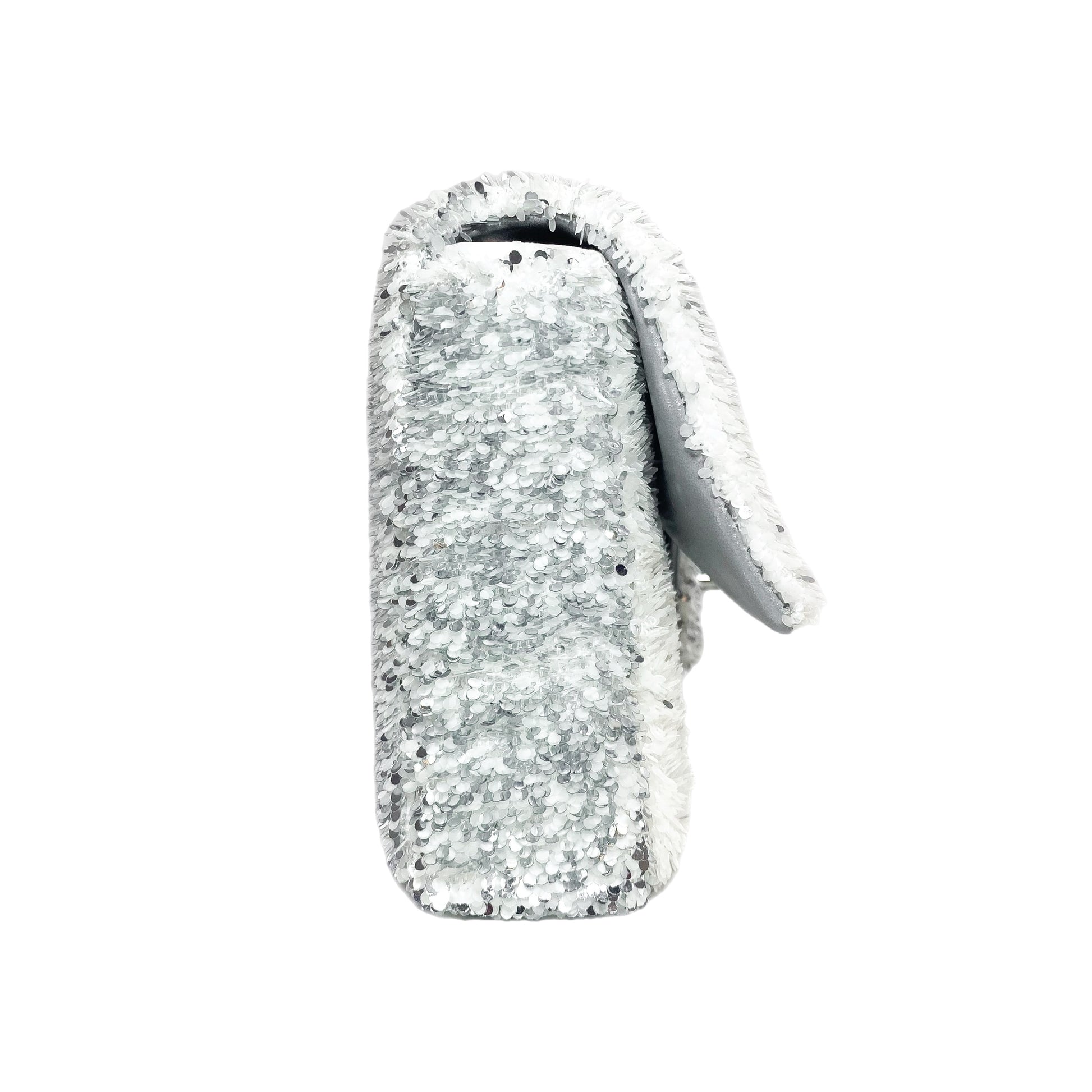 This is a Chanel White and Silver Sequin Flap Bag in sequin embellished lambskin leather and ruthenium hardware. This chic flap bag features a 21-inch strap and a “CC” turn lock closure. The front flap opens to a dark gray satin lined interior that features a zipper pocket. This is a stellar handbag for any occasion!