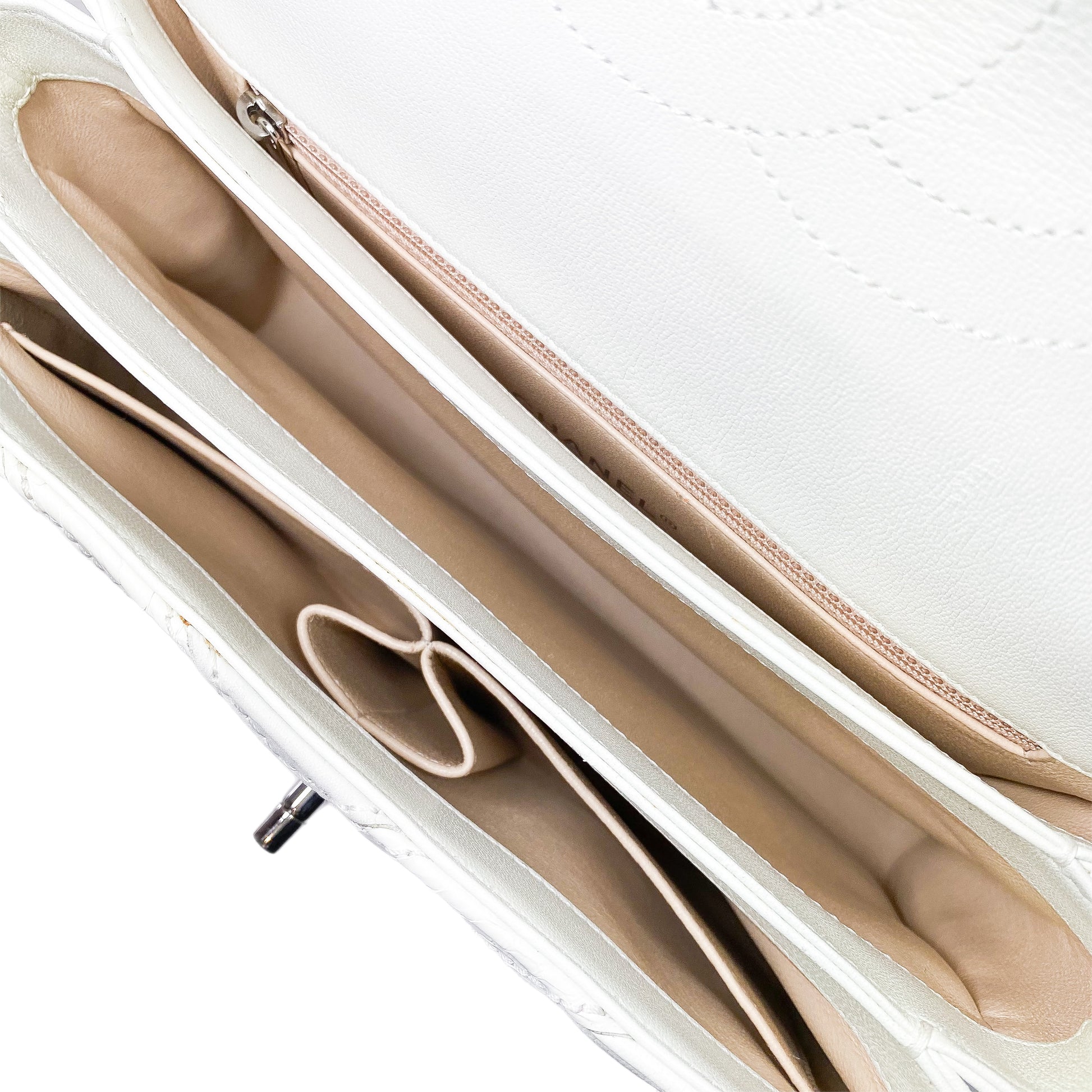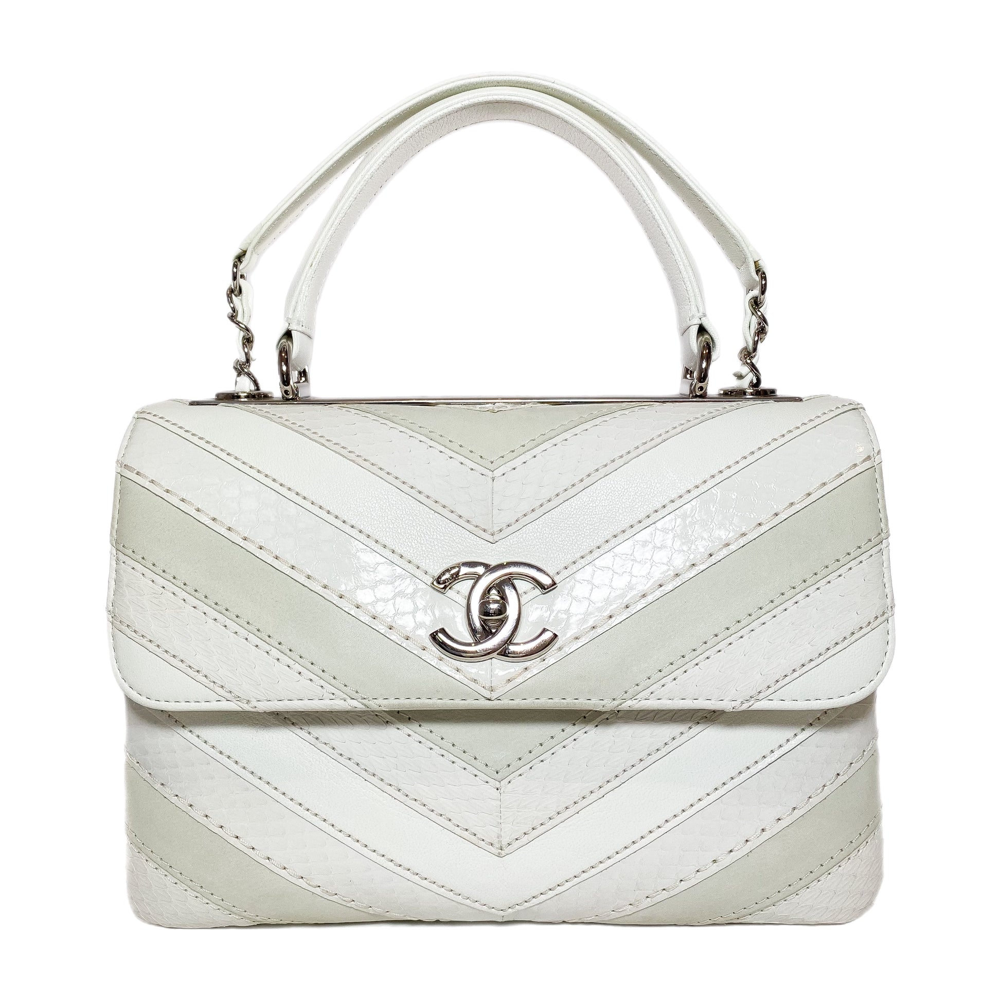This is a Chanel White Watersnake Chevron Quilted CC Trendy in calfskin, sheepskin, and watersnake leather with silver hardware. This chic Trendy features a 4.25-inch top handle, a 19.5-inch strap, a rear exterior pocket, and a silver bar with the “CHANEL” logo on the top of the handbag. A CC turn lock opens to a beige partitioned leather lined interior that features two patch pockets and a zipper pocket. This is an amazing handbag for everyday use!