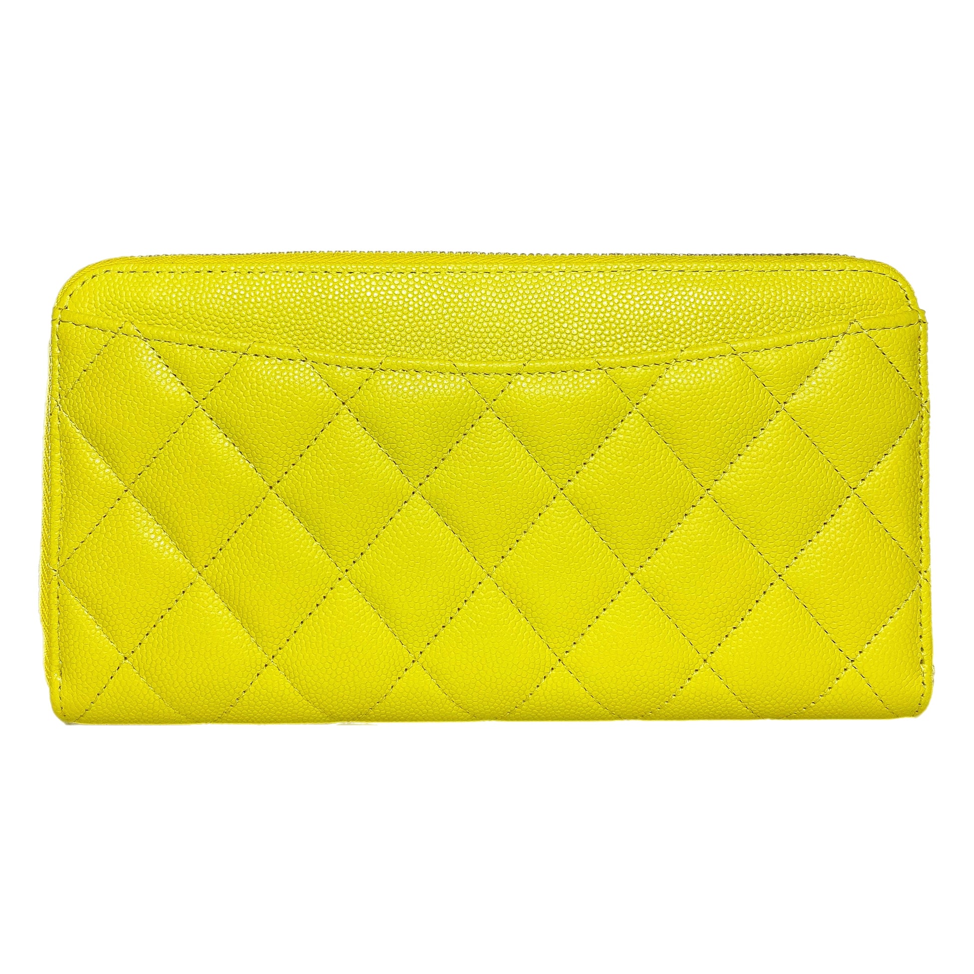 This is a Chanel Quilted Large Gusset Zip Around Wallet in caviar leather with light gold hardware. This chic wallet features a CC on the front, a rear pocket, and a wrap-around zipper. The yellow leather interior is partitioned and features a zipper compartment, patch pockets, and card-slots. This is a stellar wallet for a pop of color!