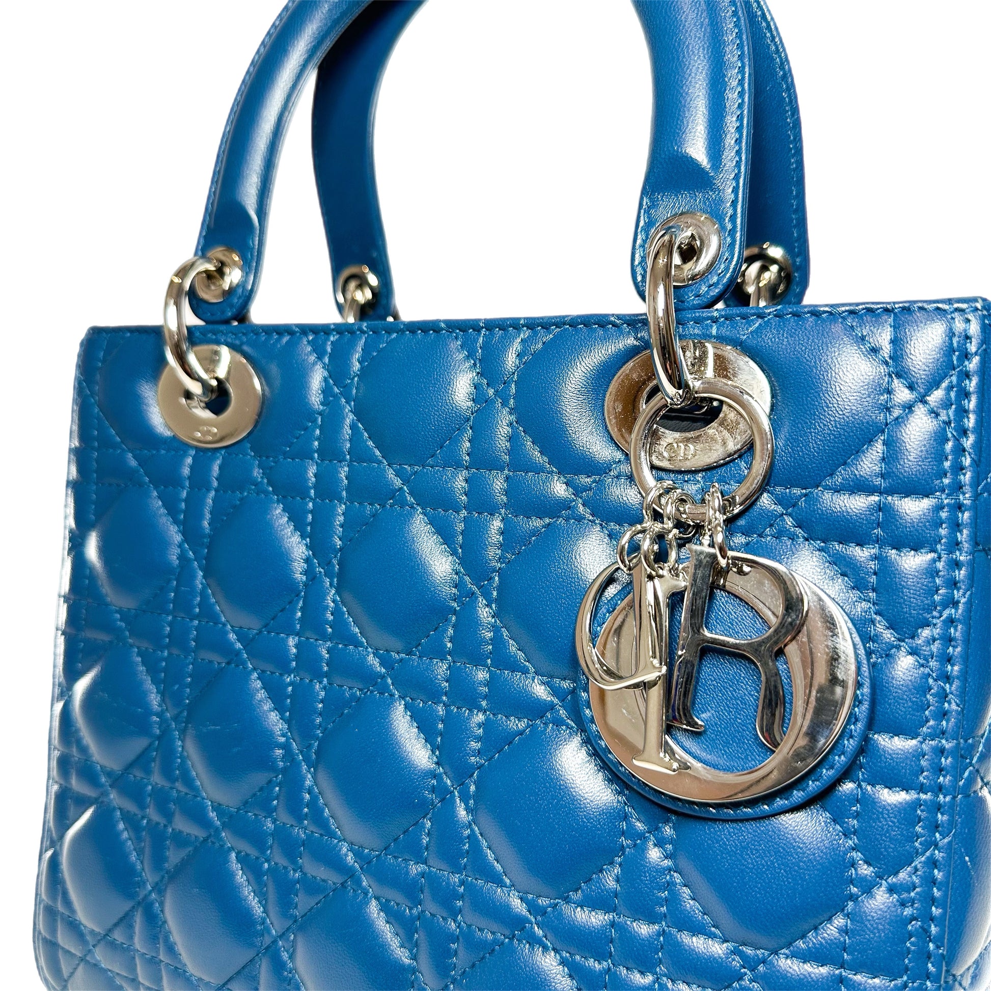 This is a Dior Blue Lady Dior with Crystal Strap in lambskin leather with silver hardware. This chic Lady Dior features two 3.75-inch top handles, a 21-inch strap, and hanging Dior charms. A top zipper opens to a light gray leather lined interior that features a zipper pocket. This is an amazing handbag for any occasion!