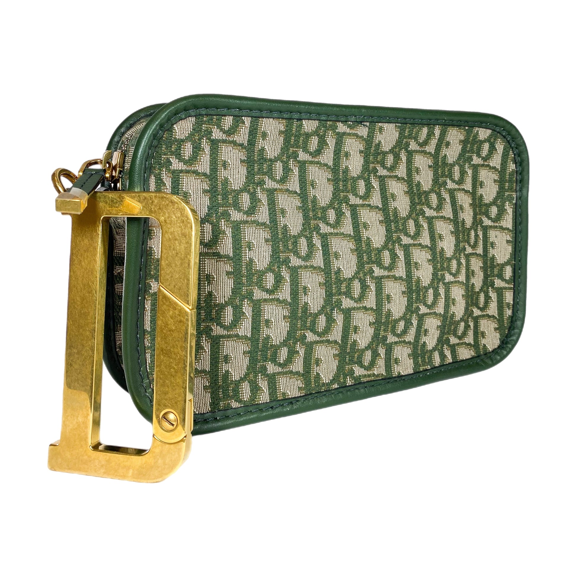 This is a Dior Diorquake Green Oblique Clutch in monogram canvas with gold hardware. This stylish clutch features a “D” charm and a top zipper. The interior is lined in beige canvas that features a patch pocket. This is a wonderful clutch for any occasion!