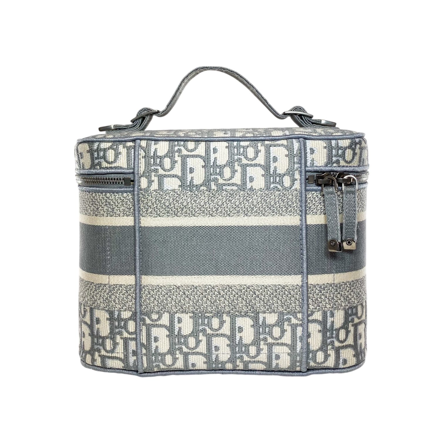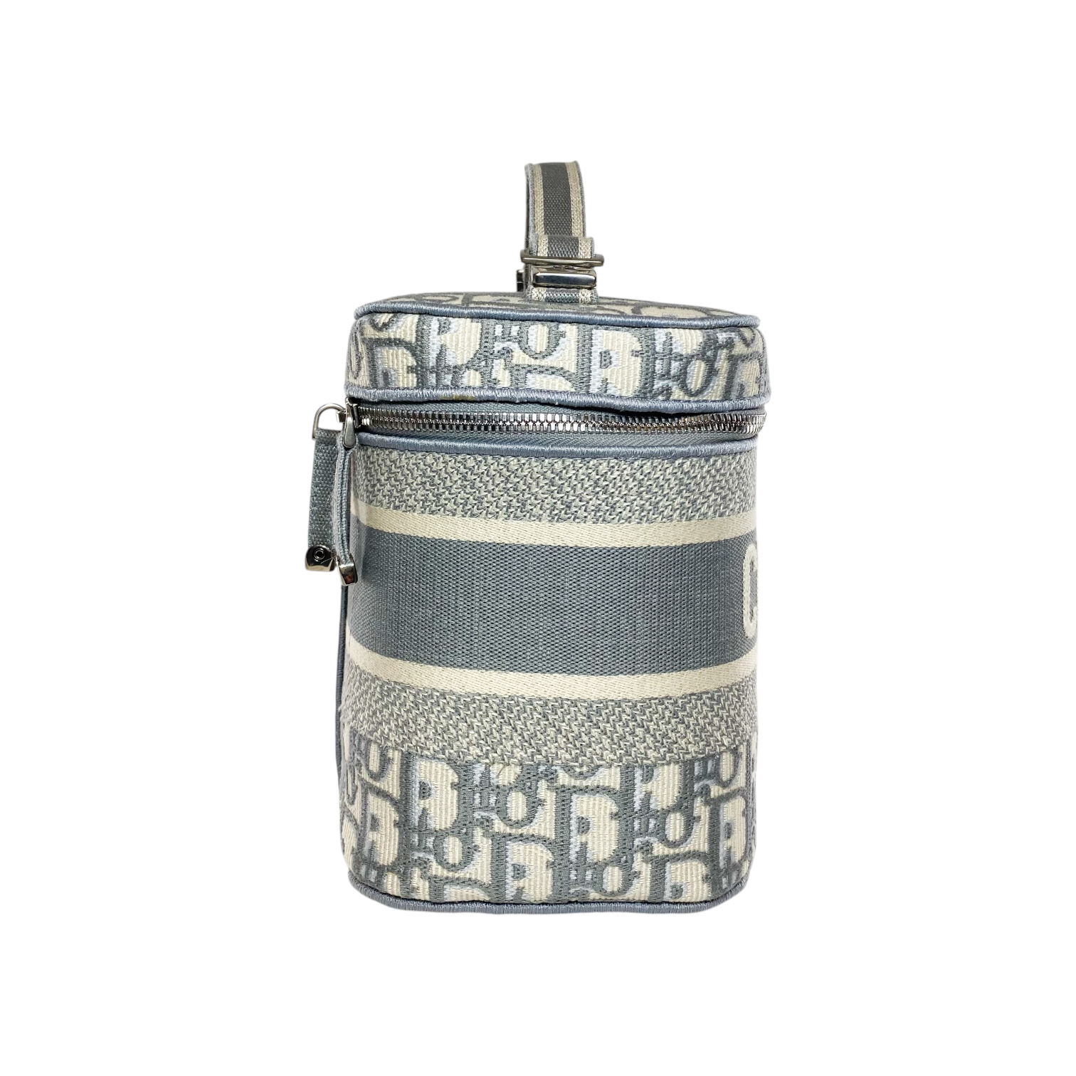 This is a Dior DiorTravel Grey Embroidered Vanity in canvas with silver hardware. This stylish vanity features a 2.25-inch top handle and a zipper closure. The interior is lined in grey canvas and features a patch pocket. This is an amazing vanity for your travel necessities!