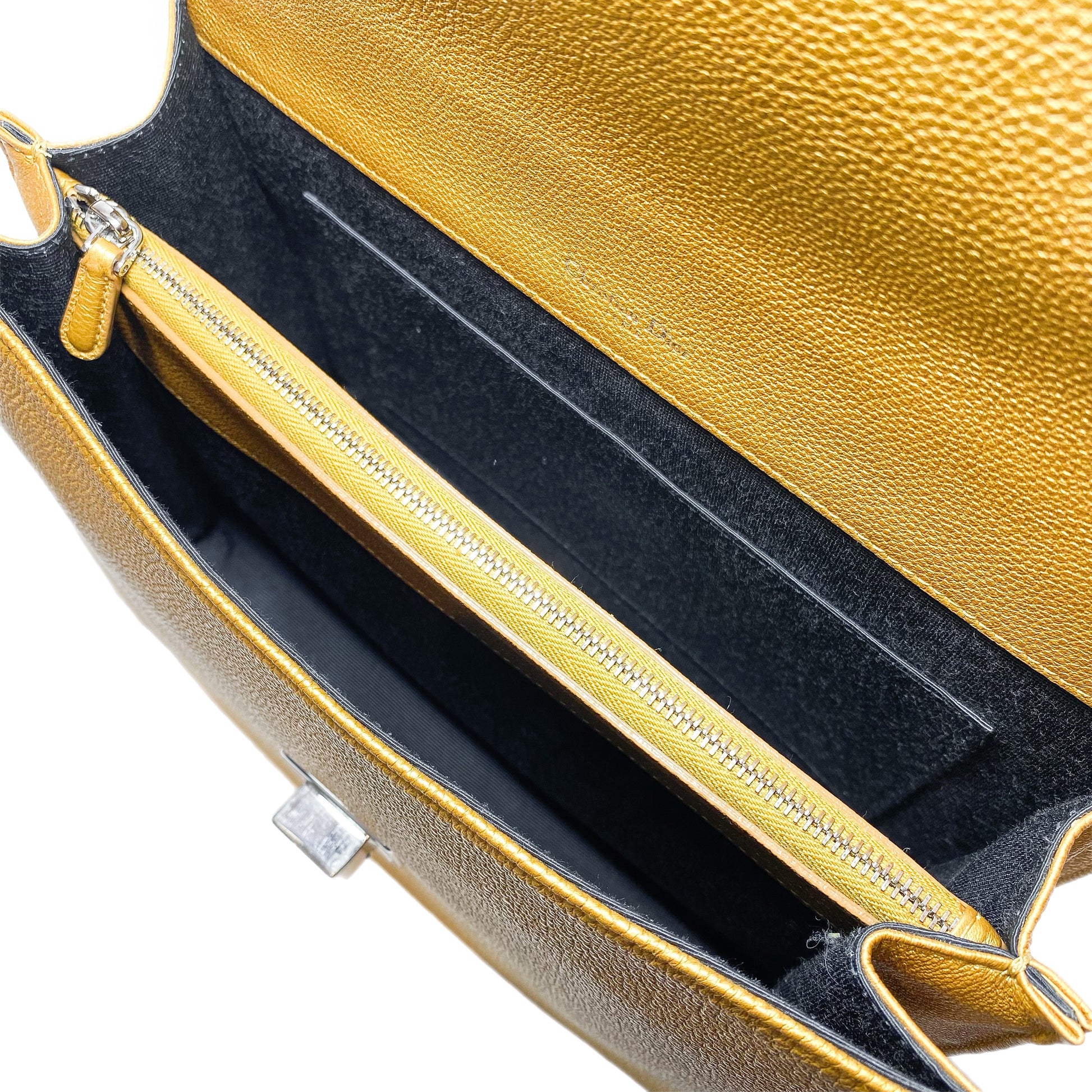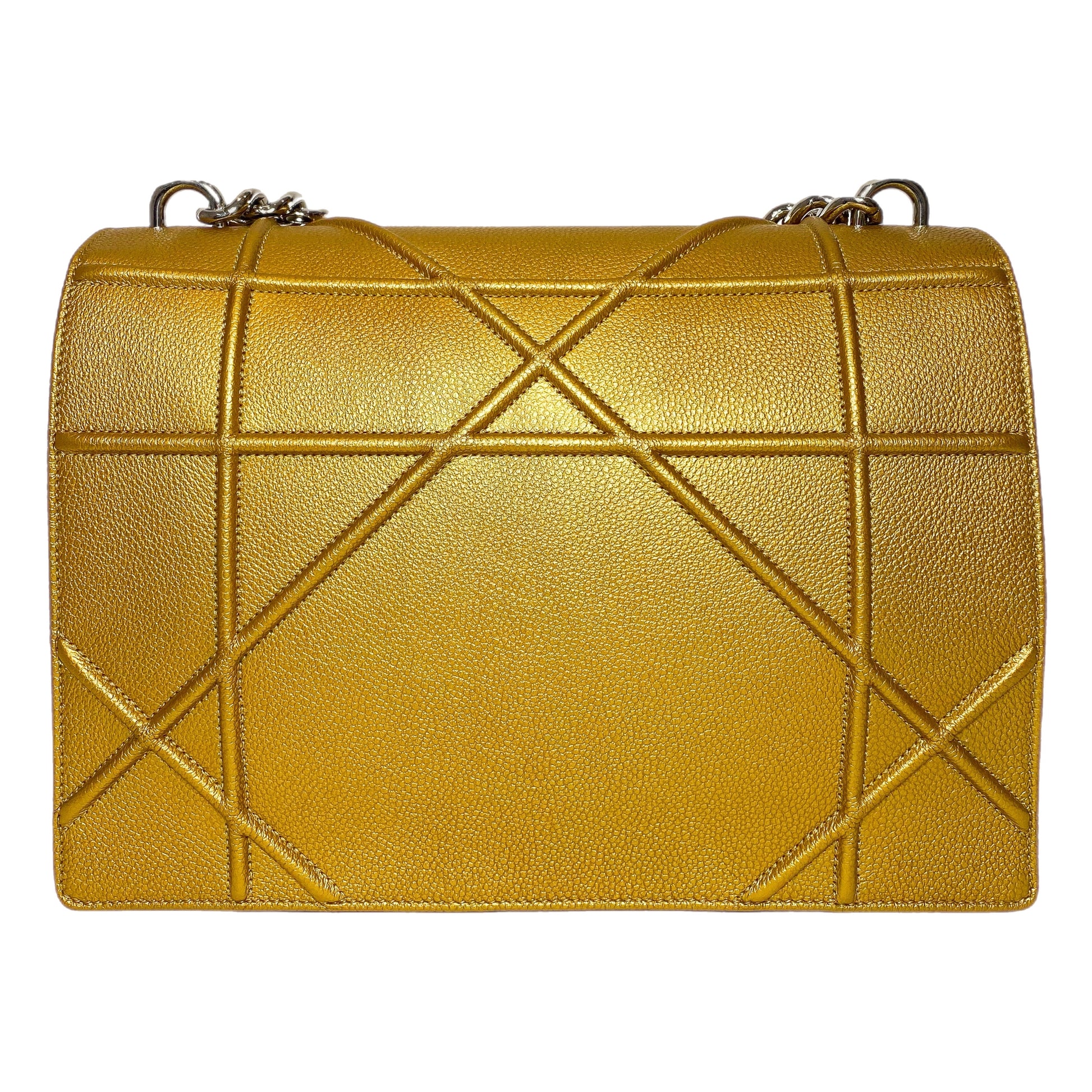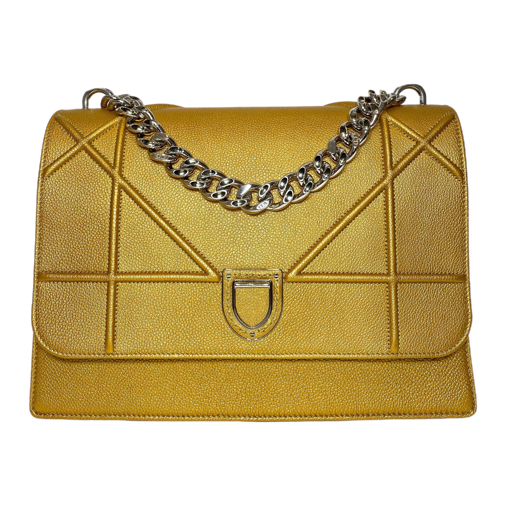 This is a Dior Gold Diorama in grained calfskin with silver hardware. This stylish handbag features a 4-inch chain top handle, a 20-inch detachable strap, and a press lock closure. The front flap opens to a partitioned black fabric lined interior that features three patch pockets and a zipper compartment. This is an amazing handbag for any occasion!