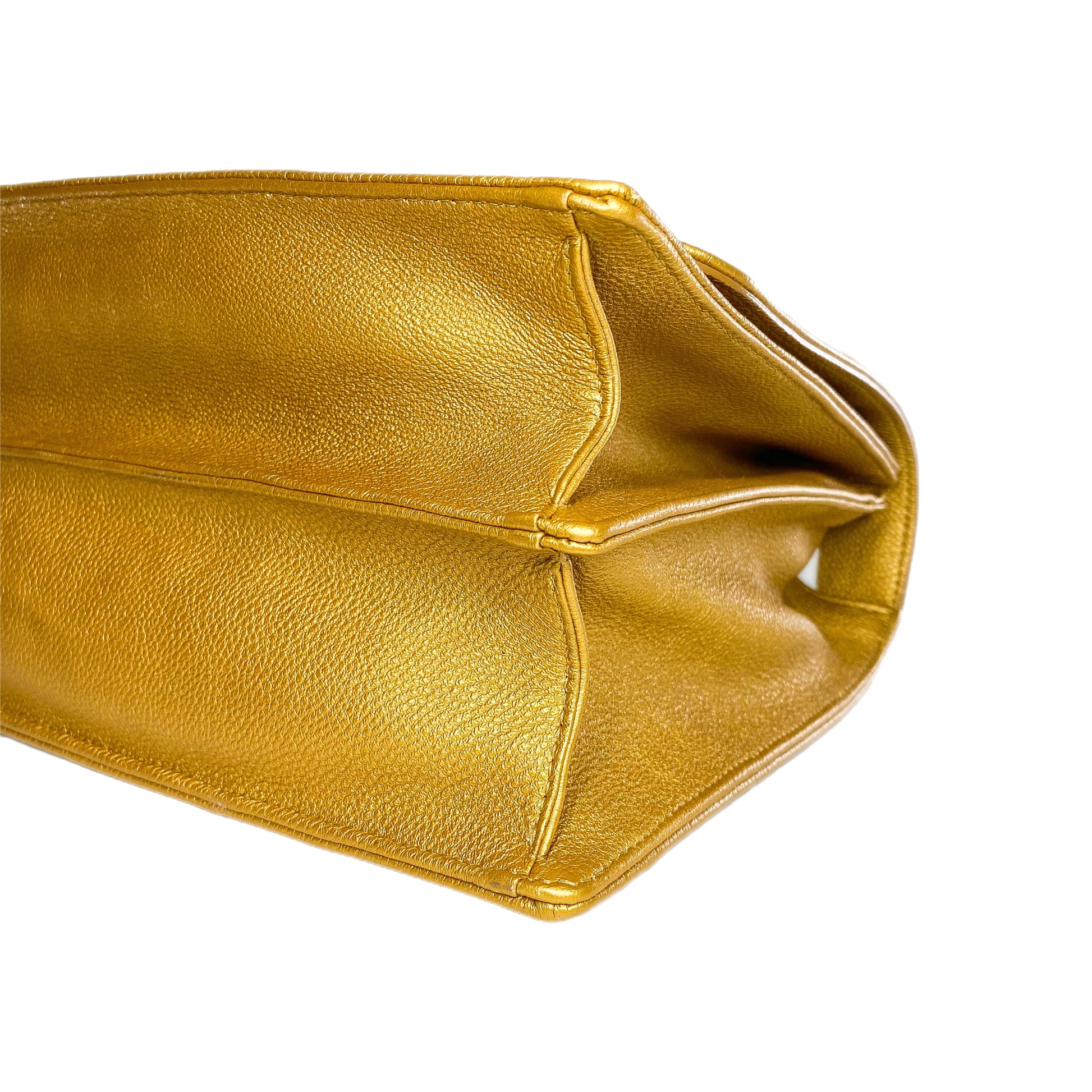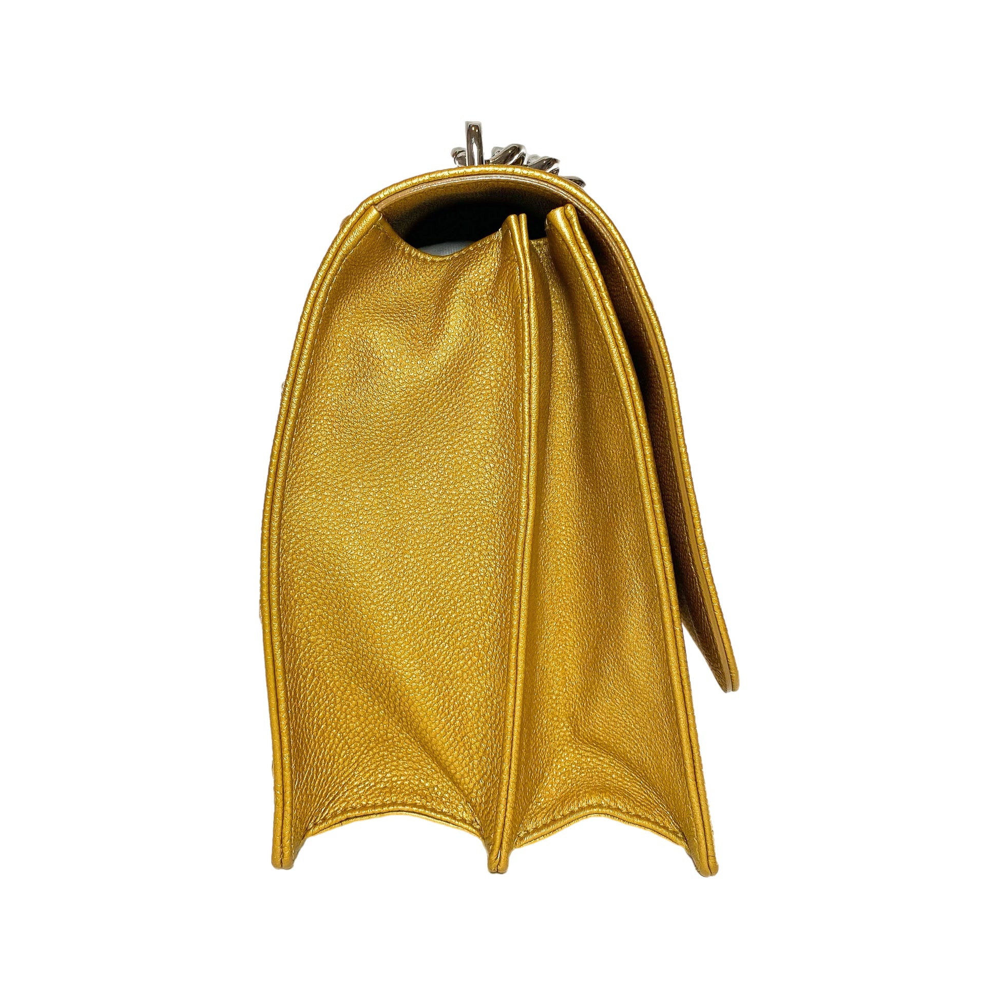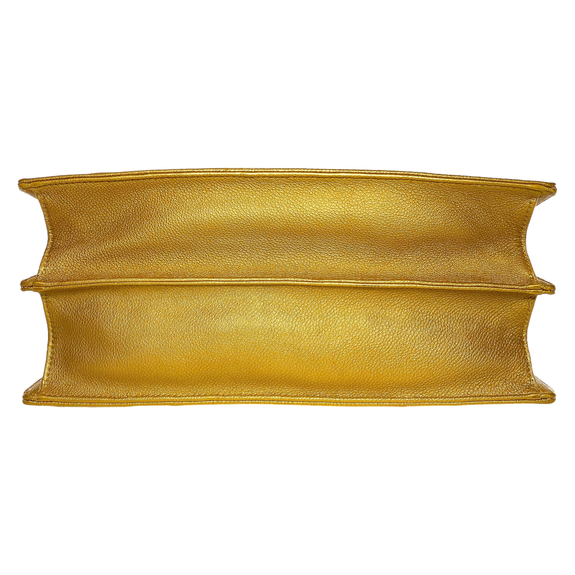 This is a Dior Gold Diorama in grained calfskin with silver hardware. This stylish handbag features a 4-inch chain top handle, a 20-inch detachable strap, and a press lock closure. The front flap opens to a partitioned black fabric lined interior that features three patch pockets and a zipper compartment. This is an amazing handbag for any occasion!