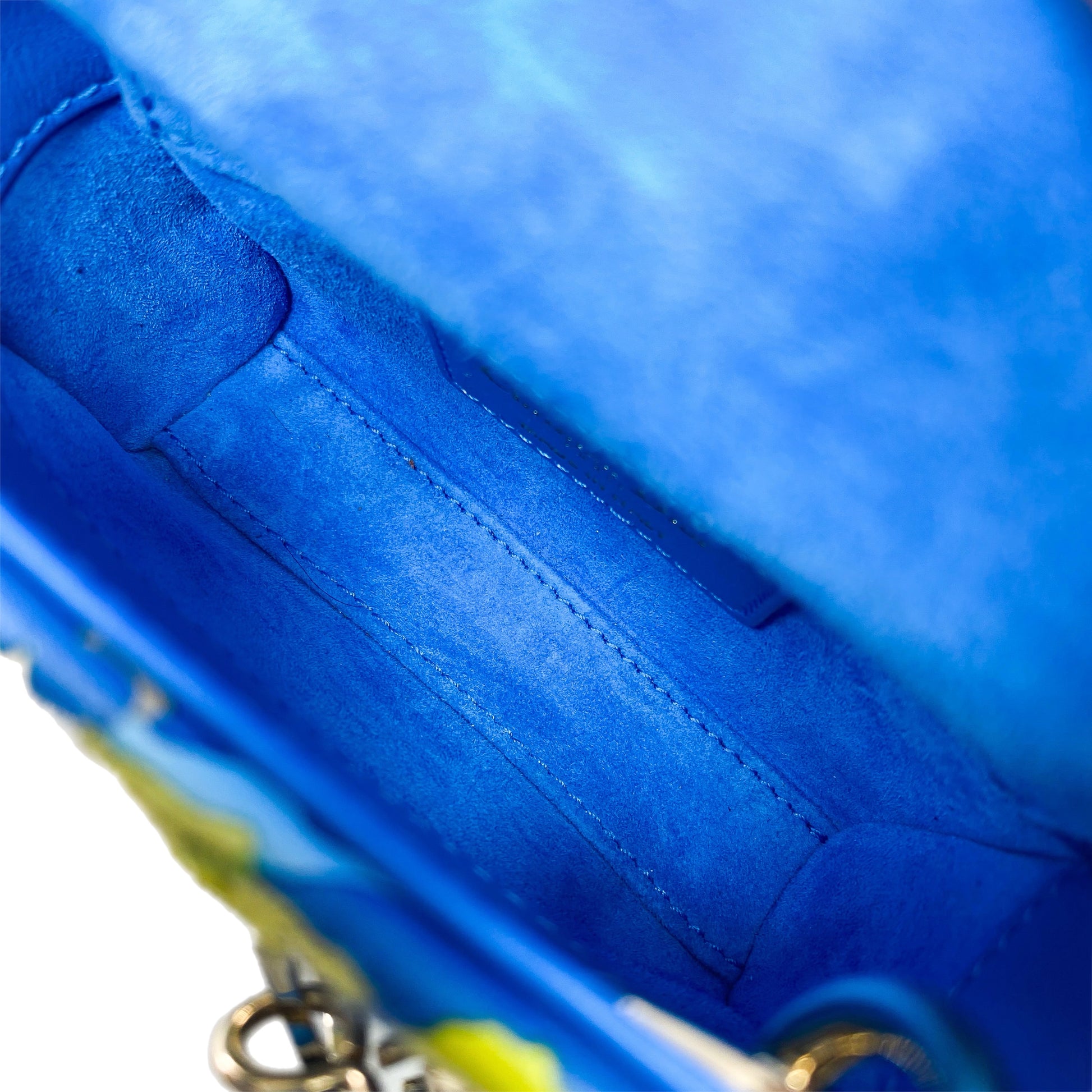 This is a Dior Multicolor Beaded Micro Lady Dior in sequin embellished leather with light gold hardware. This chic Micro Lady Dior features two 2-inch top handles, a 19-inch adjustable and detachable strap, “DIOR” hang charms, and a crossover flap closure. The interior is lined in blue suede. This is a stellar handbag for many occasions!