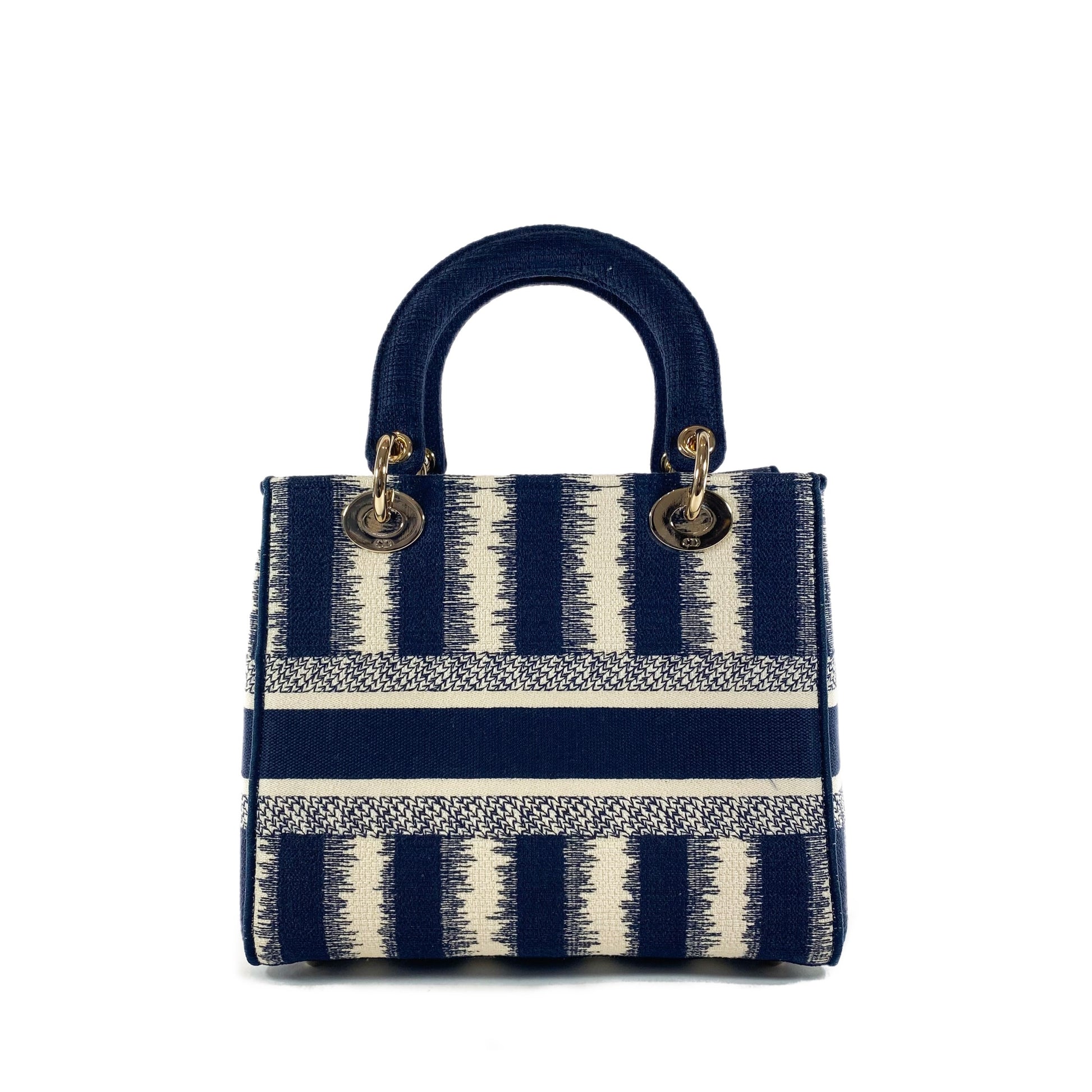 This is a new navy and ivory Dior Lady D-Lite striped canvas bag in size medium. Although it is very similar to the iconic leather Lady Dior bag, the Dior D-Lite is the embroidered version. Can be handheld or worn as a crossbody, comes with a removable and reversible strap.